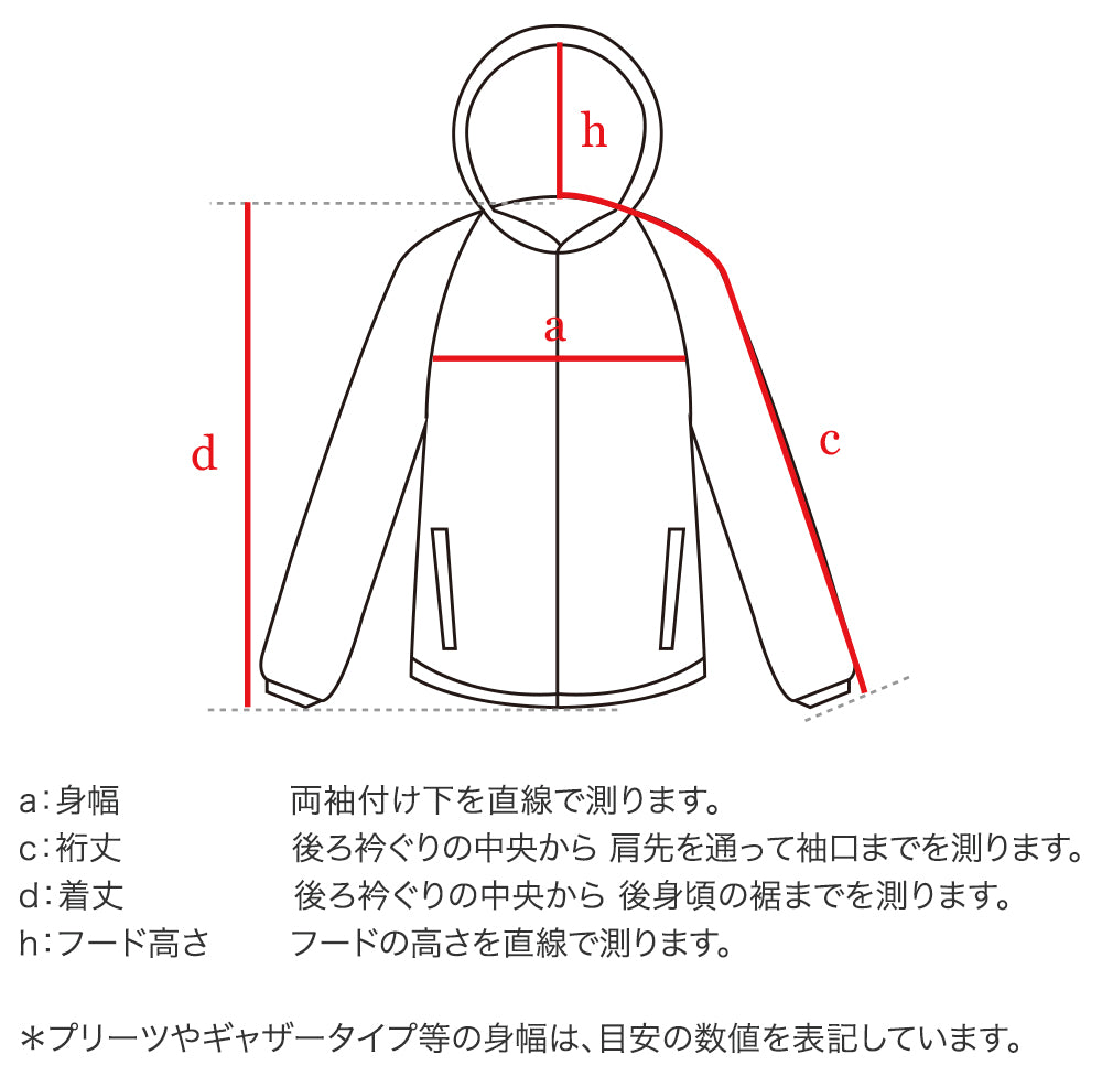| サイズ | 身幅 | 裄丈 | 着丈 | フードの高さ |