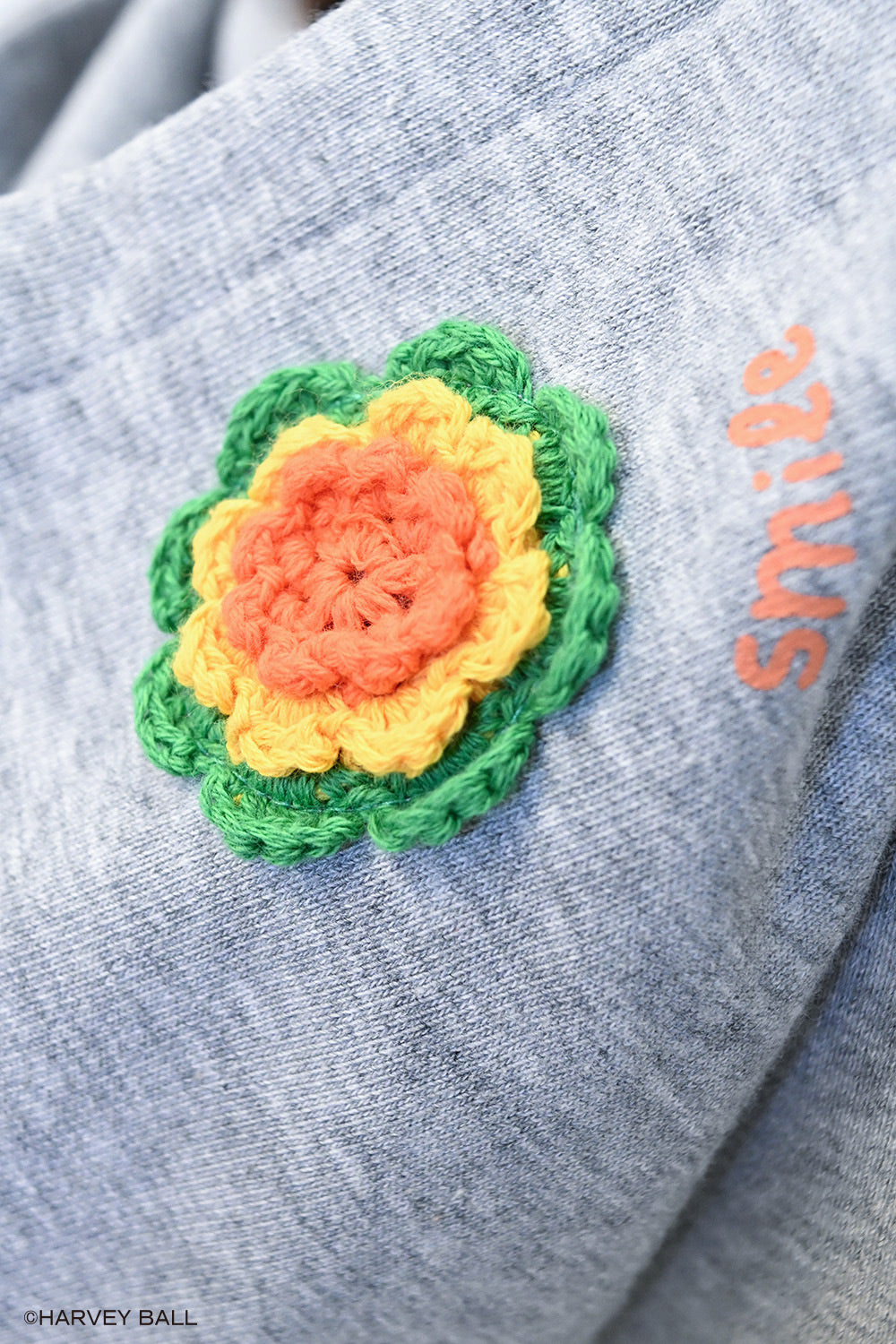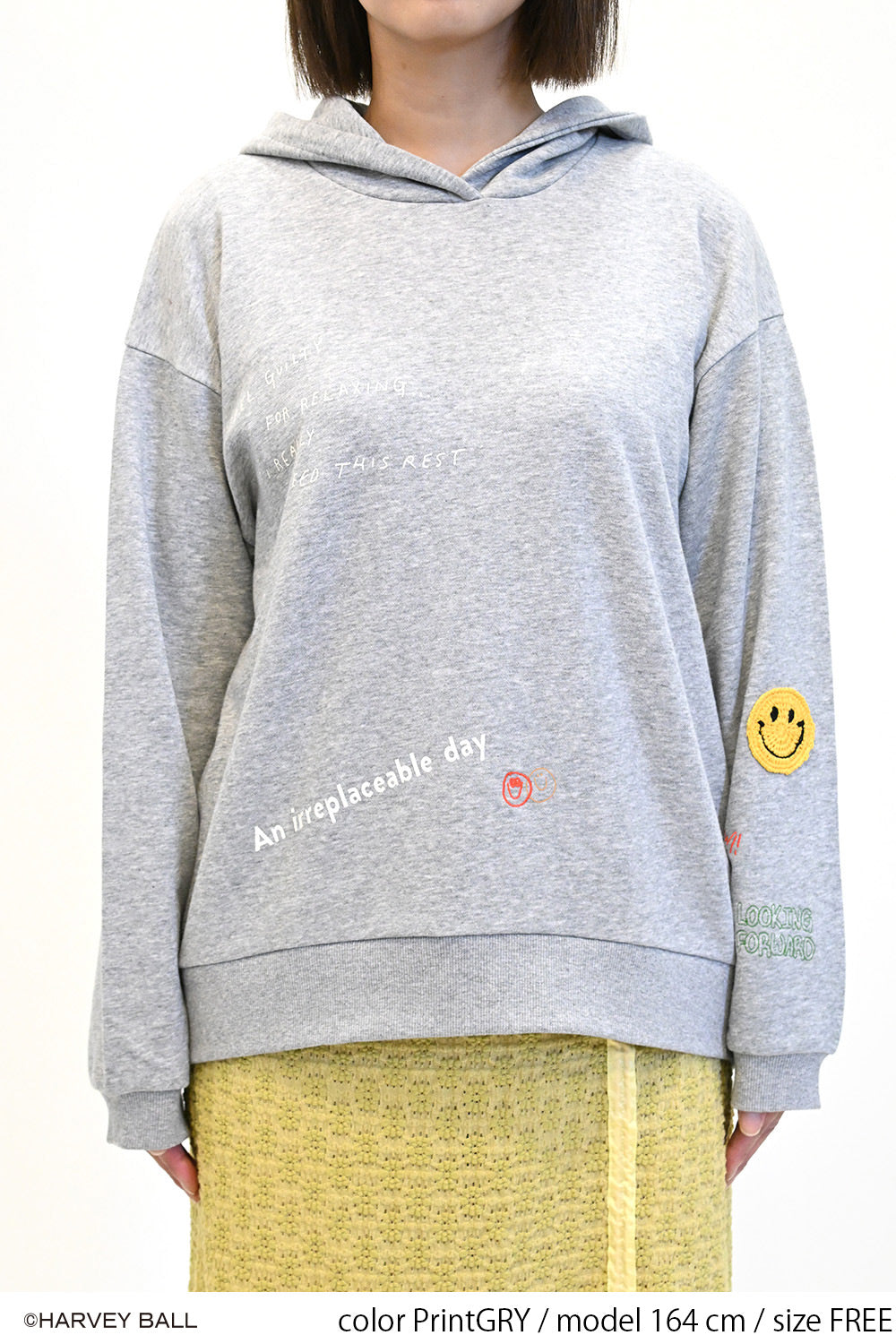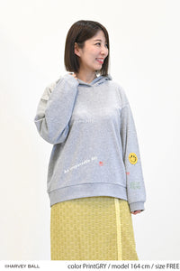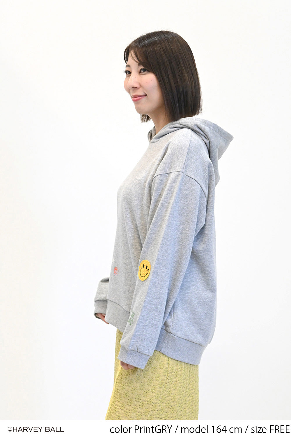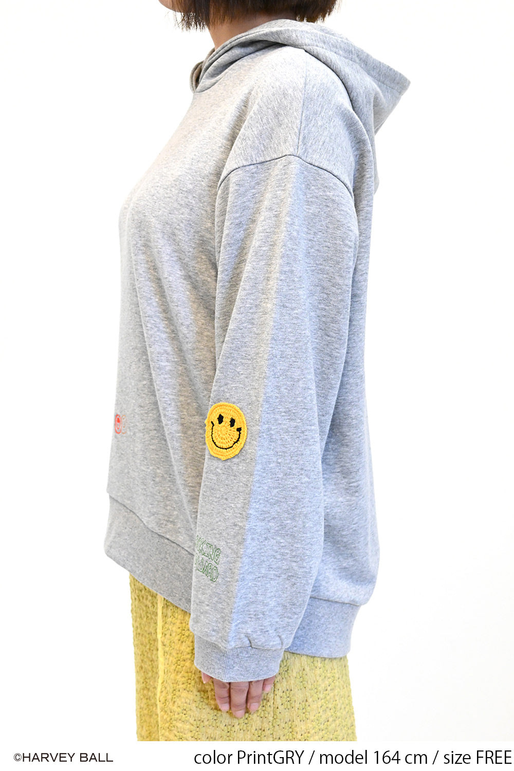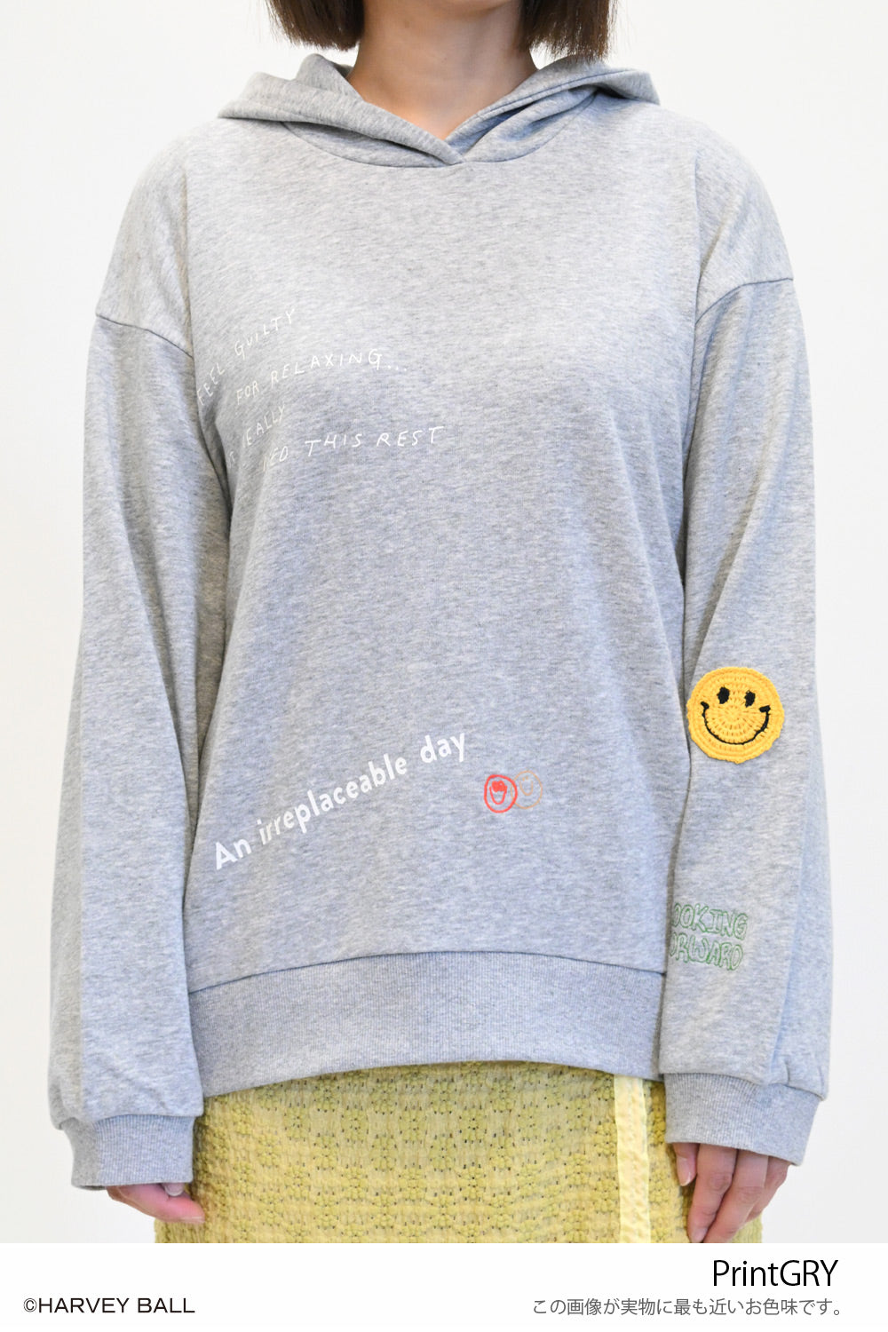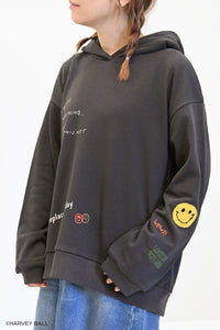 袖口のスマイルワッペンやフードのお花ワッペン、さらに刺繍やロゴをあしらった、遊び心たっぷりのデザインパーカー。