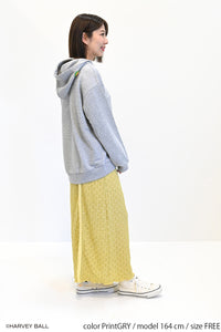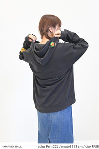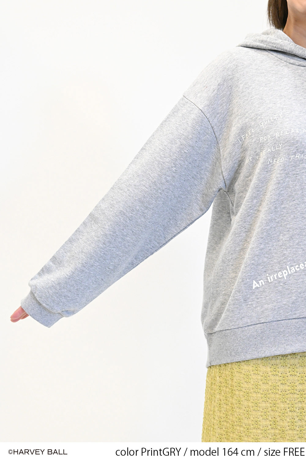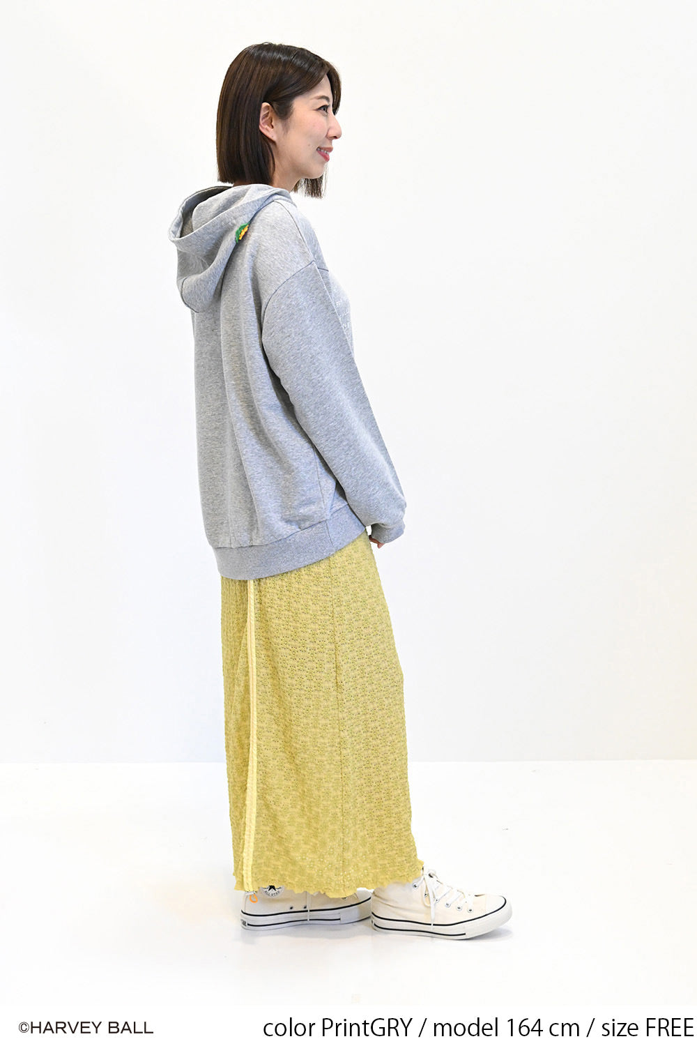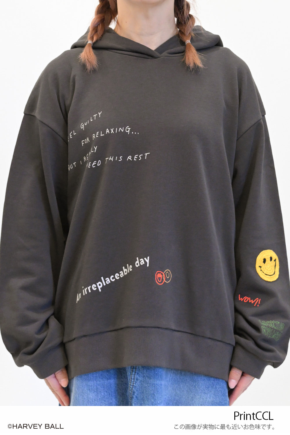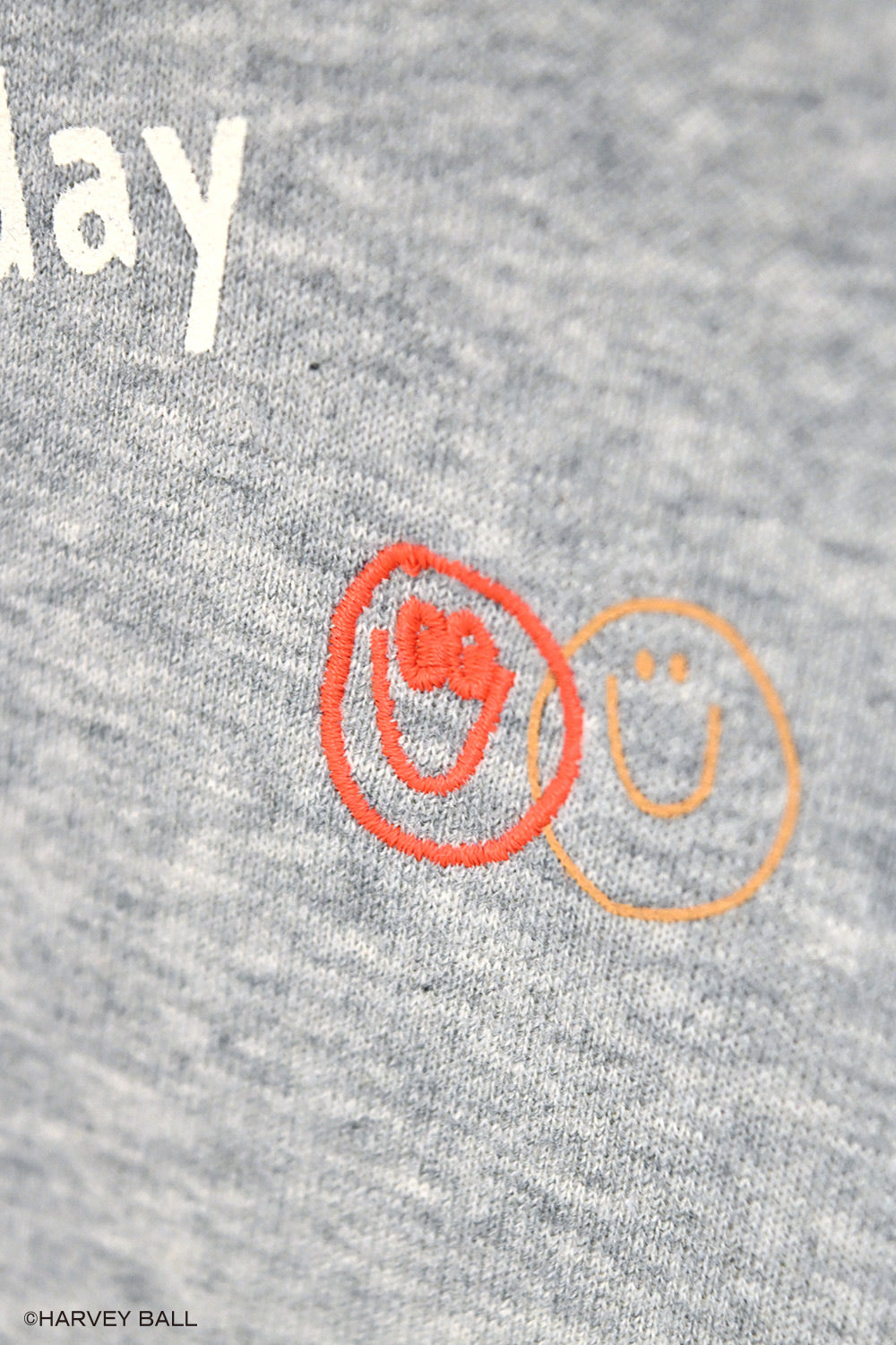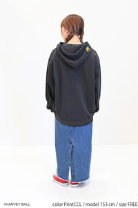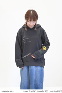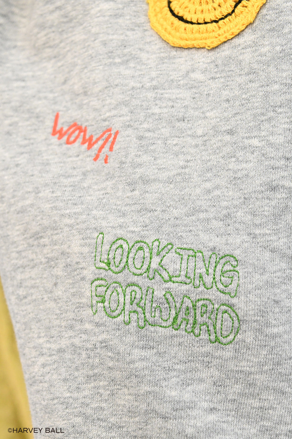 袖口のスマイルワッペンやフードのお花ワッペン、さらに刺繍やロゴをあしらった、遊び心たっぷりのデザインパーカー。