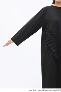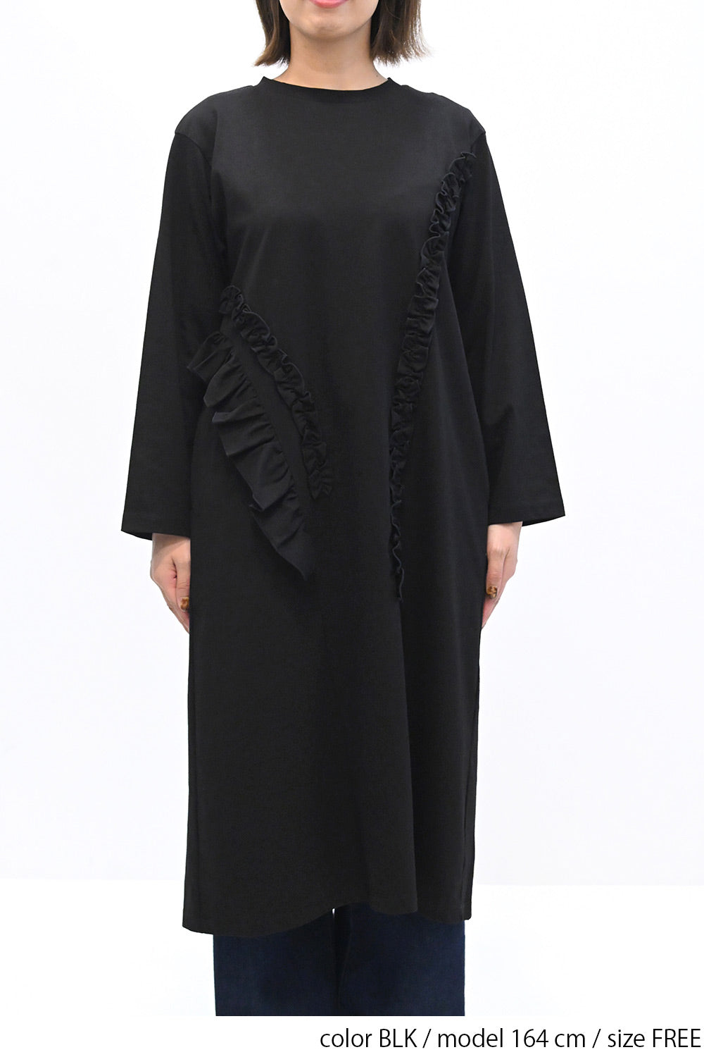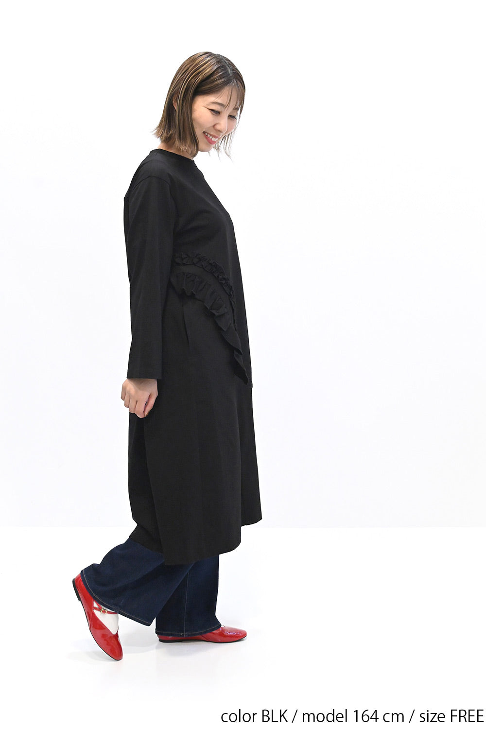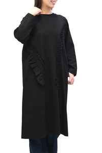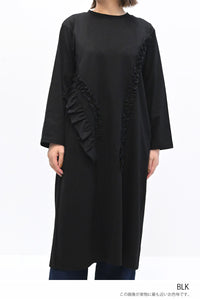 柔らかいカットソー素材を使用し、リラックス感のある着心地ながらも、アシンメトリーに施されたフリルデザインがスタイリッシュな印象をプラス。