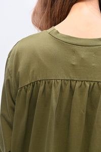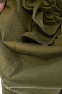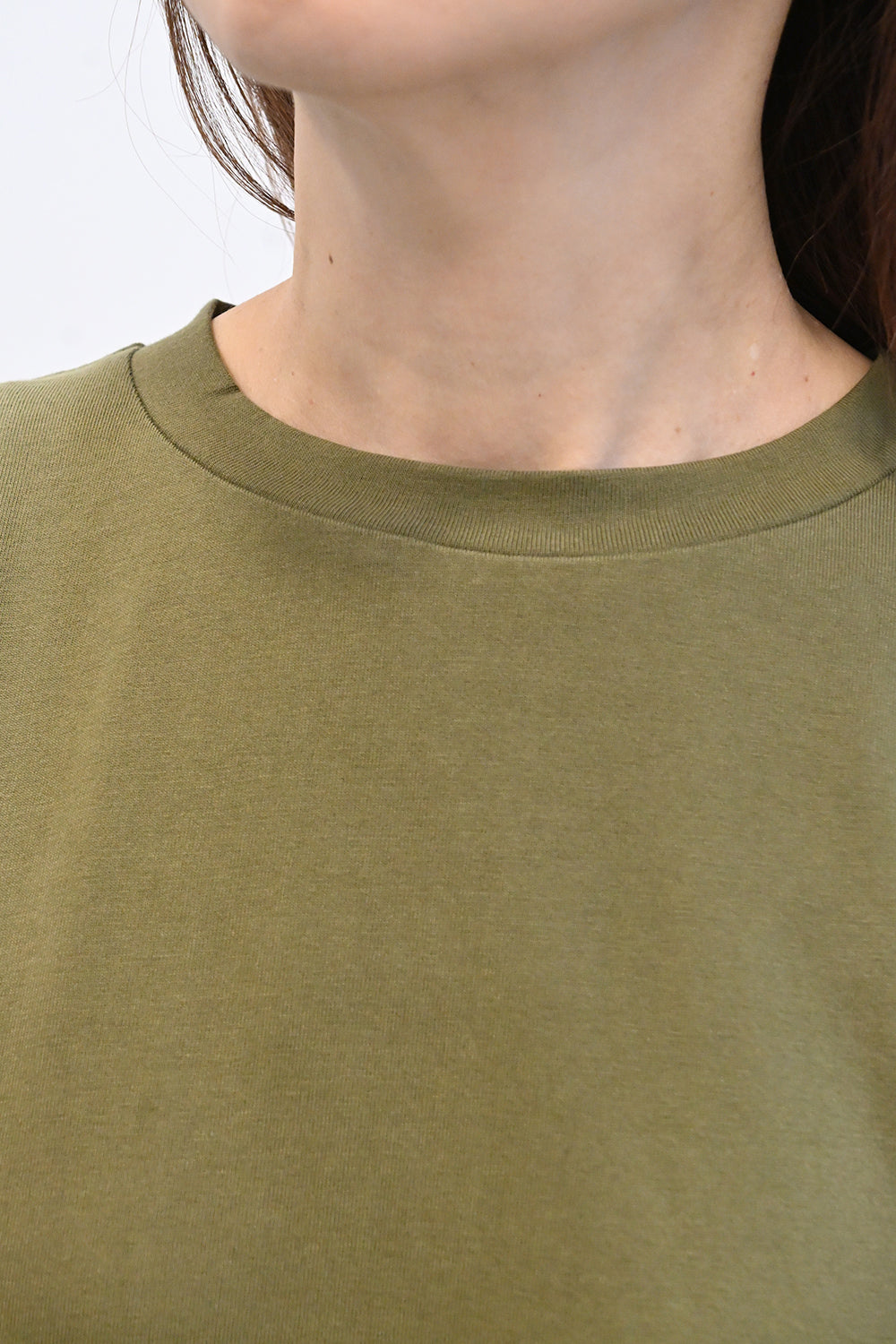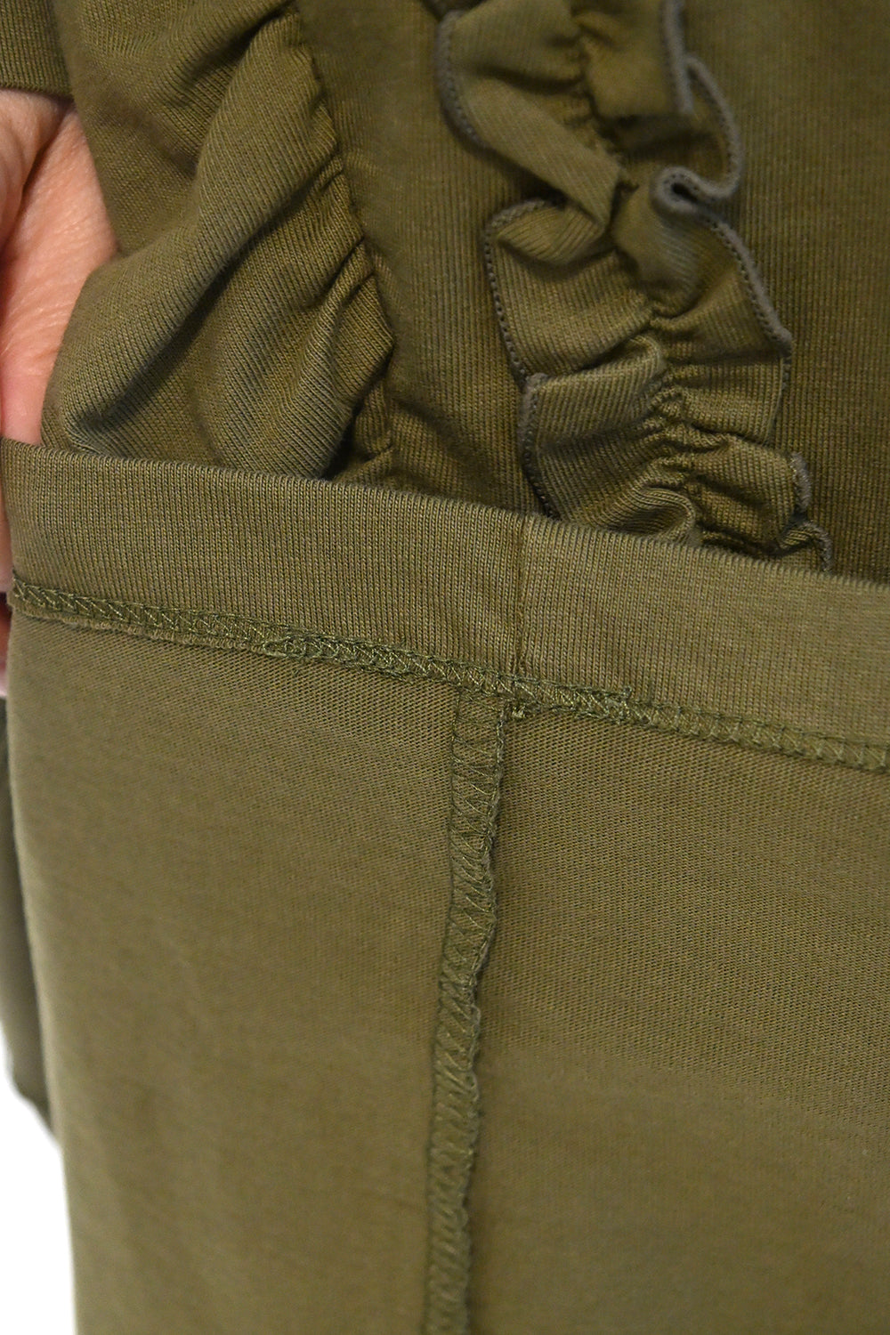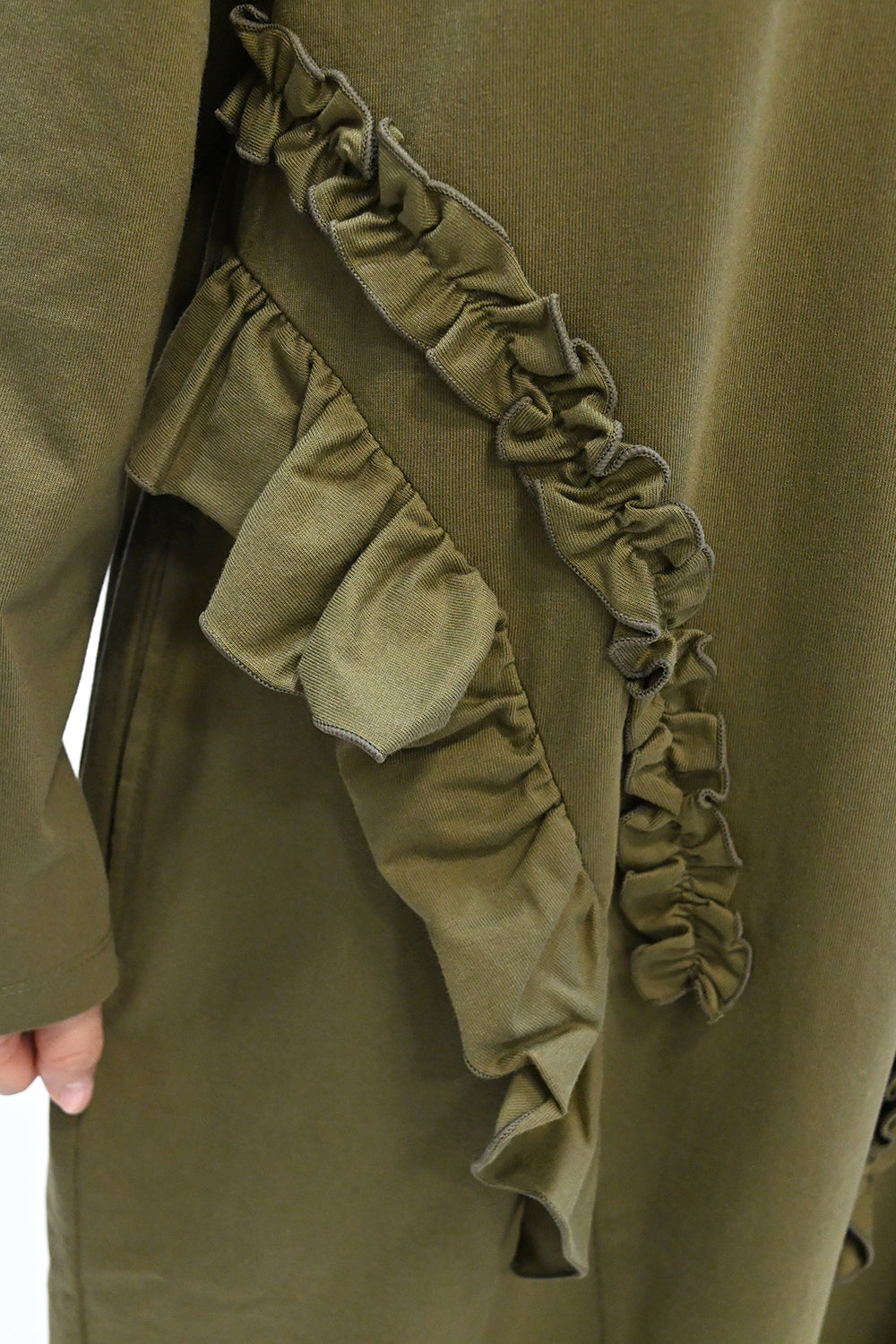 柔らかいカットソー素材を使用し、リラックス感のある着心地ながらも、アシンメトリーに施されたフリルデザインがスタイリッシュな印象をプラス。