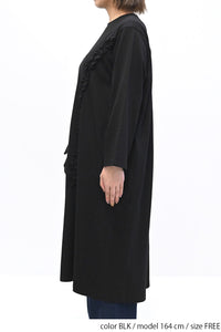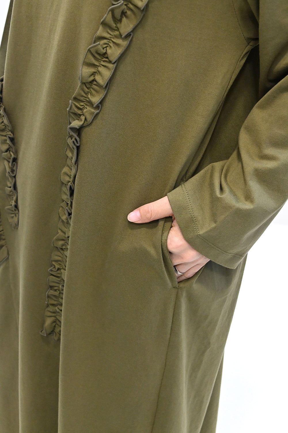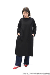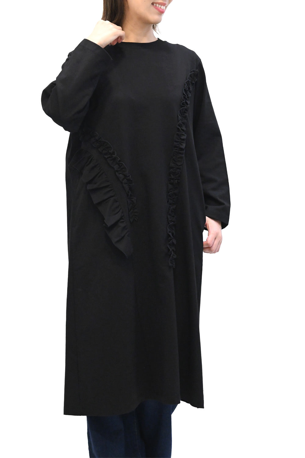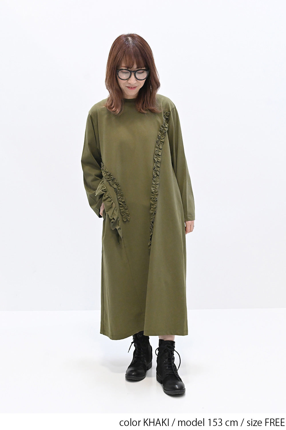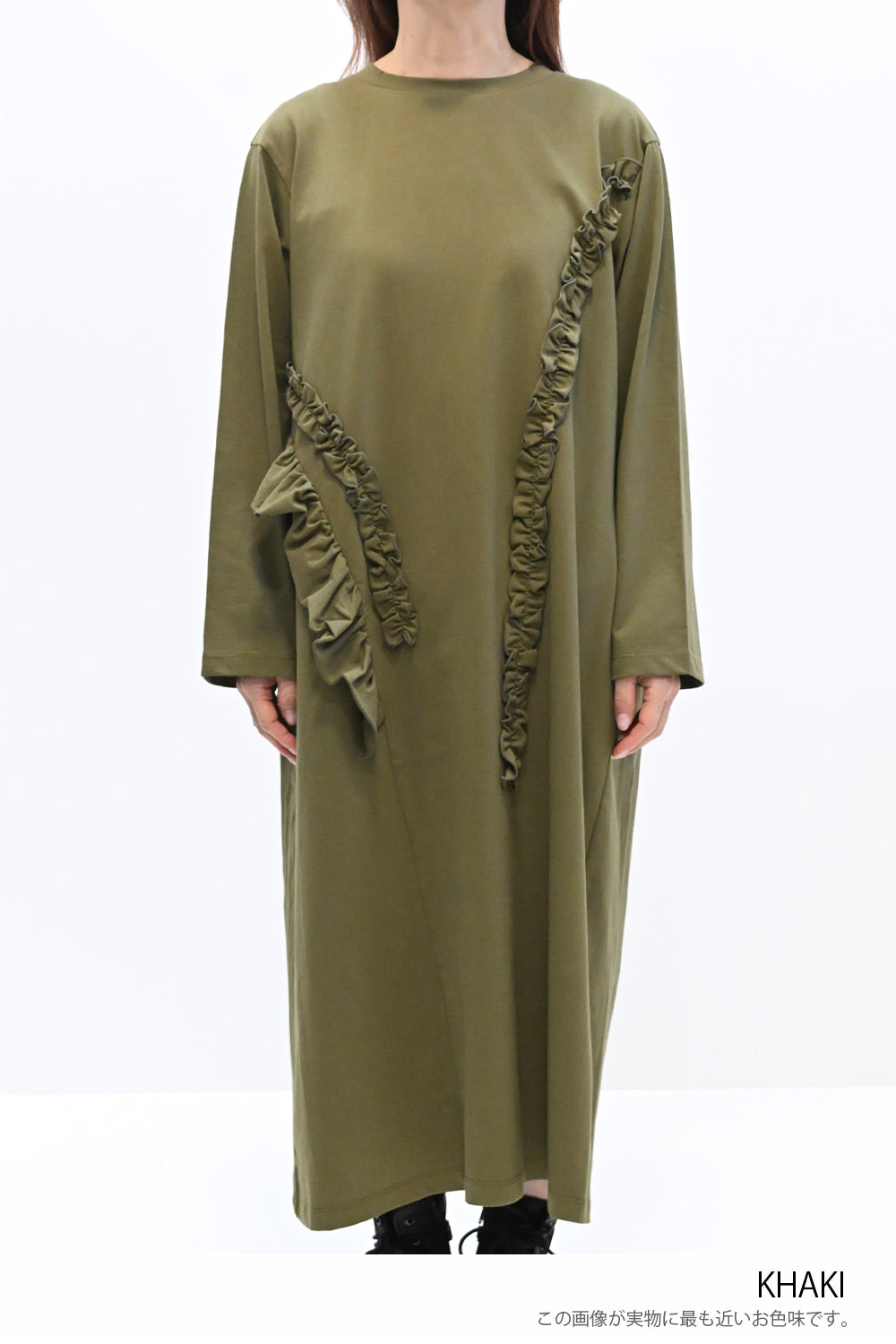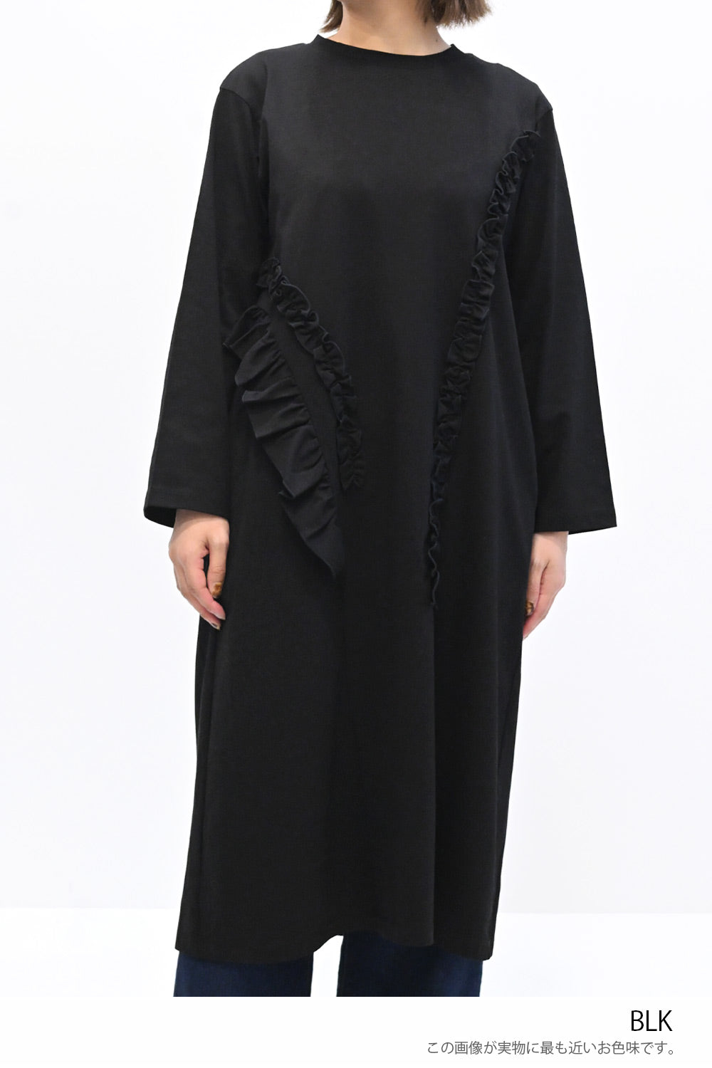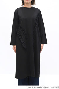 フリルをたたきつけたシンプルながらデザイン性の高いワンピース。