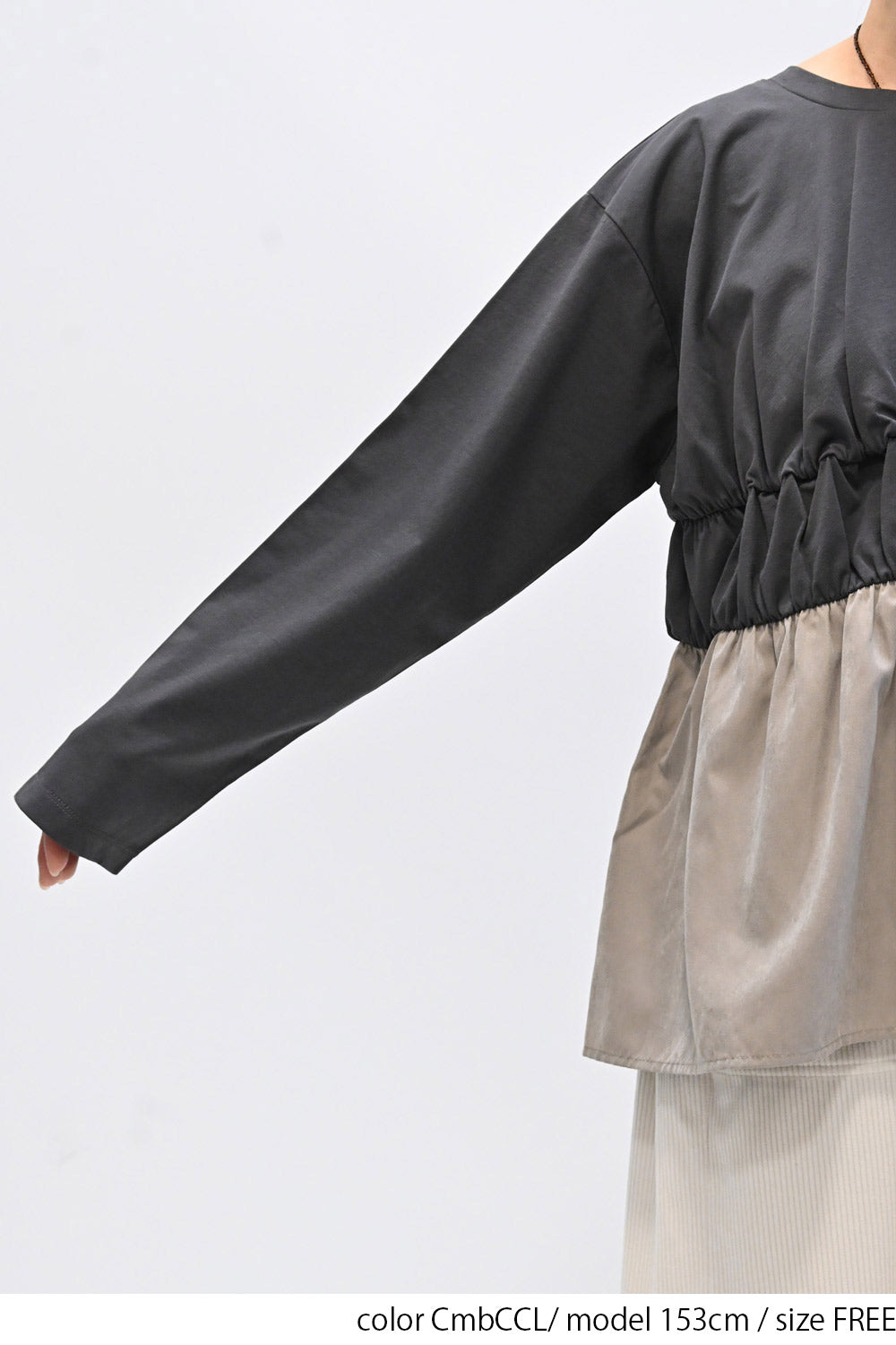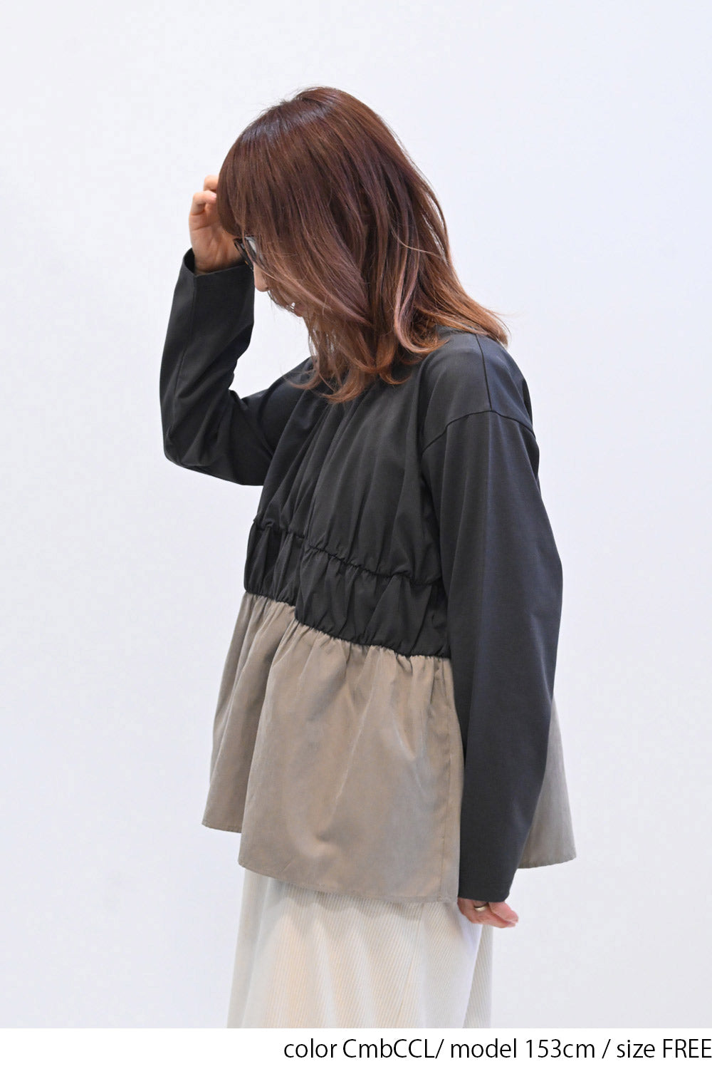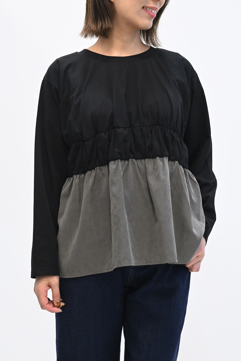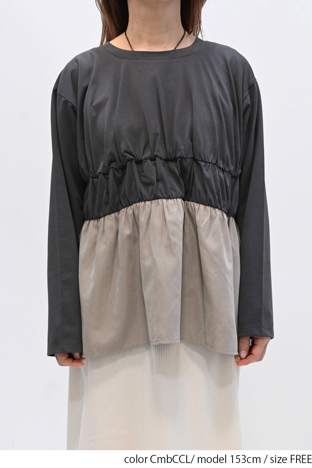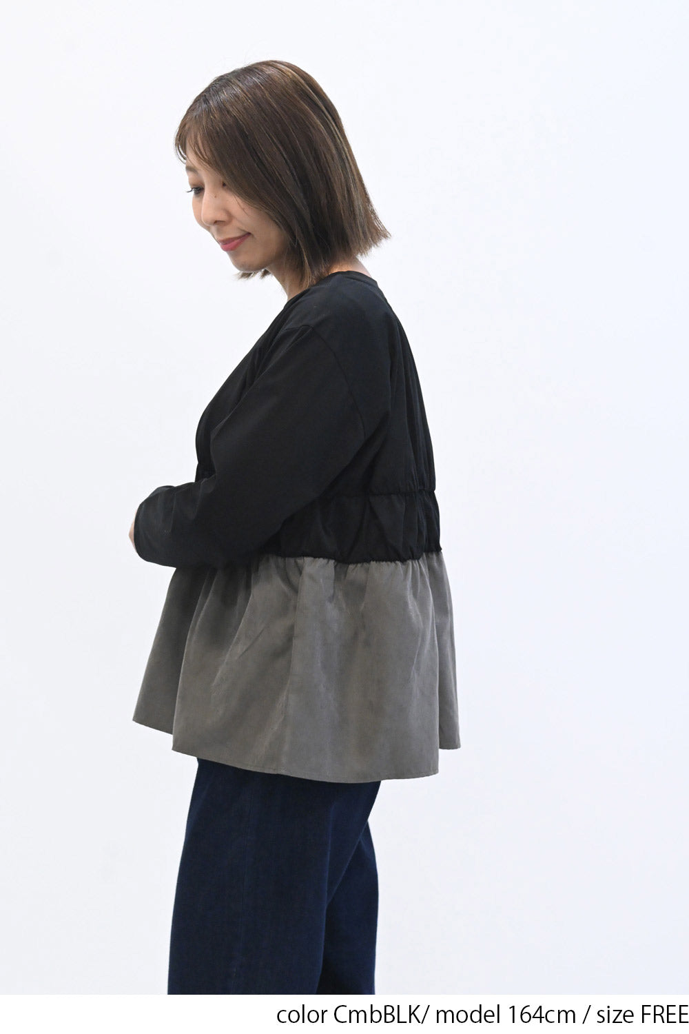 スエード調の布帛を切り替えたギャザープルオーバー。