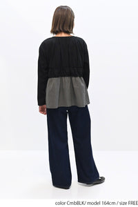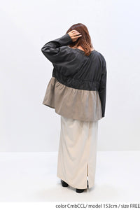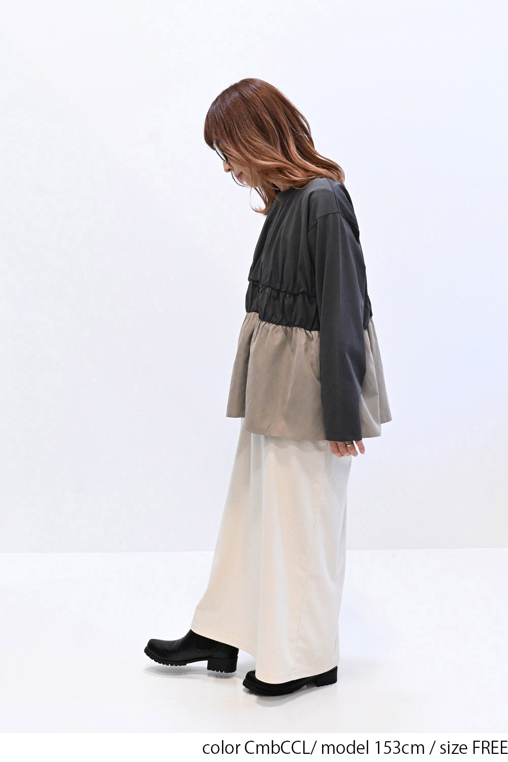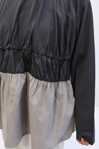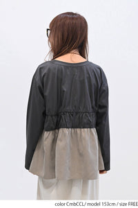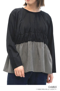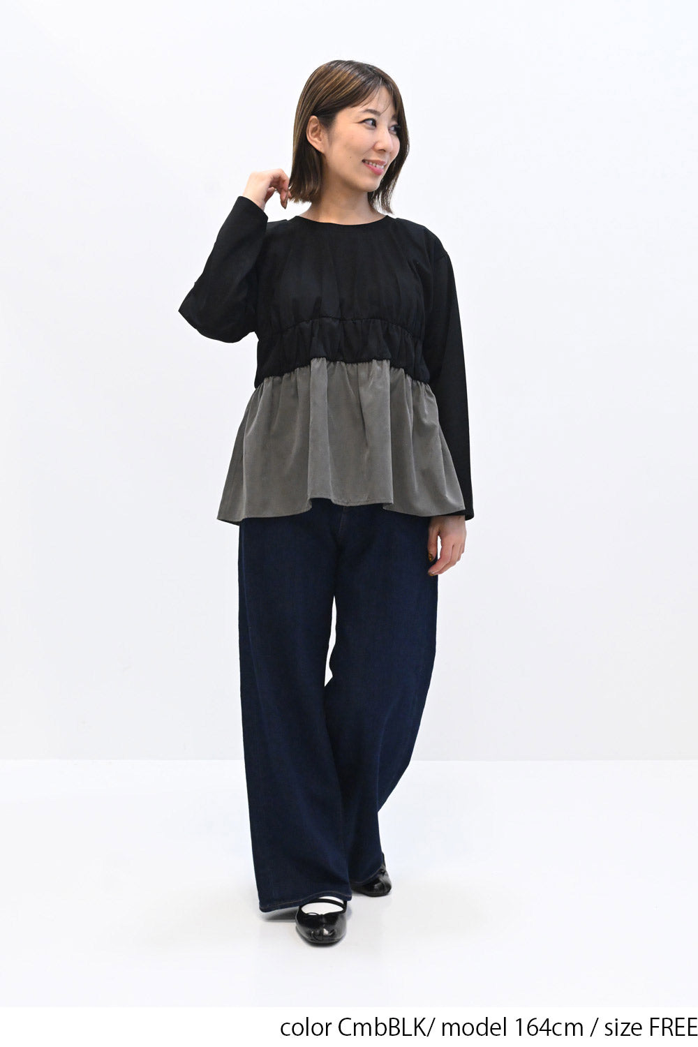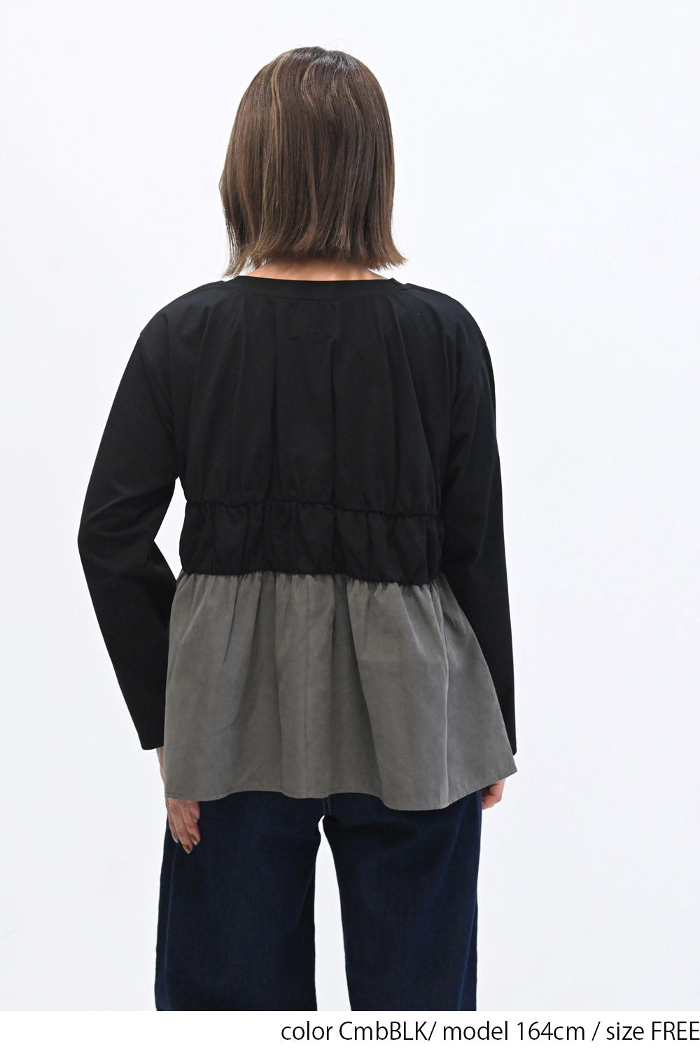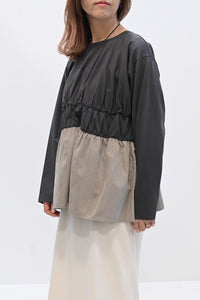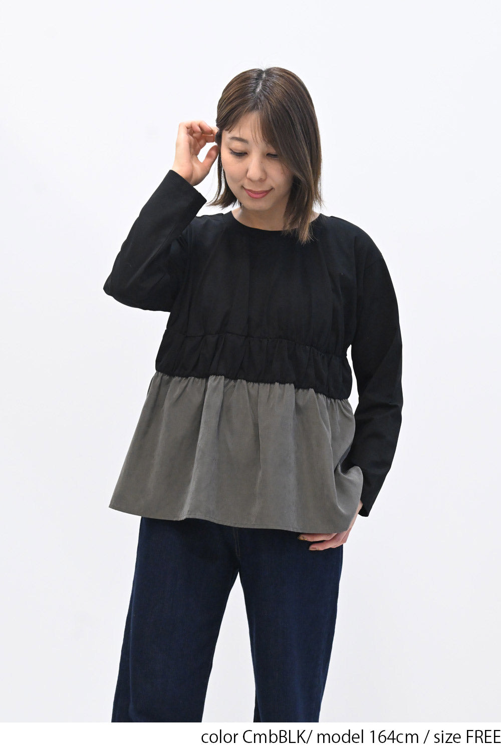 スエード調の布帛を切り替えたギャザープルオーバー。