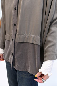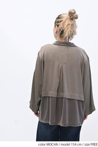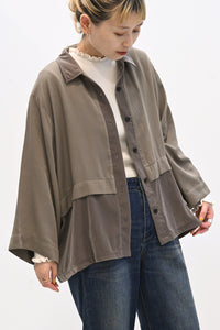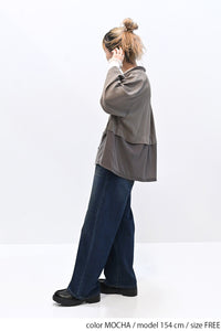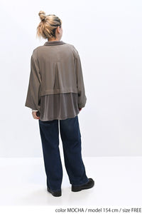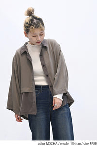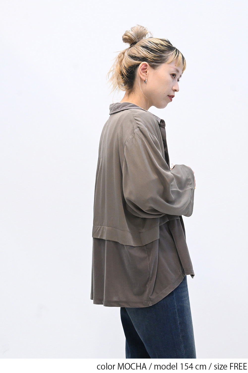 ボタンを留めてブラウスとして着るのはもちろん、Tシャツやタートルニットの上から羽織れば、軽いアウター感覚でも楽しめます。