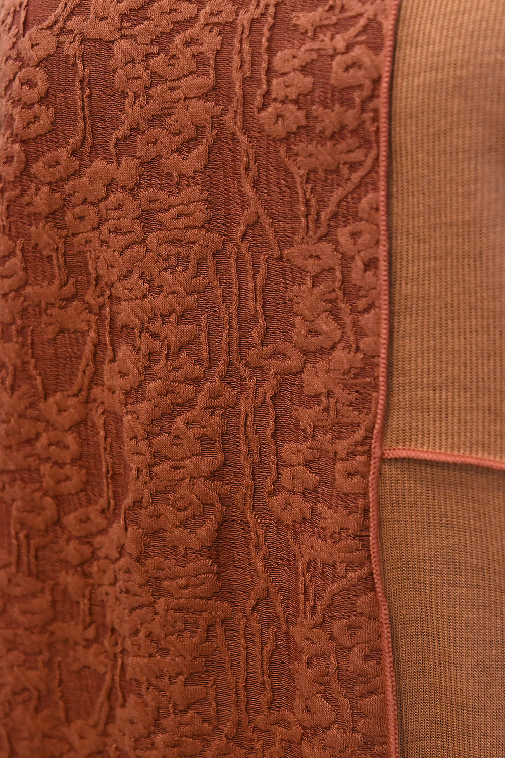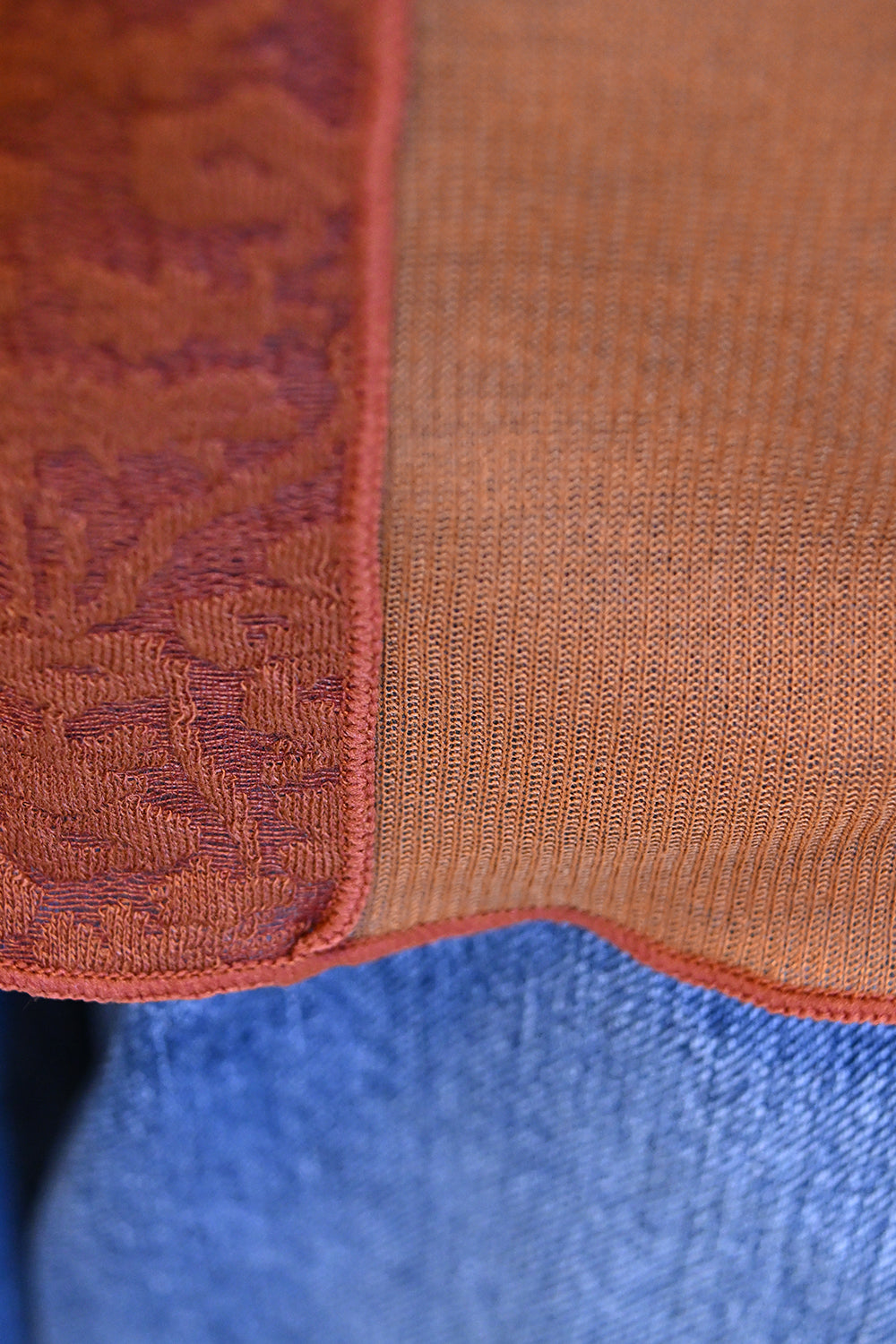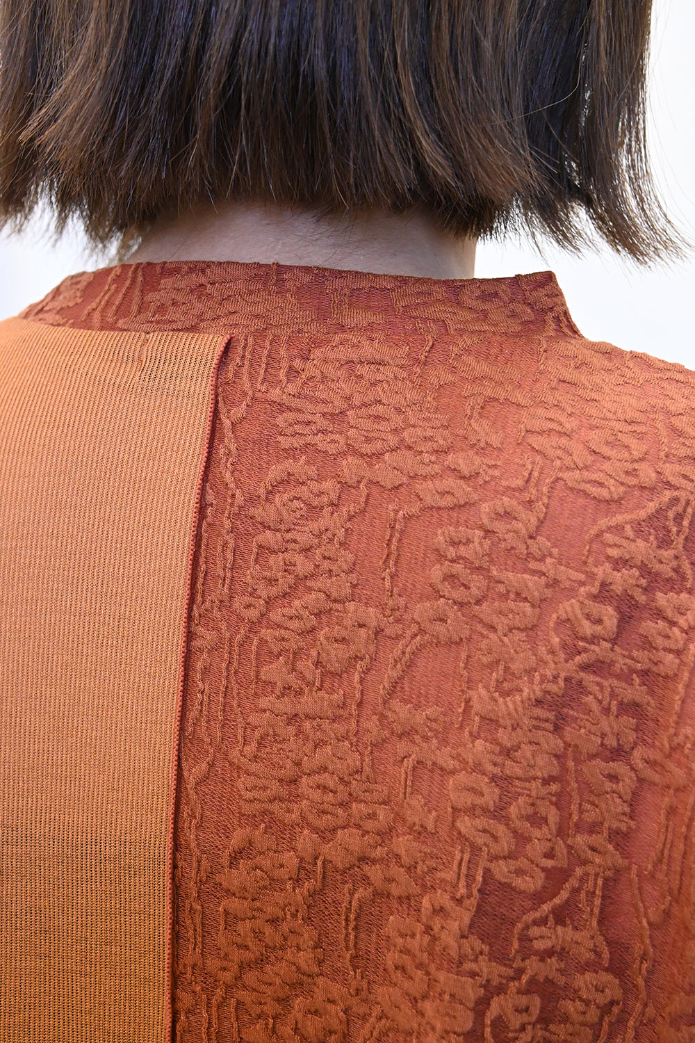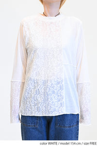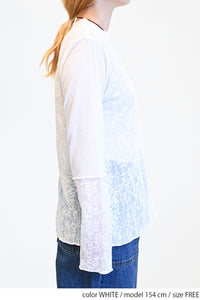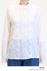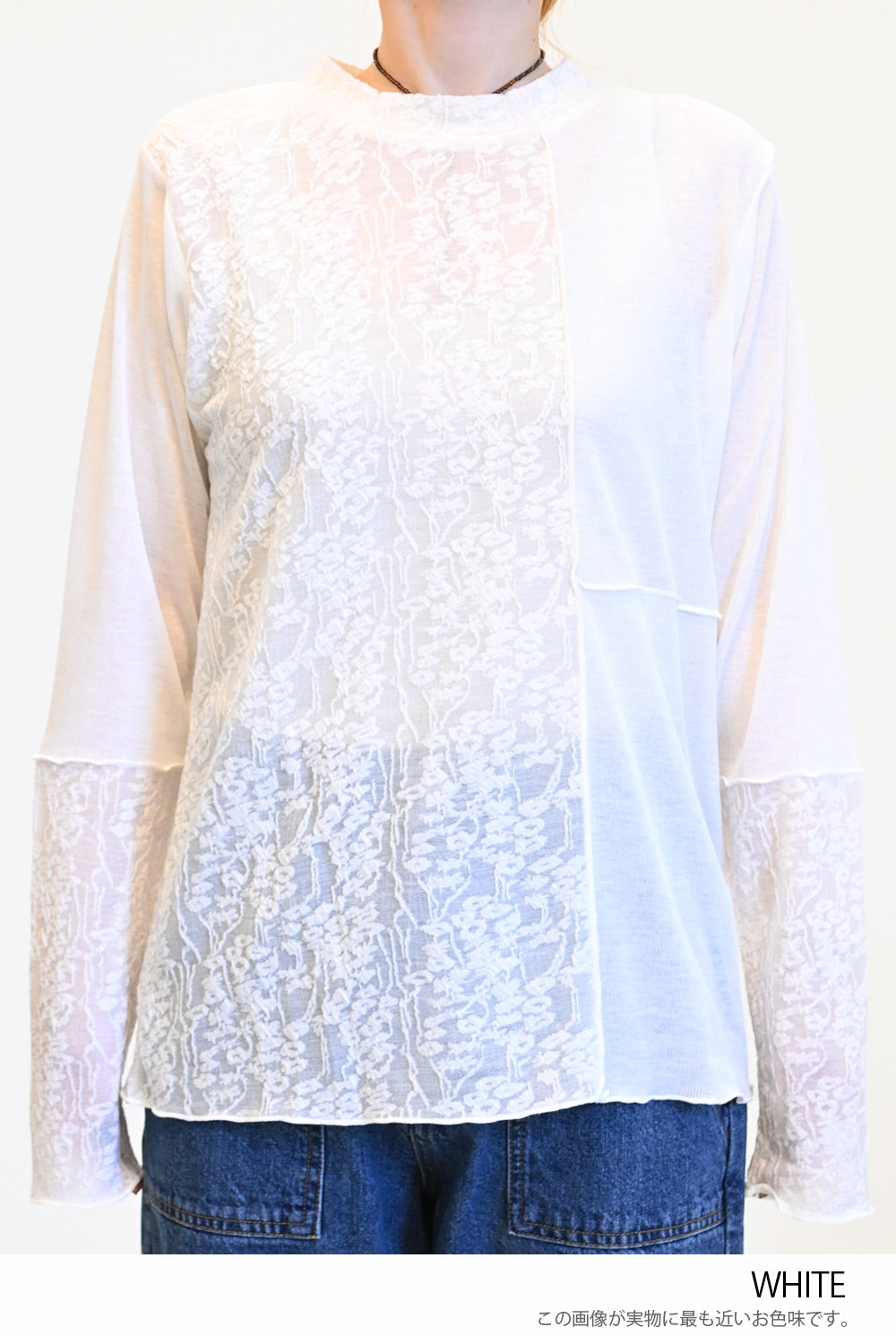 右側にはエレガントな総レース。左側にはエアリーなシアーテレコ生地を大胆にパッチワーク。
