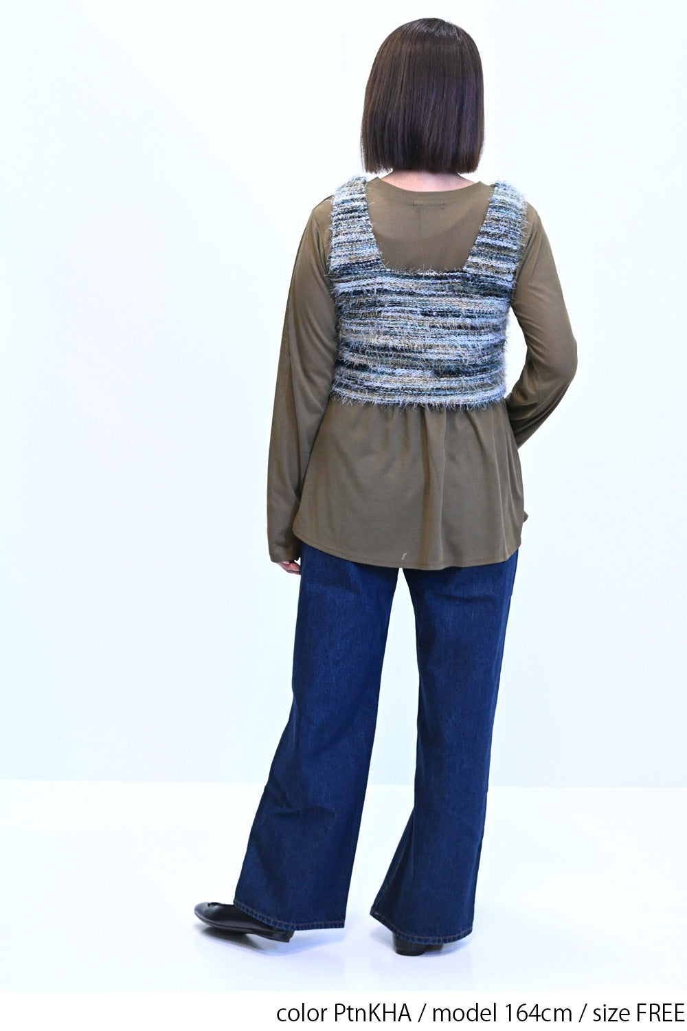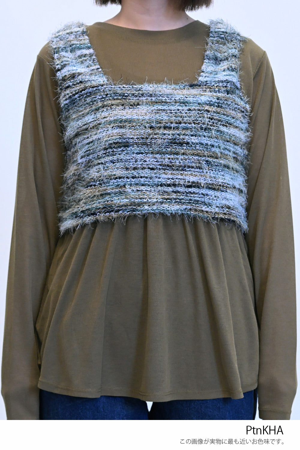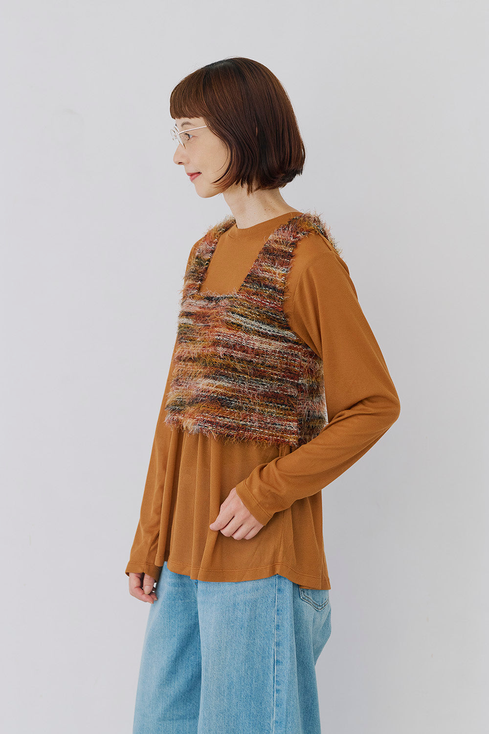 立体感のあるシャギーニットのビスチェと、着回し力抜群なシンプルな長袖Tシャツの組み合わせ。