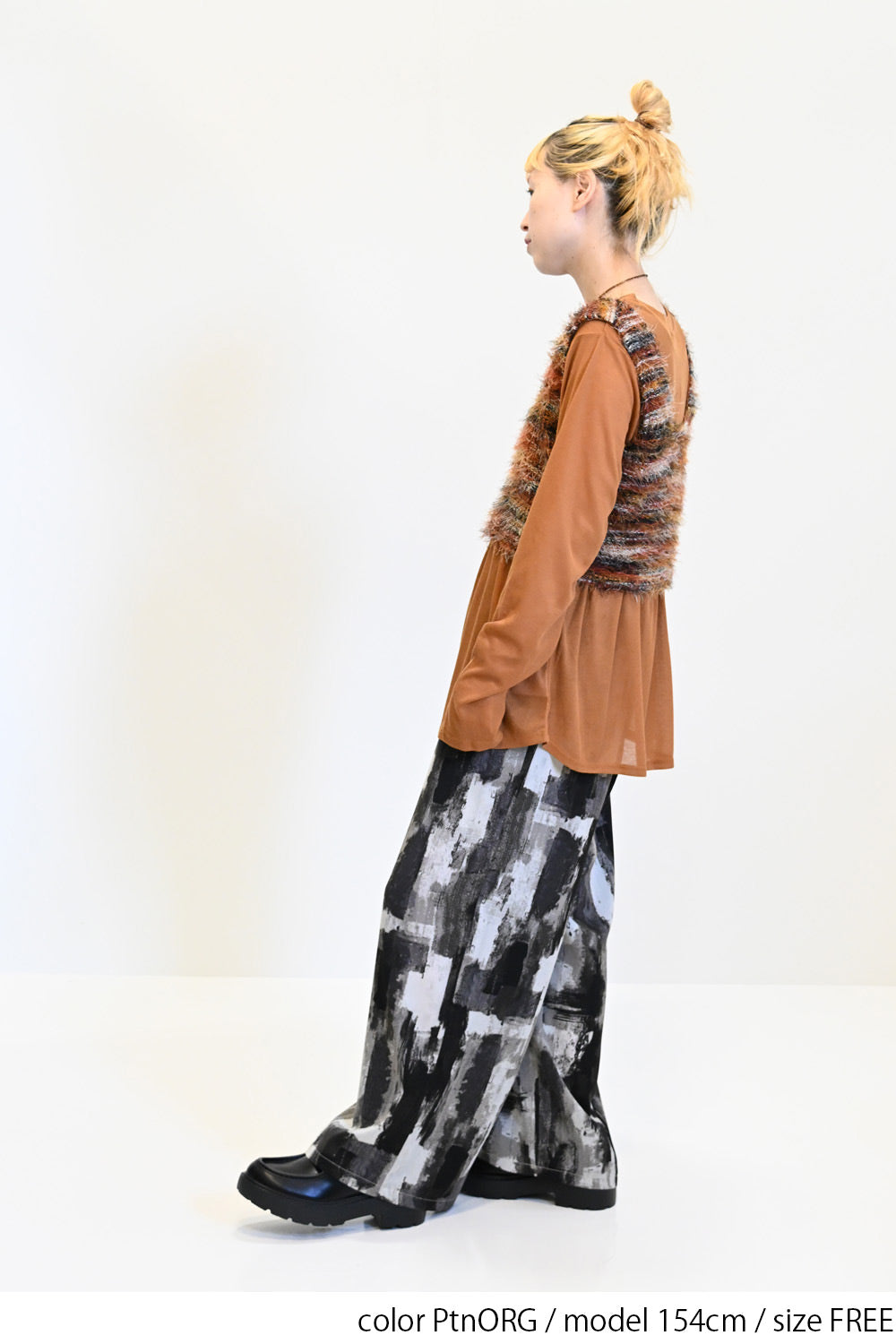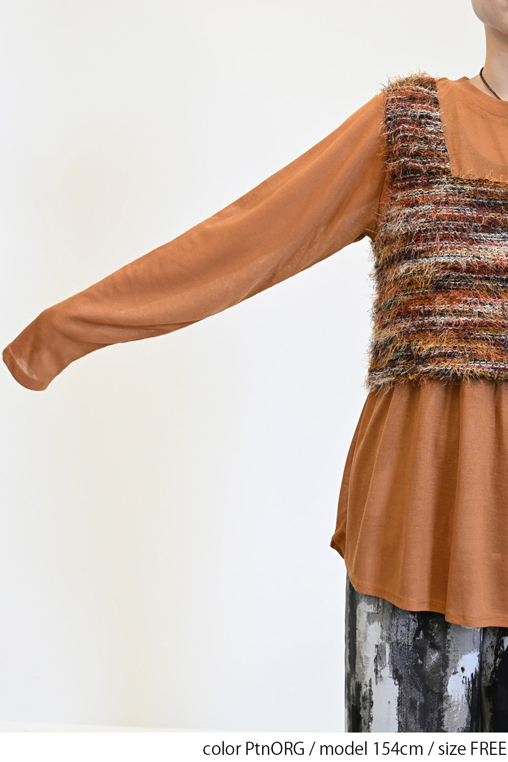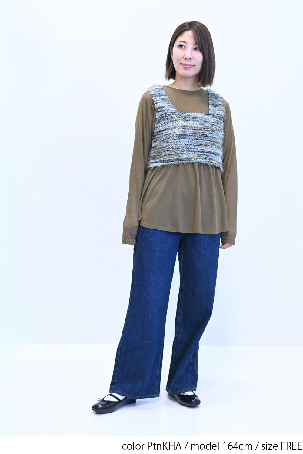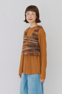 立体感のあるシャギーニットのビスチェと、着回し力抜群なシンプルな長袖Tシャツの組み合わせ。