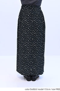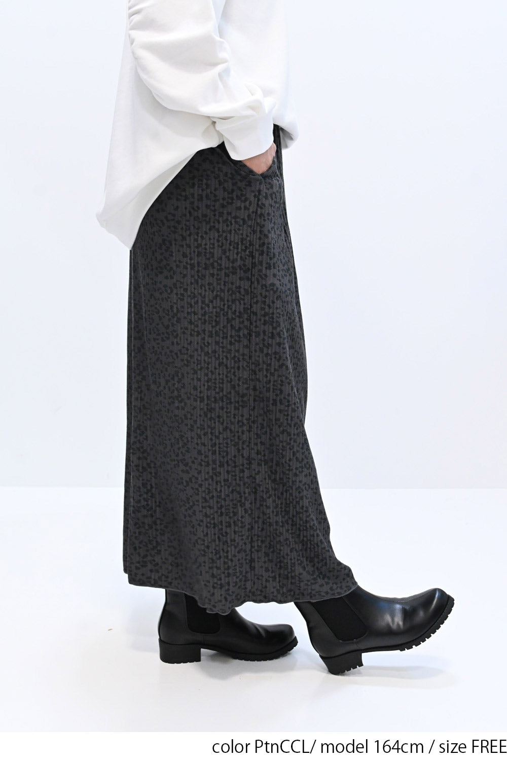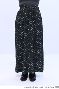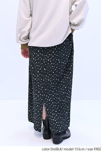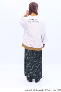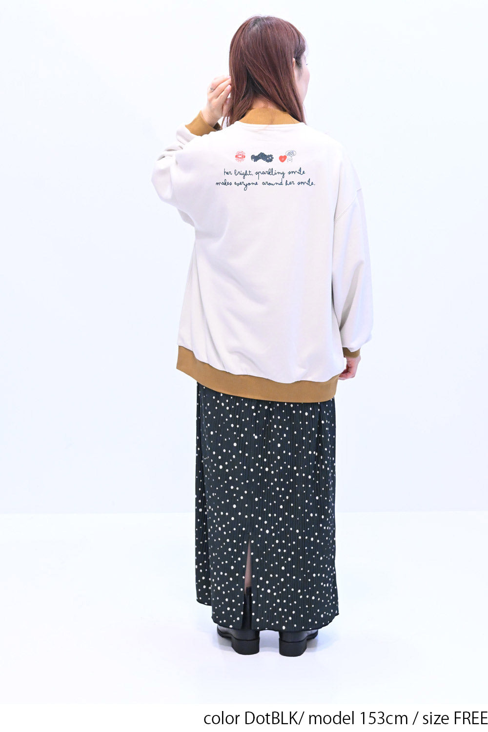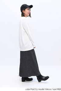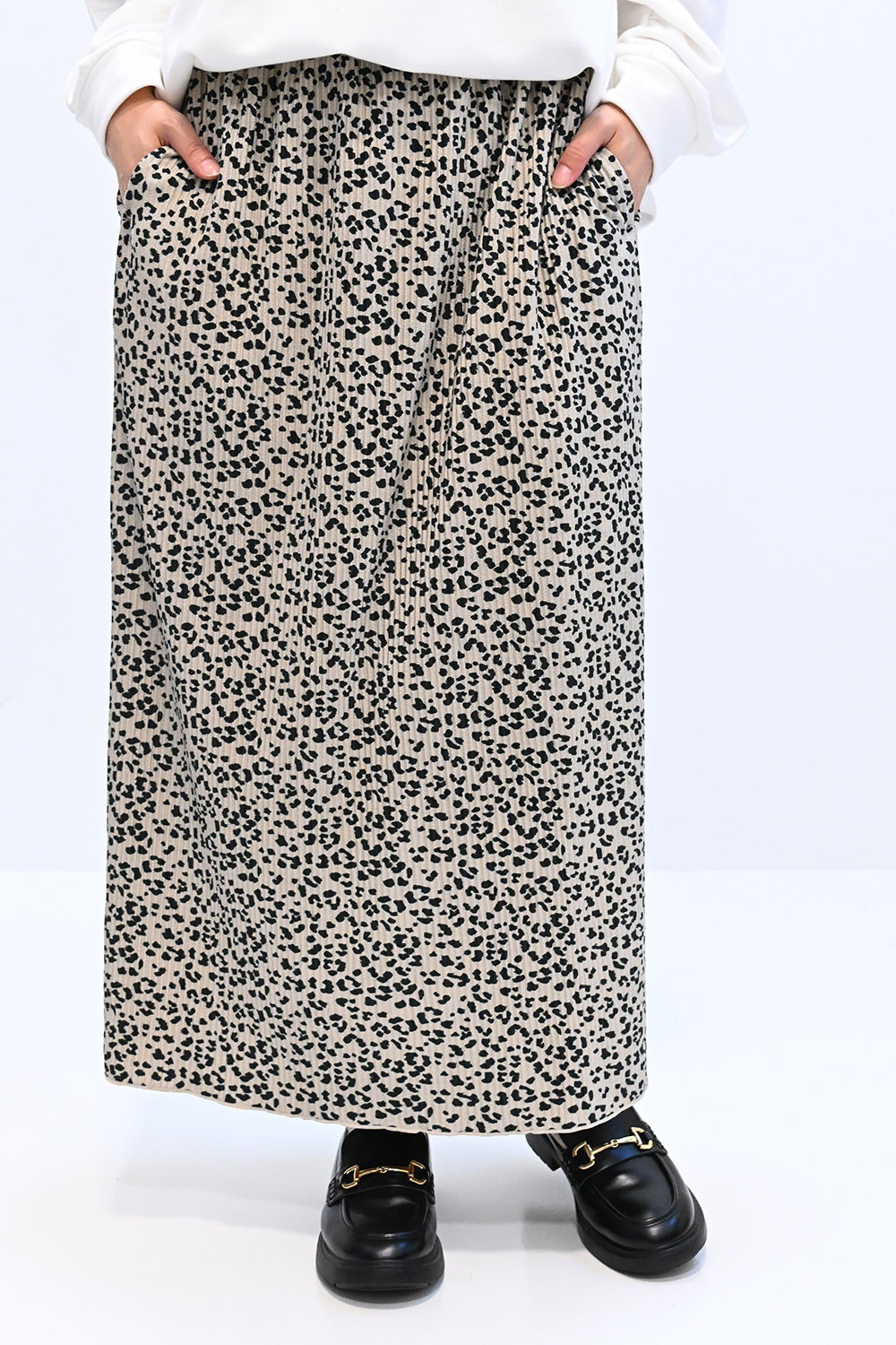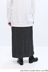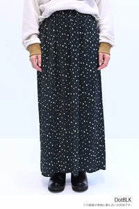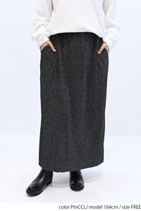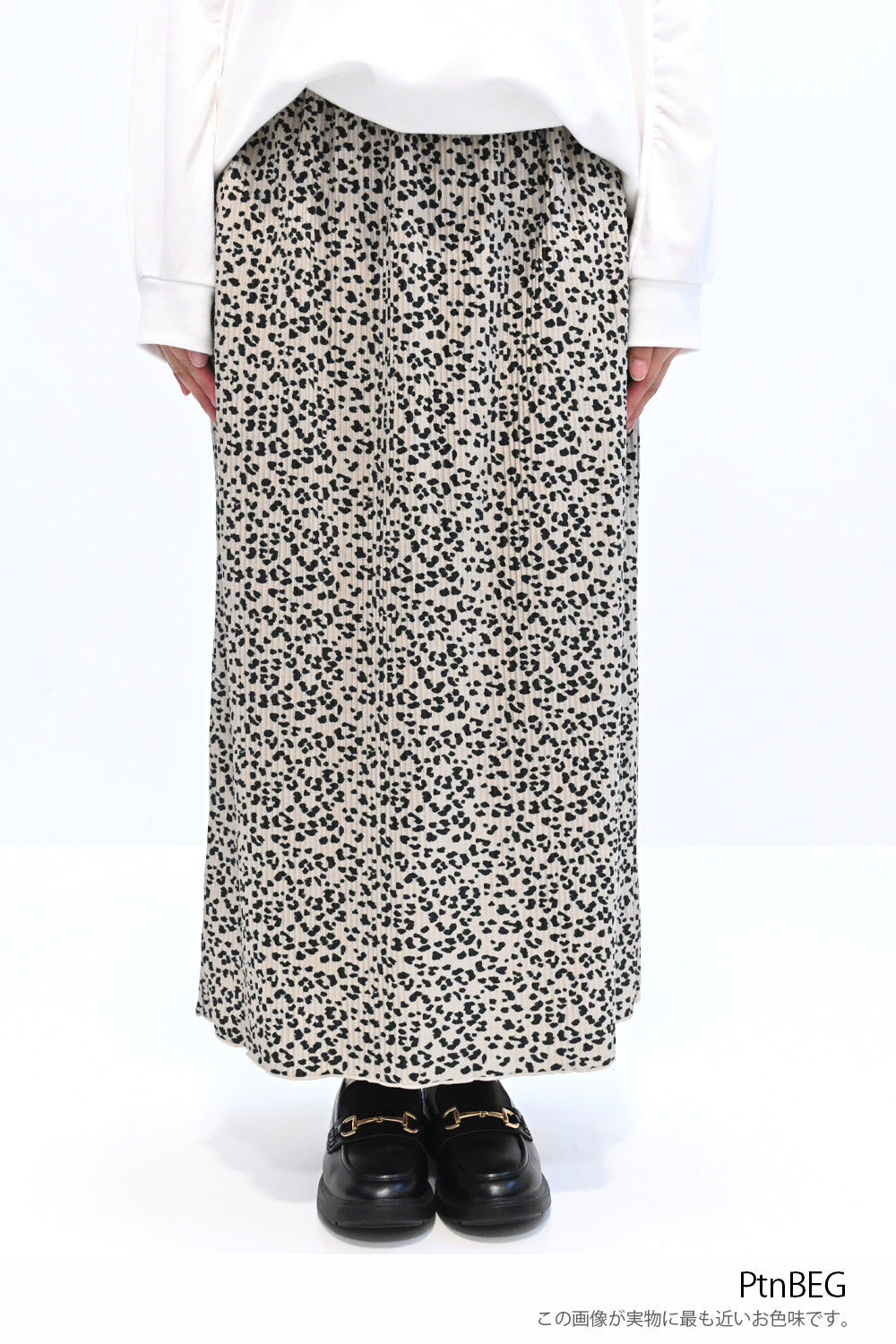 ヒョウ柄やドット柄など、遊び心あるアソートプリントが目を惹くロングスカート。