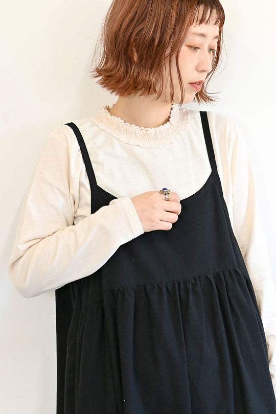 前回のフリルレース付きロングT-2のリピート商品です。襟元にフリルレースを添えた華やかなプチハイデザイン。ナチュラルな風合いのワンポイントにすることで華美になり過ぎず、気兼ねなく使えるデザインに仕上げています。