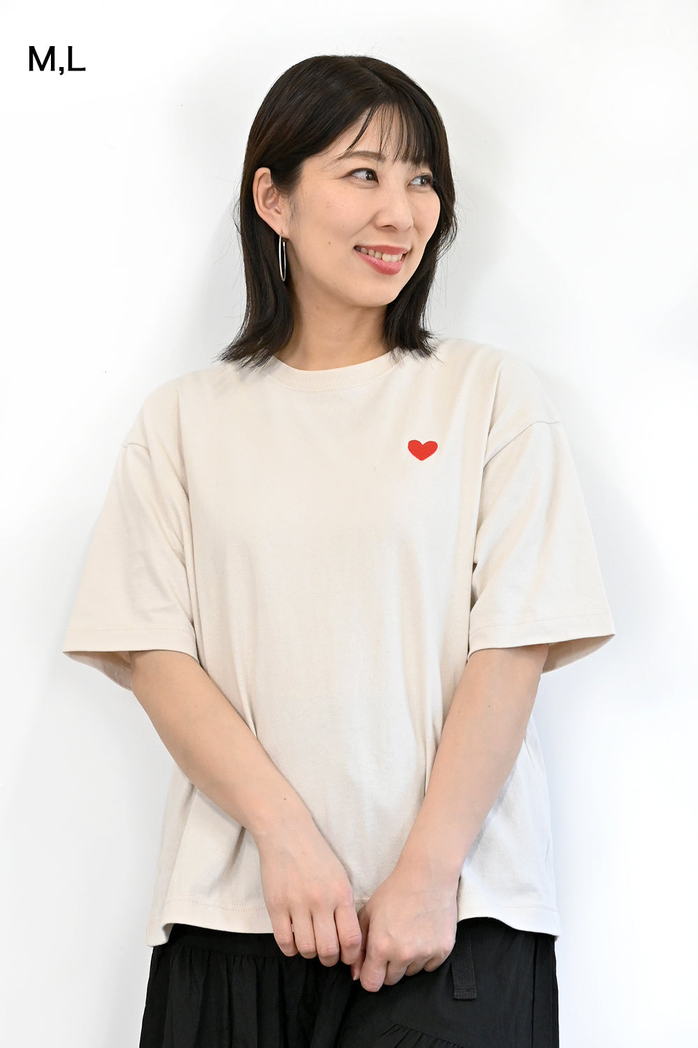 シンプルなゆったりTEEシャツにハートのワンポイントがアクセント。