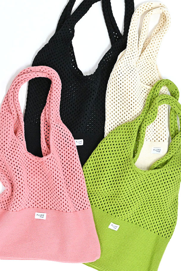 A4サイズが余裕で入る大きめのトートバッグで、底面側は編み目を細かくしているので、バッグの中身が見えにくい仕様がこだわりポイントです。