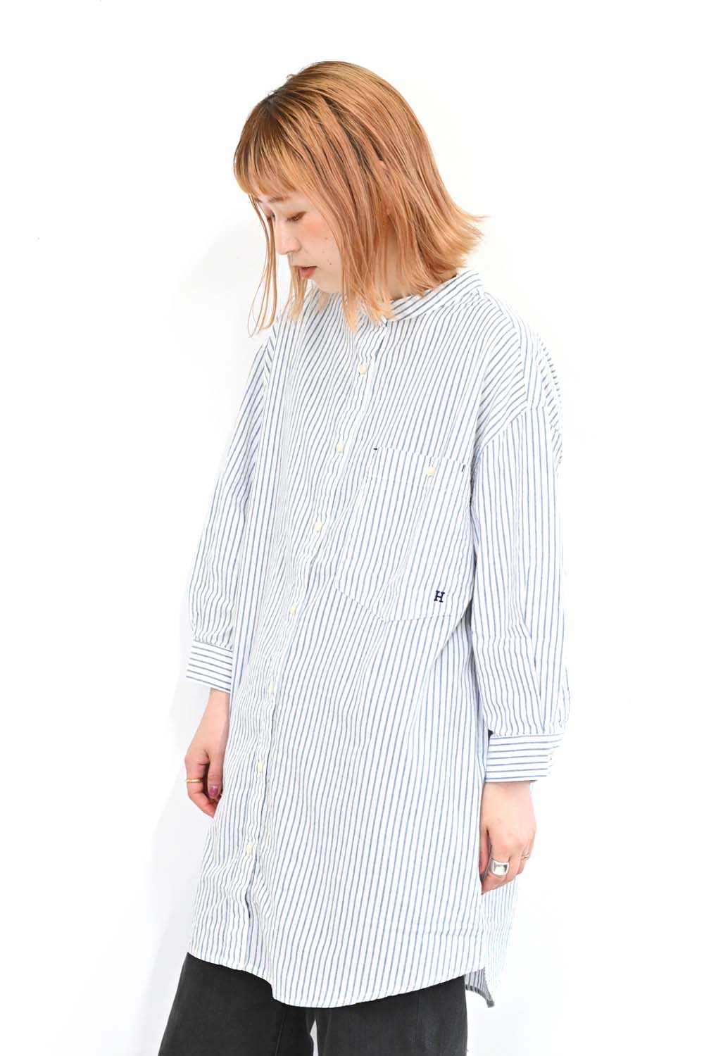 風合いのある生地を使用した爽やかな表情のシャツチュニック。