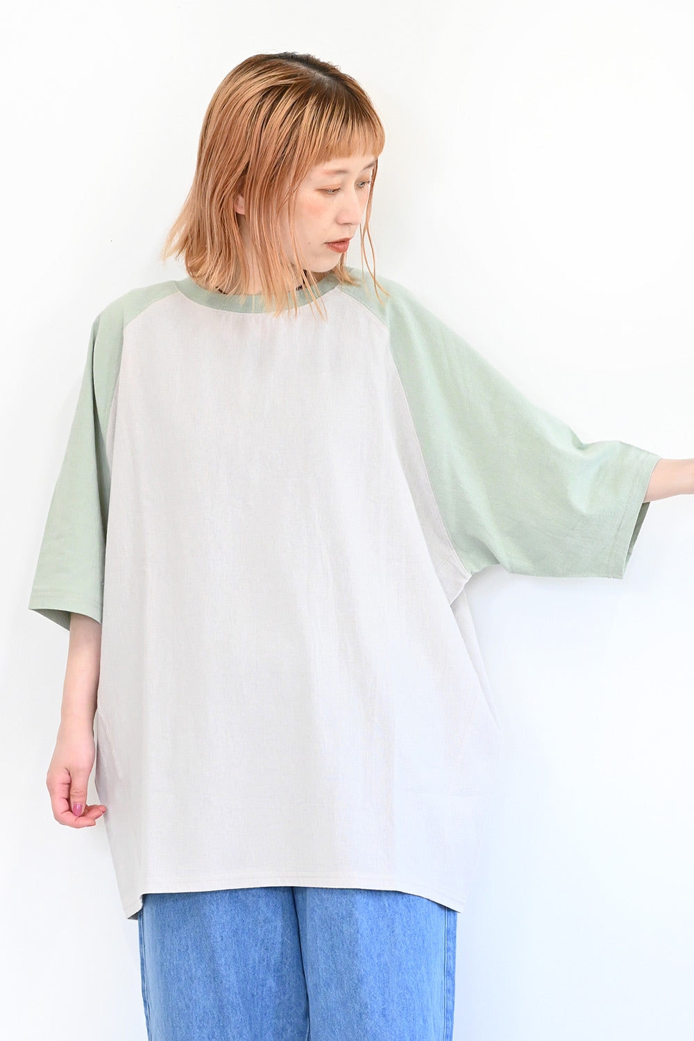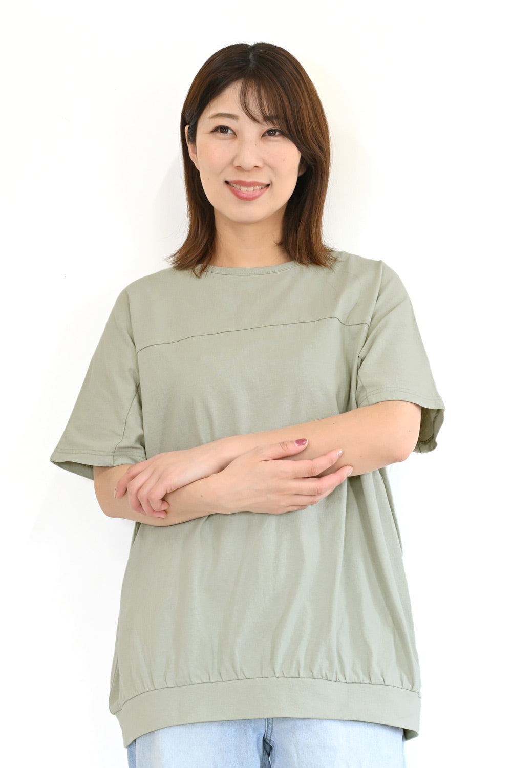 今年も発売決定!待望のほぼTeeです。 表面間のある布帛生地で仕立てたアイテム。 袖と身頃が一体化したようなデザインが女性らしい雰囲気をアップさせます。 袖は5分袖なので、気になる二の腕もすっぽりカバーしてくれます。 シンプルなカラー展開と配色ステッチがシンプルながらおしゃれなポイントです。