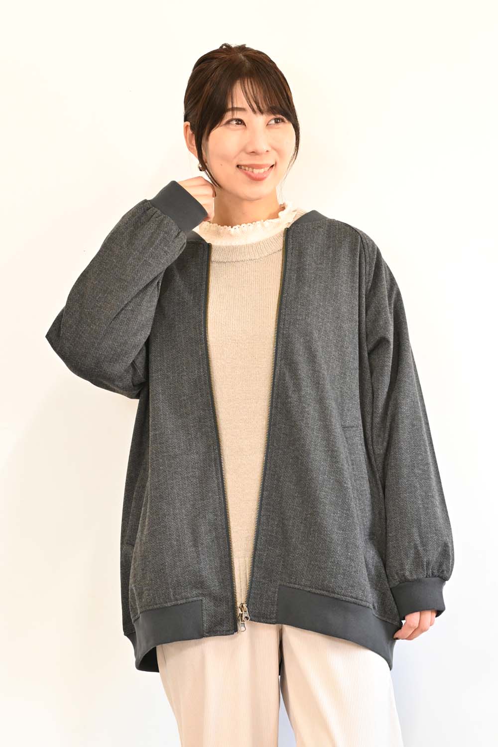 柔らかな質感のカットジャガード素材が心地よい軽アウター。 お尻周りをすっぽりと隠してくれる安心感のある着丈。 袖のフォルムもボリューム感があり、中に着込んだときもサッと羽織りやすいデザインに。 ポケットに仕込んだチャック柄がさりげないアクセント。 温かみのある素材感ながら軽い着心地で、秋、冬、春と3シーズンご着用いただけます。