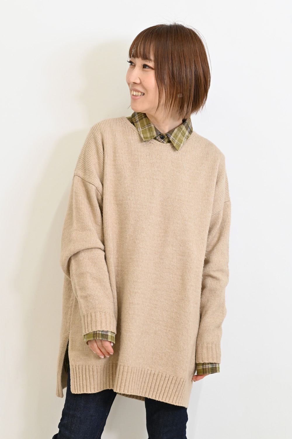デコルテ周りを美しく見せてくれるVネックデザイン。 ゆったりとした身幅で身体のラインを拾いにくく、 ドロップショルダーと裾のスリットデザインが抜け感を演出してくれます。 腰回りを隠してくれる安心丈で、 様々なボトムスとバランスよくコーディネートしていただけます。
