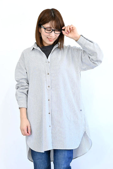 トップスとしても羽織りとしても着られる汎用性の高さが魅力的なシャツチュニック。長めのチュニック丈が気になる腰回りをすっぽりと体型カバー。ラウンドヘムが抜け感のある軽やかなシルエットを作り出します。サイドには便利なポケット付き。左ポケットの下にはH刺繍を施しました。爽やかなカラー展開が春らしい装いを演出してくれます。