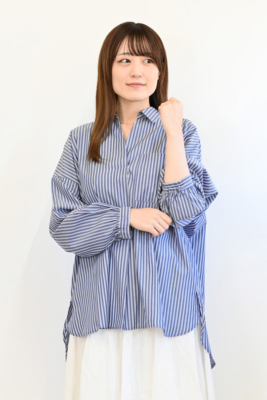無地とストライプの合わせやすいスキッパーブラウスです。Vネックに衿が付いているスキッパーデザインです。体型を拾いにくいゆったりとしたシルエットでありながら、すっきり上品な印象に。やや着丈に前後差があるチュニック丈は、気になる腰回りをカバーしてくれる優れものです。寒さ残る日はインナーに、暖かくなったら羽織として着られる、便利な定番アイテムです。