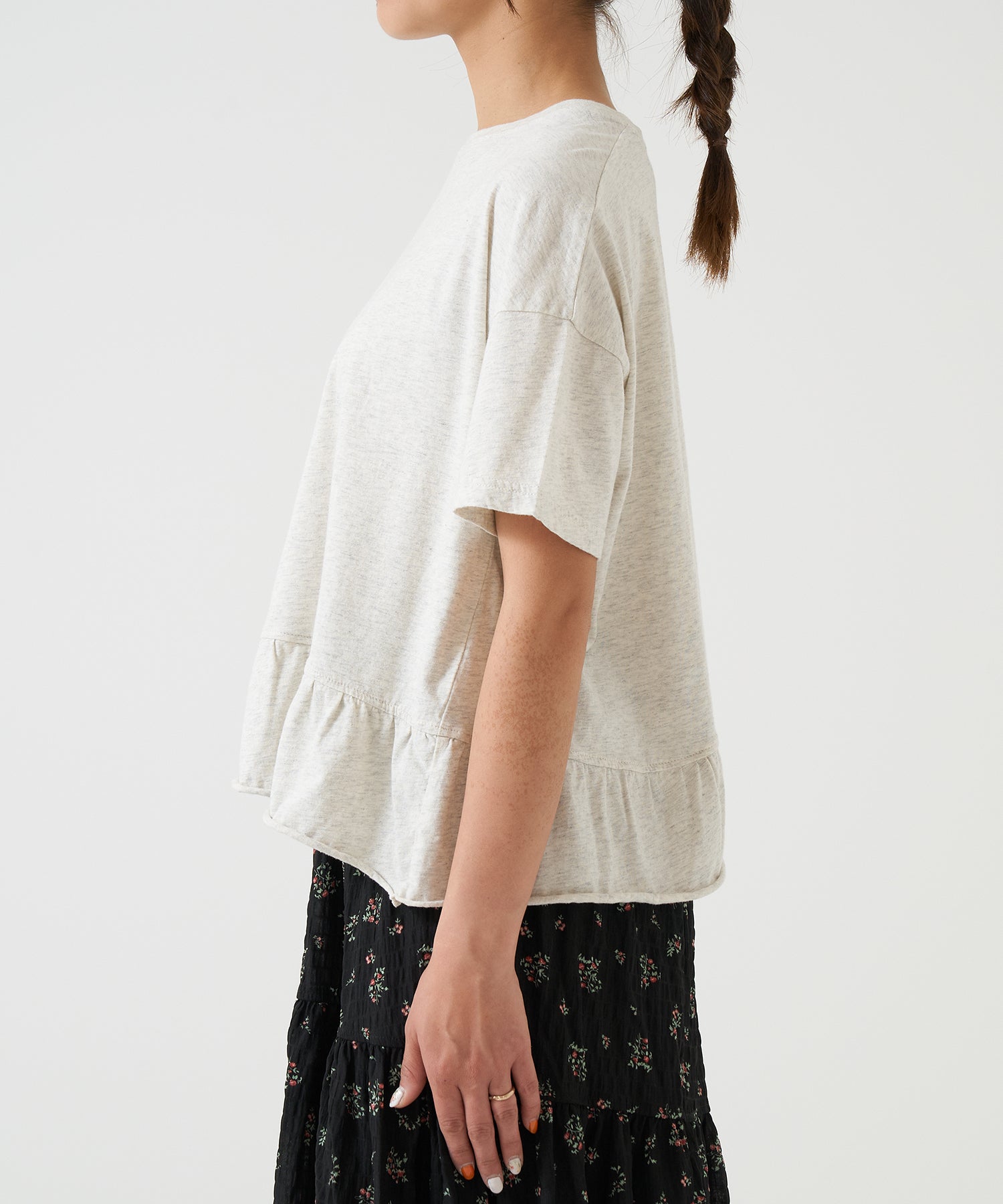 A cut-and-sew top featuring frills continuing from the back as a key point.