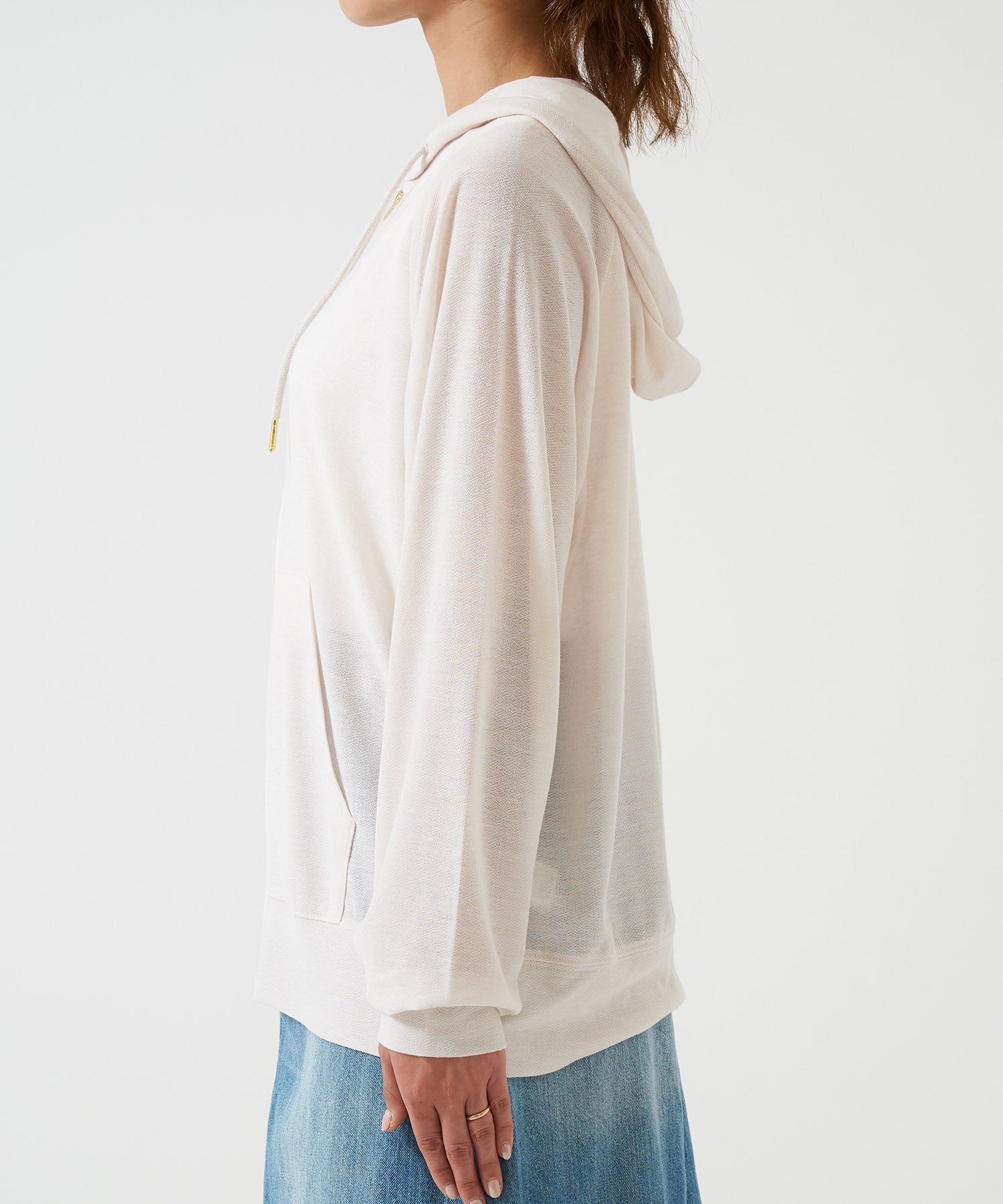 Subtle metal drawstrings add an elegant accent to the casual look.