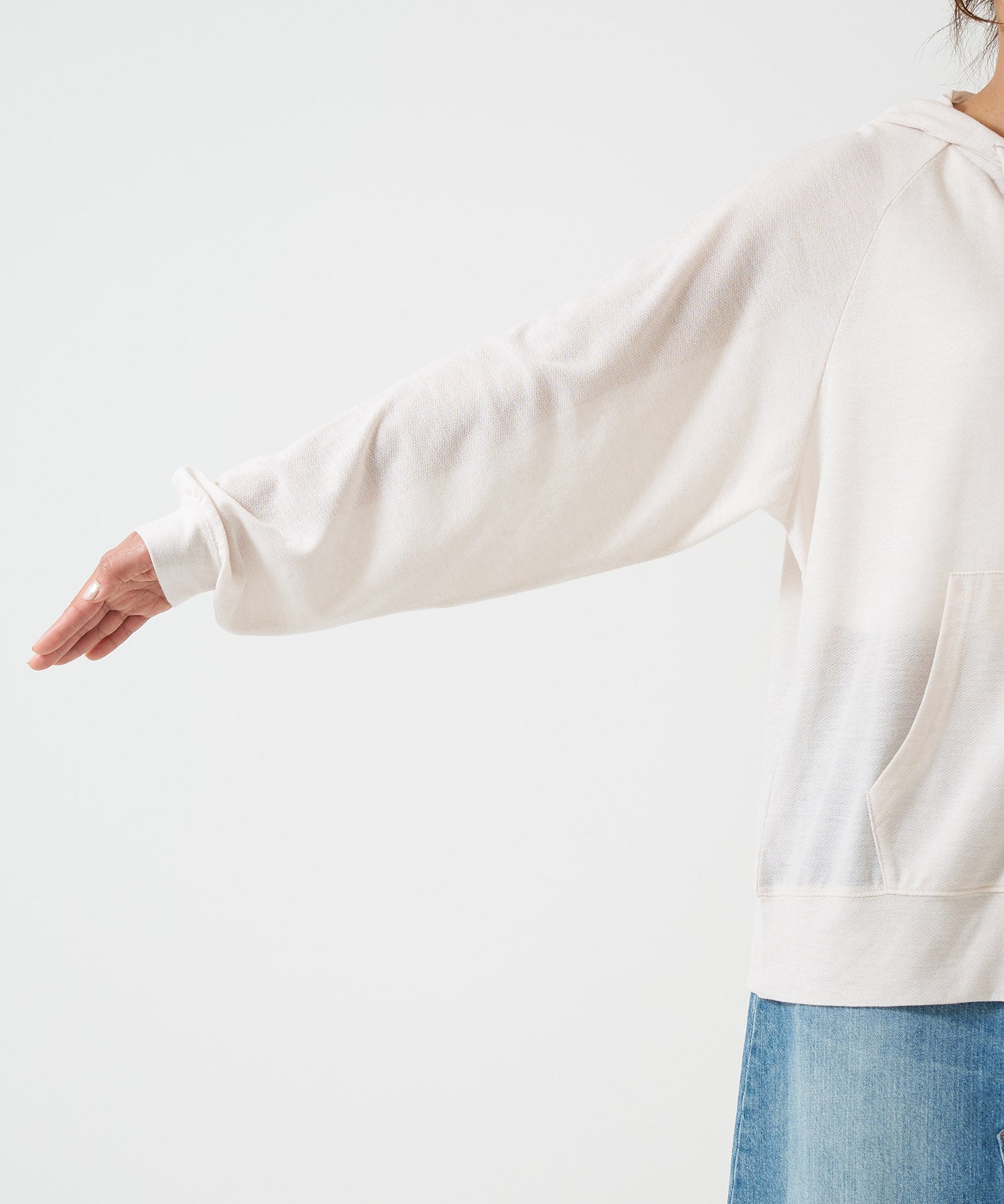 Soft texture and lightweight, thin comfort are highlights, featuring a front zipper and hood,