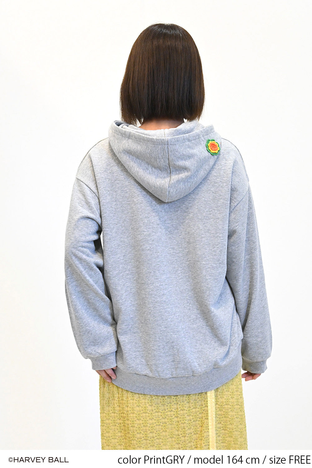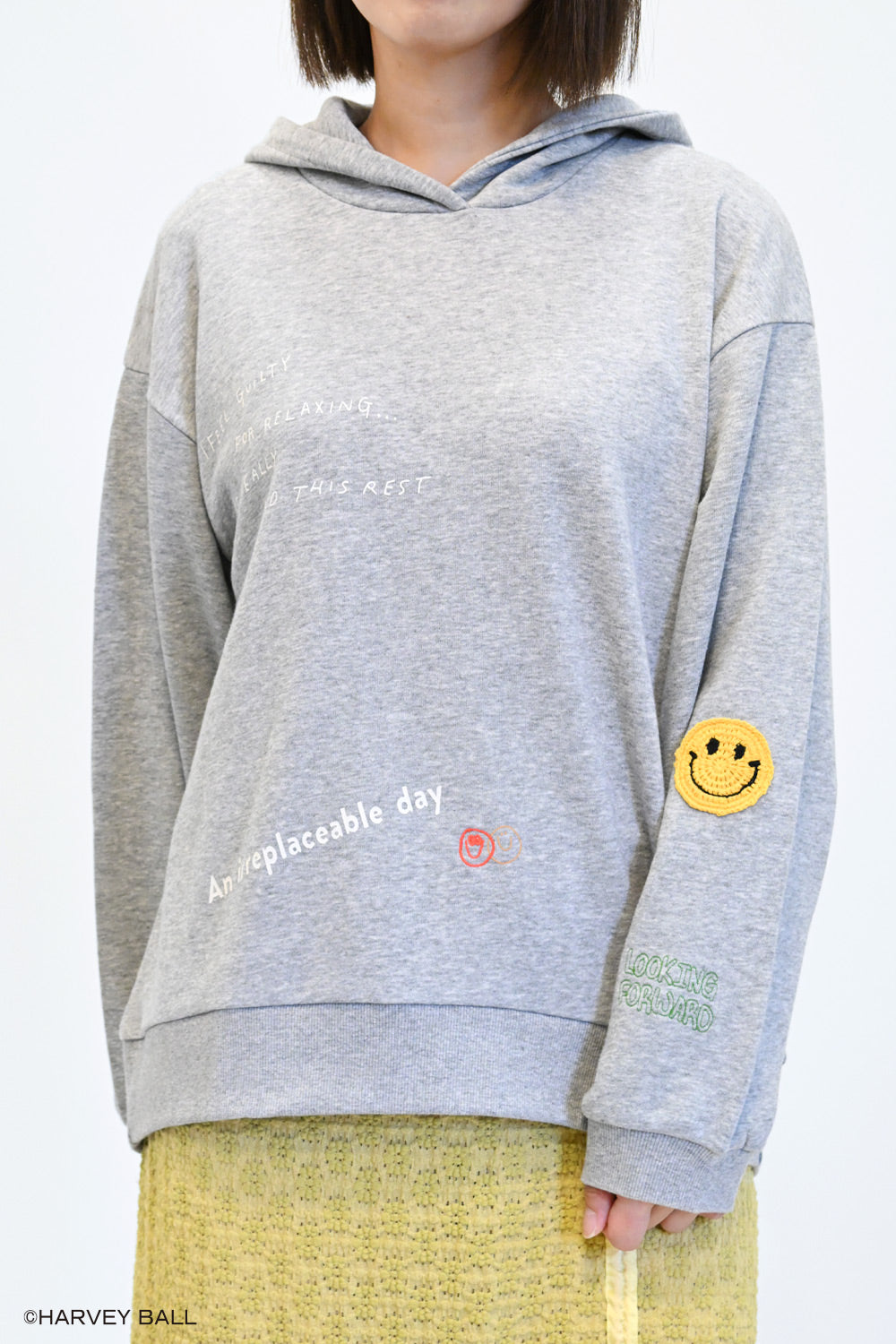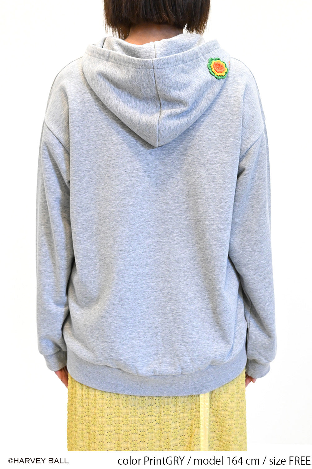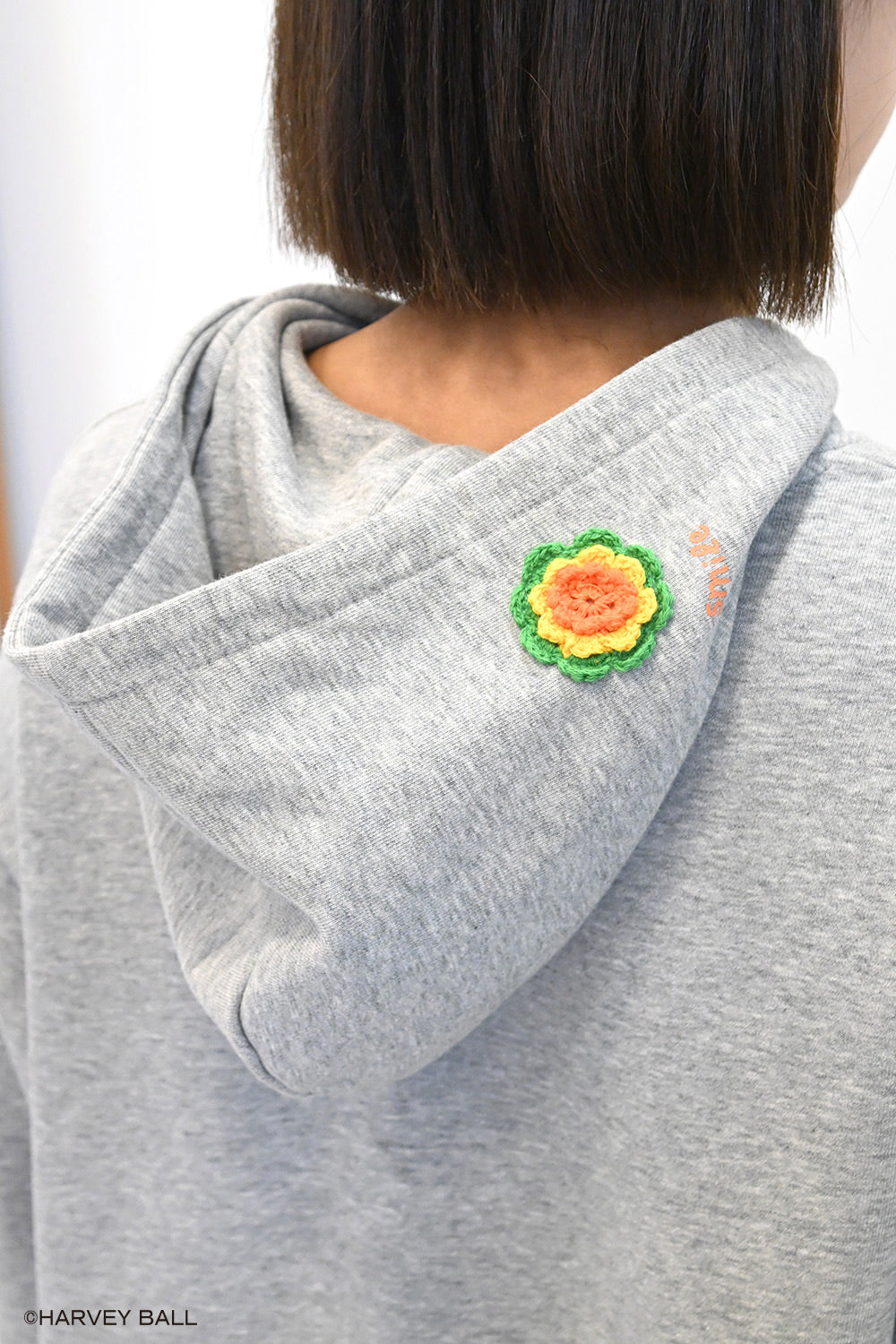 袖口のスマイルワッペンやフードのお花ワッペン、さらに刺繍やロゴをあしらった、遊び心たっぷりのデザインパーカー。