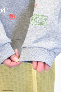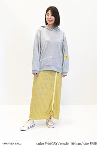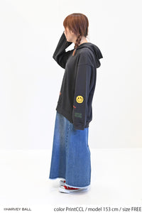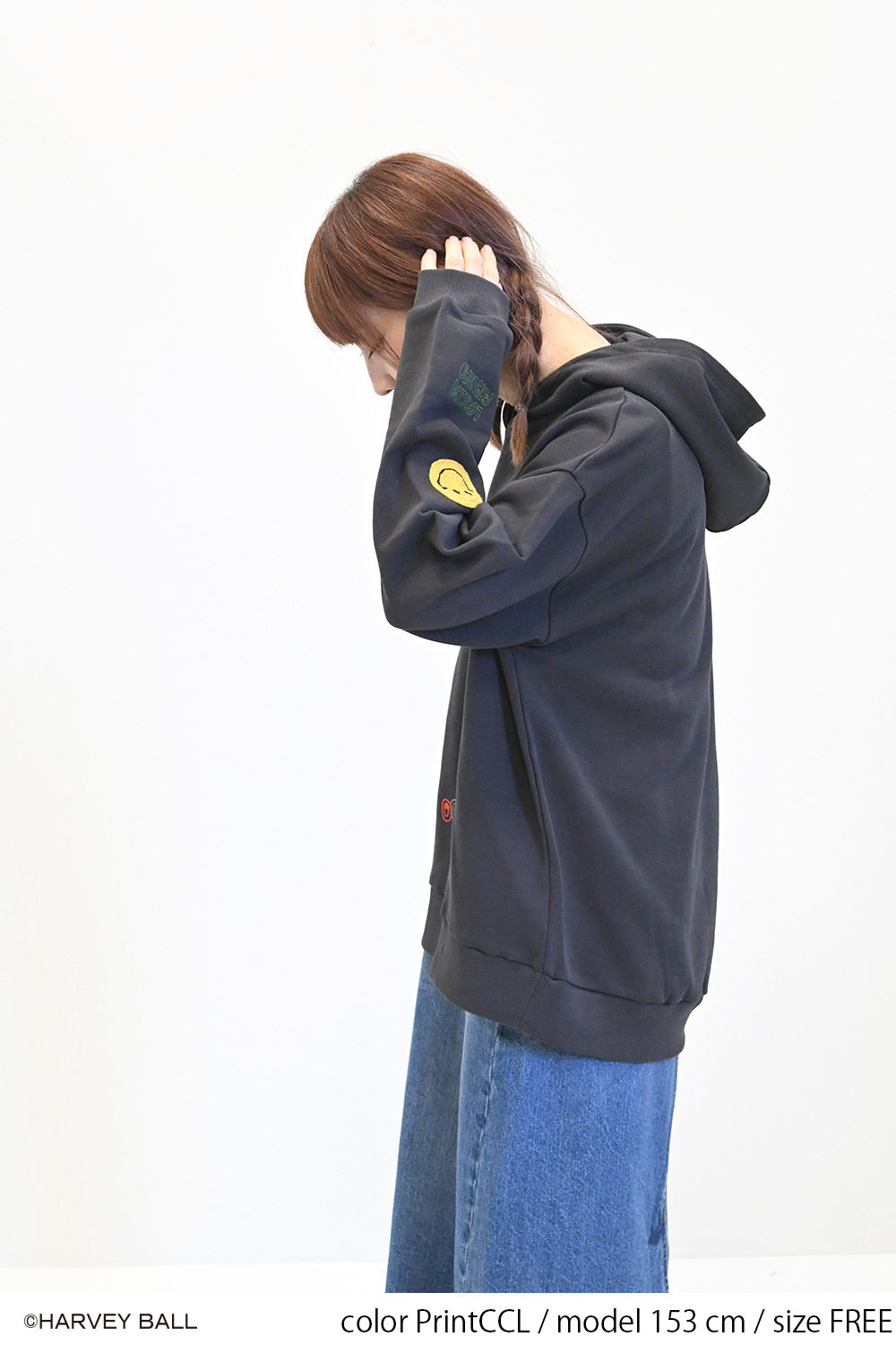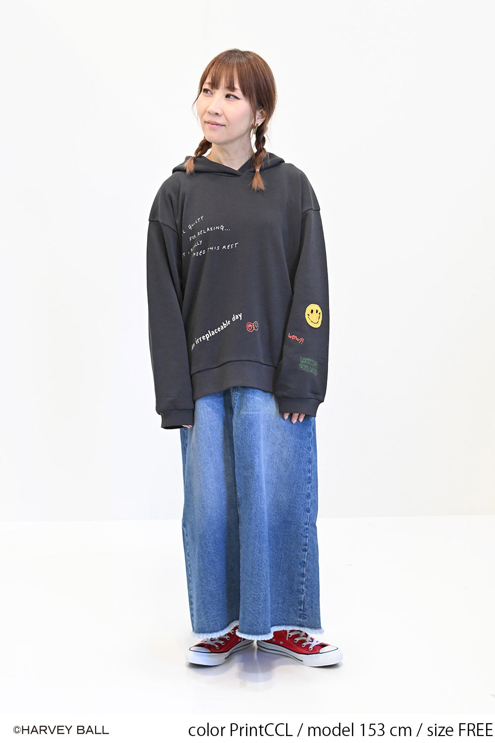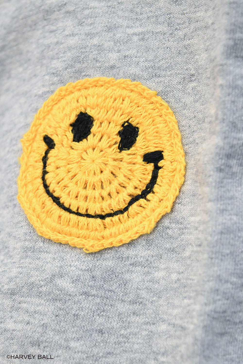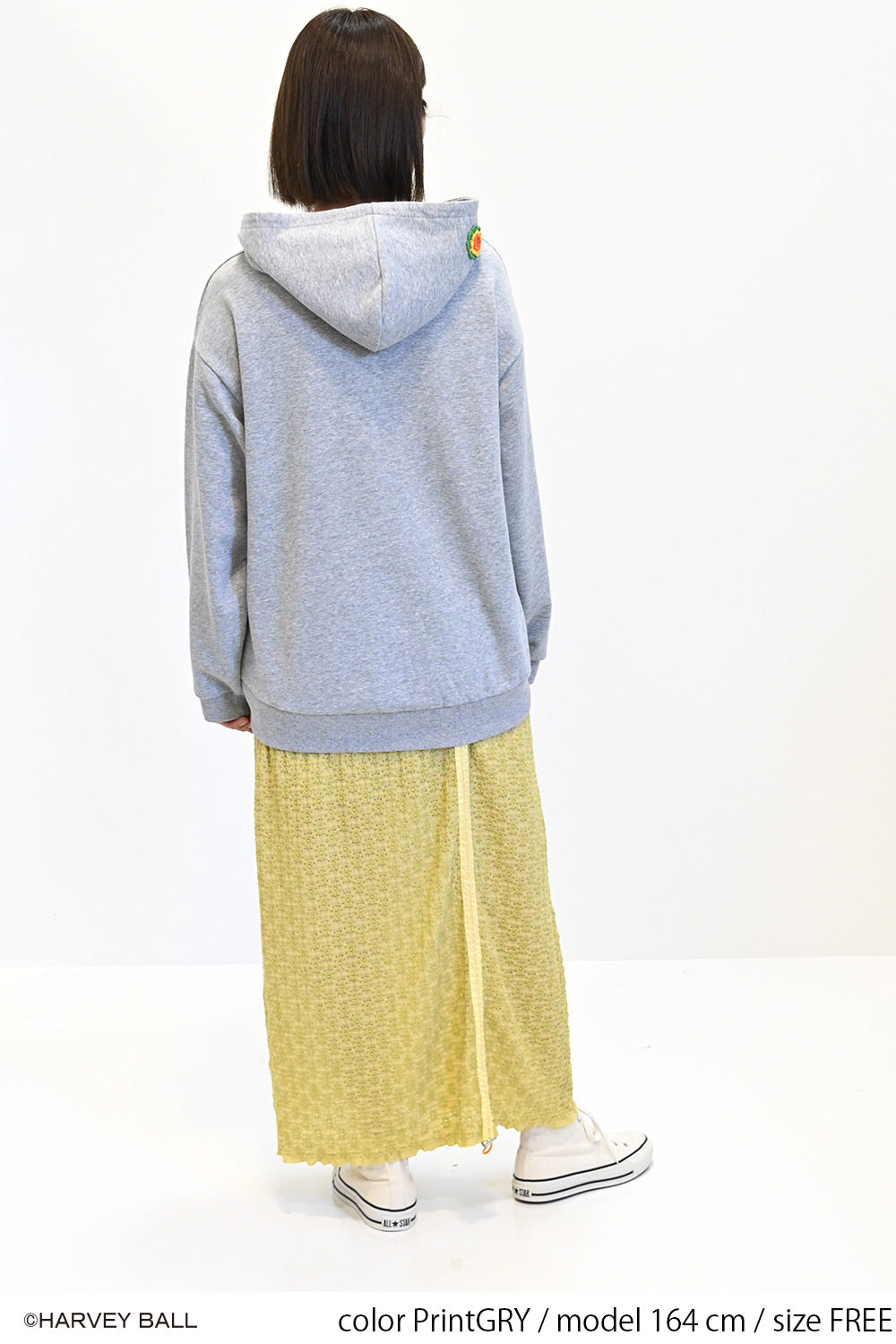 袖口のスマイルワッペンやフードのお花ワッペン、さらに刺繍やロゴをあしらった、遊び心たっぷりのデザインパーカー。