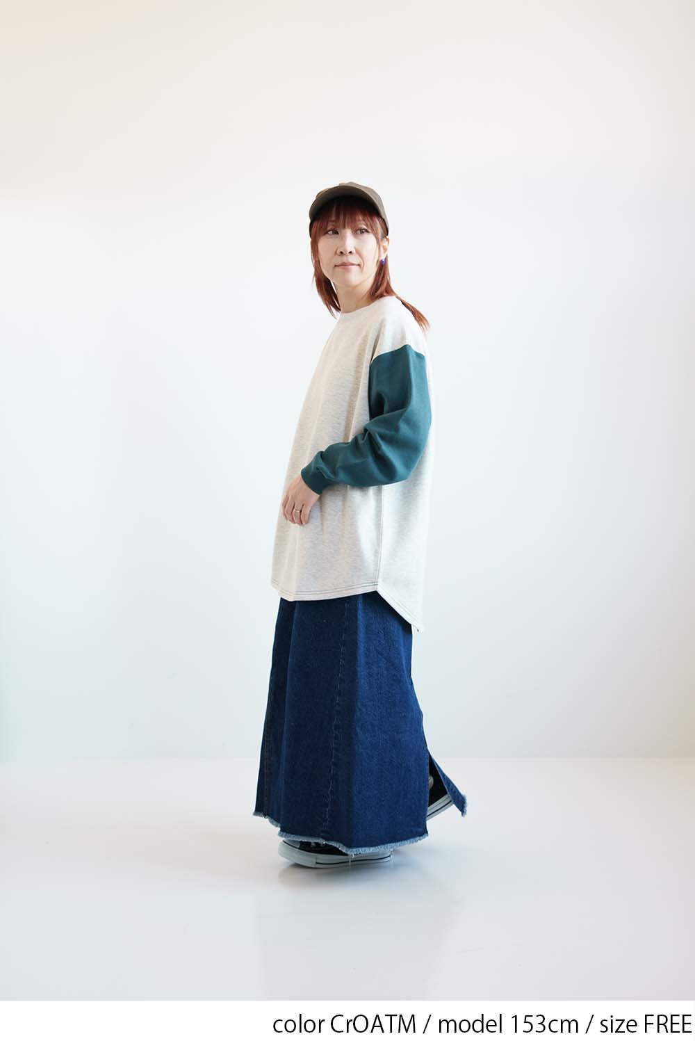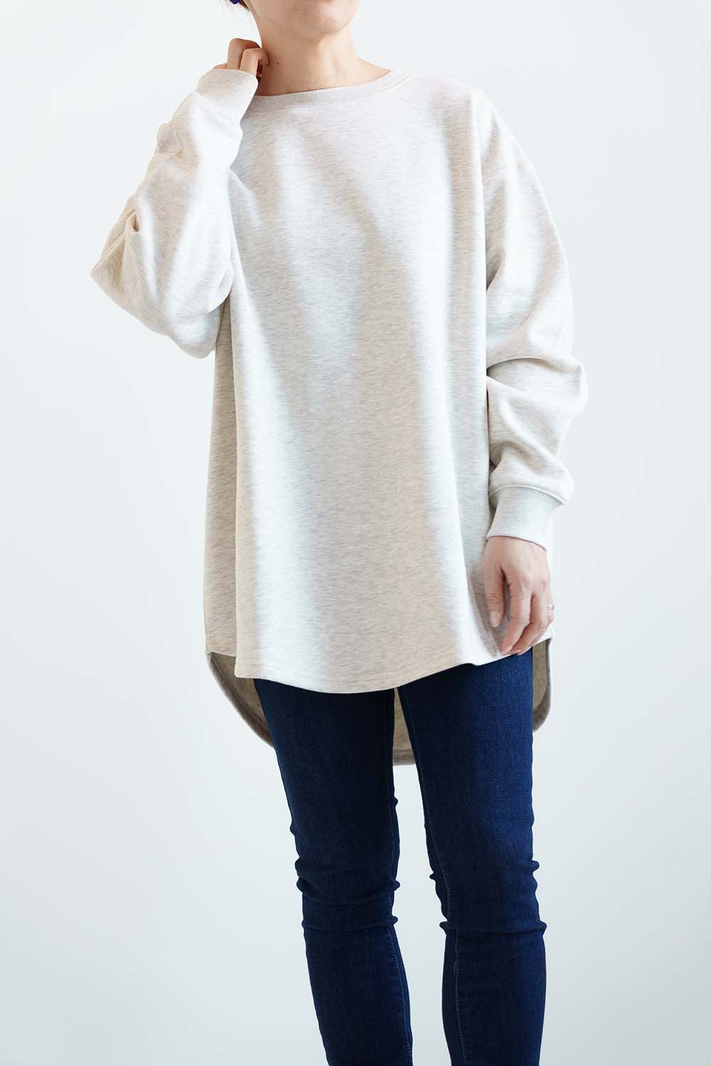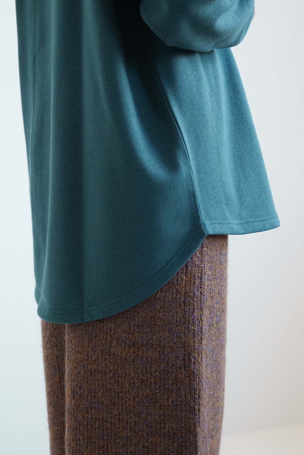 裾は前後差のあるラウンドヘム仕様で、腰まわりを自然にカバーしながら、動きのあるシルエットを演出。