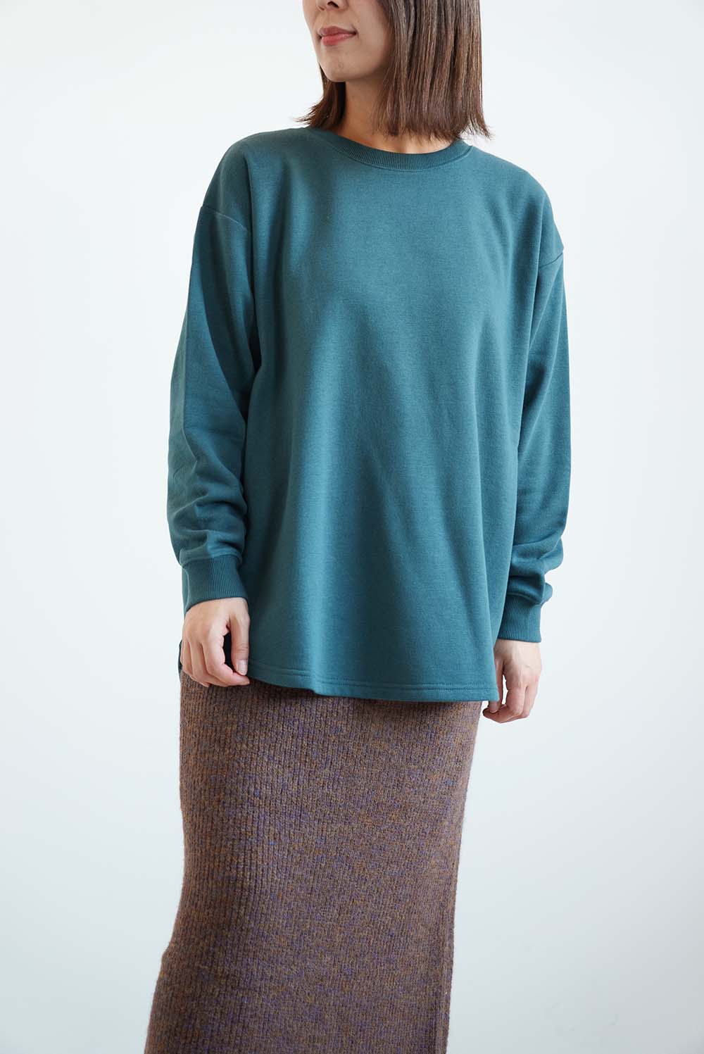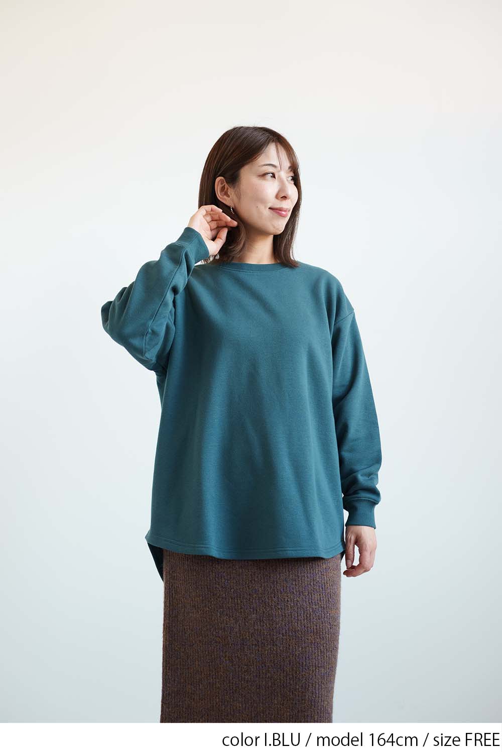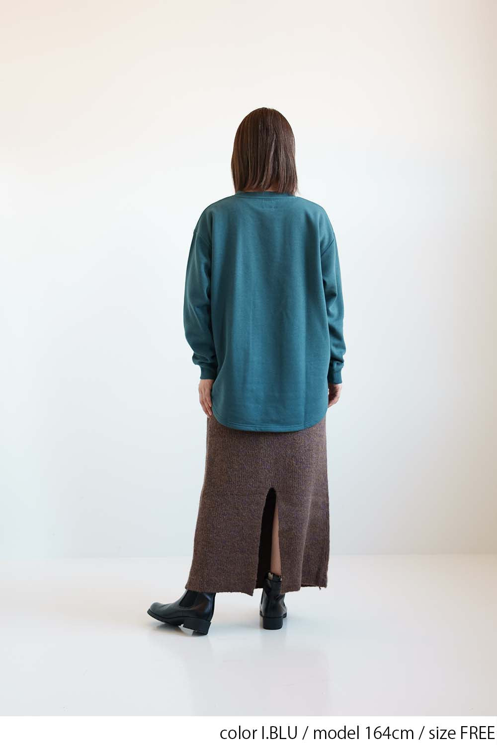 裾は前後差のあるラウンドヘム仕様で、腰まわりを自然にカバーしながら、動きのあるシルエットを演出。