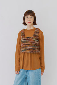立体感のあるシャギーニットのビスチェと、着回し力抜群なシンプルな長袖Tシャツの組み合わせ。