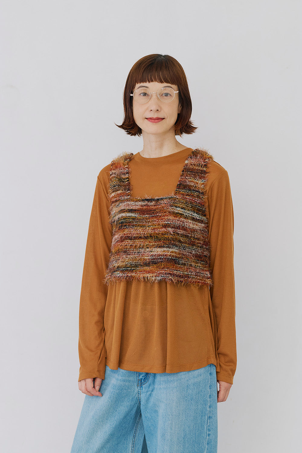 ビスチェは様々な色の糸がミックスされた、表情豊かなフェザーヤーン。