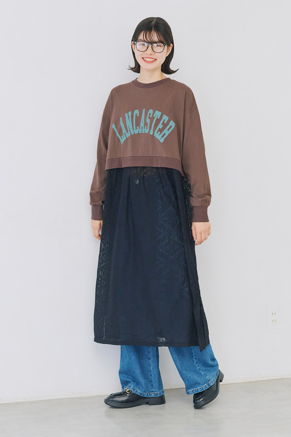 カジュアルなTシャツとフェミニンなレースが一つになった、ドッキングデザインのワンピースです。
