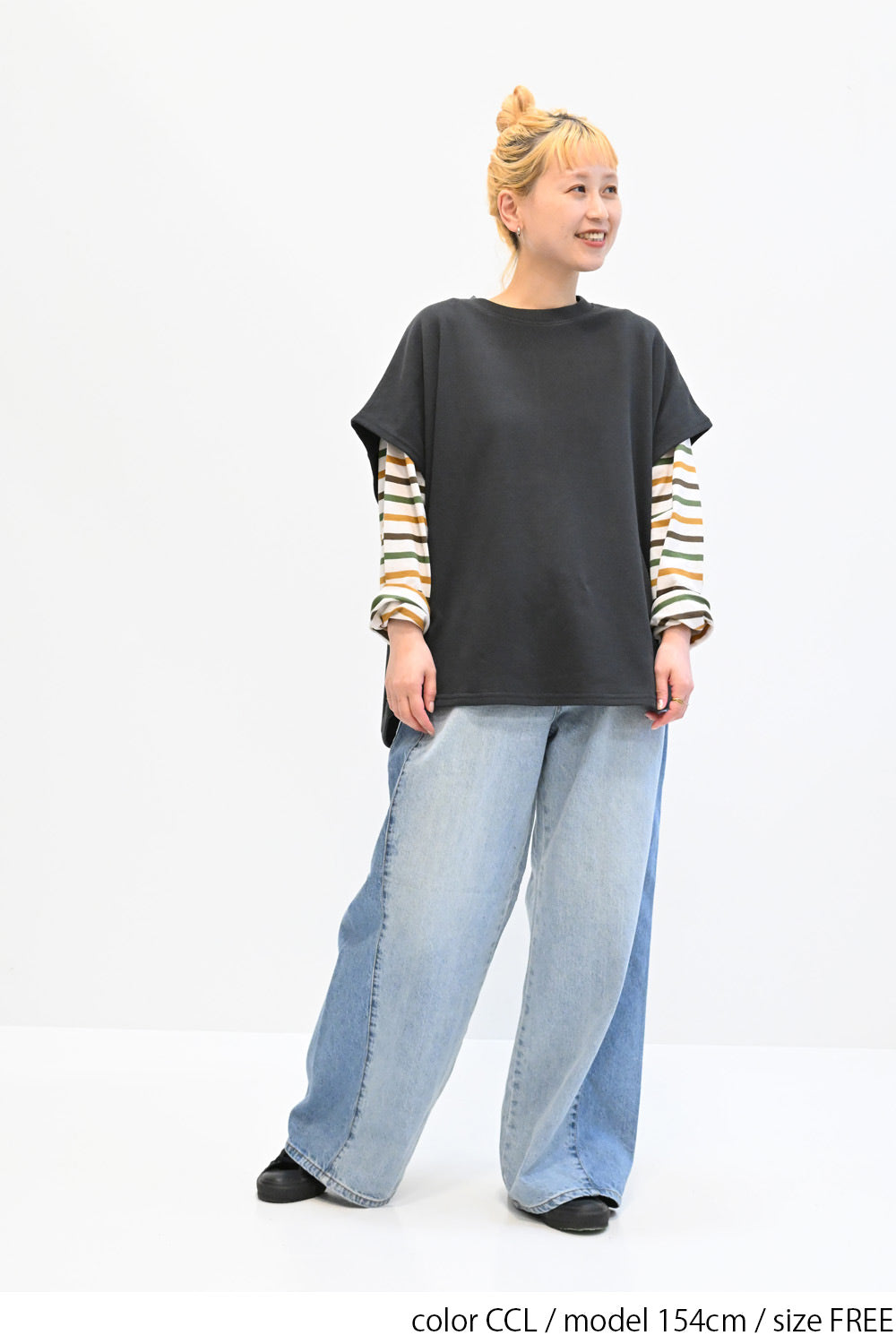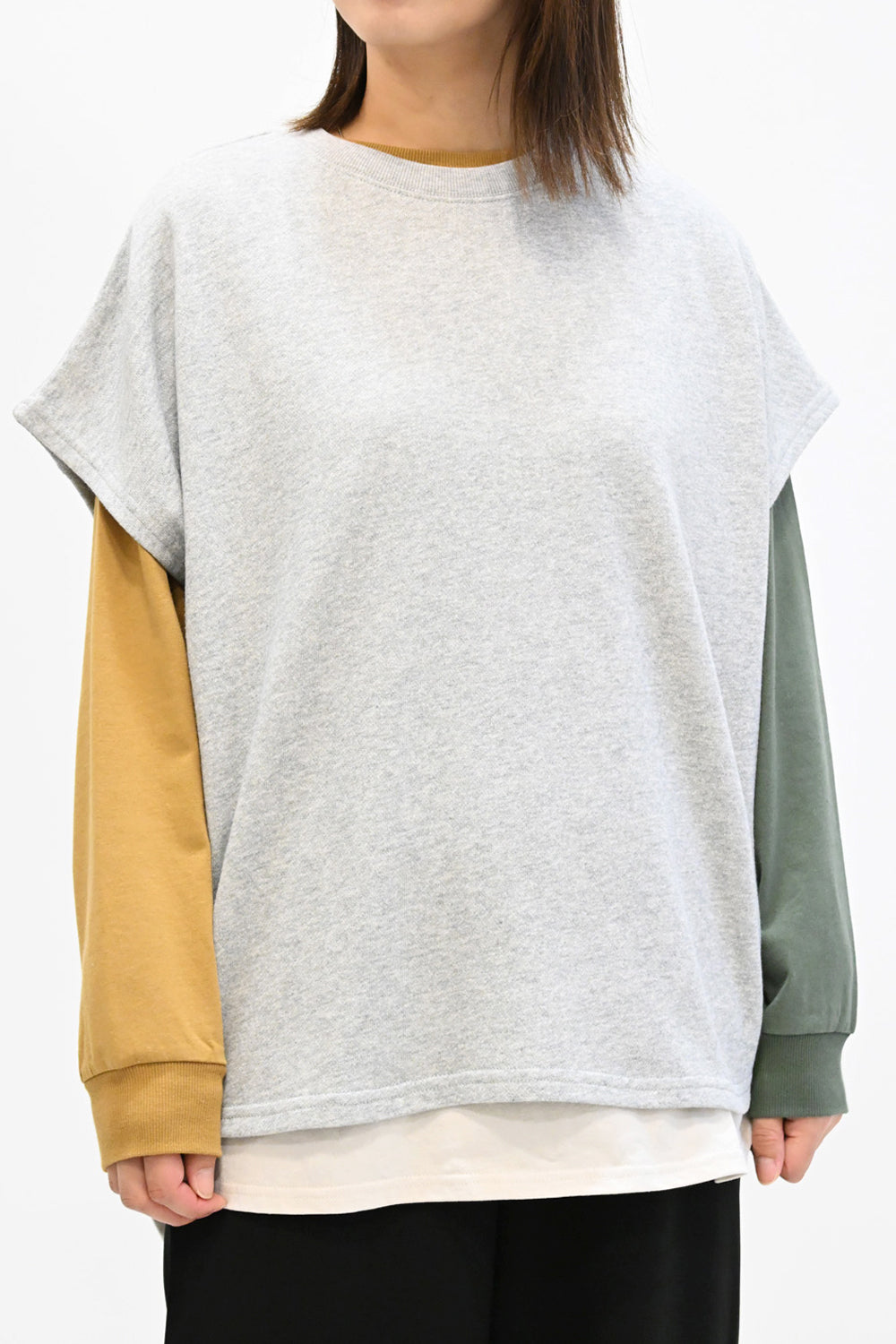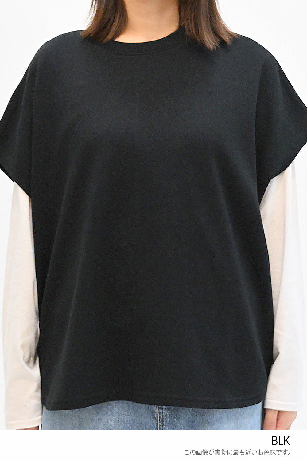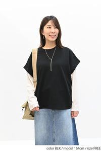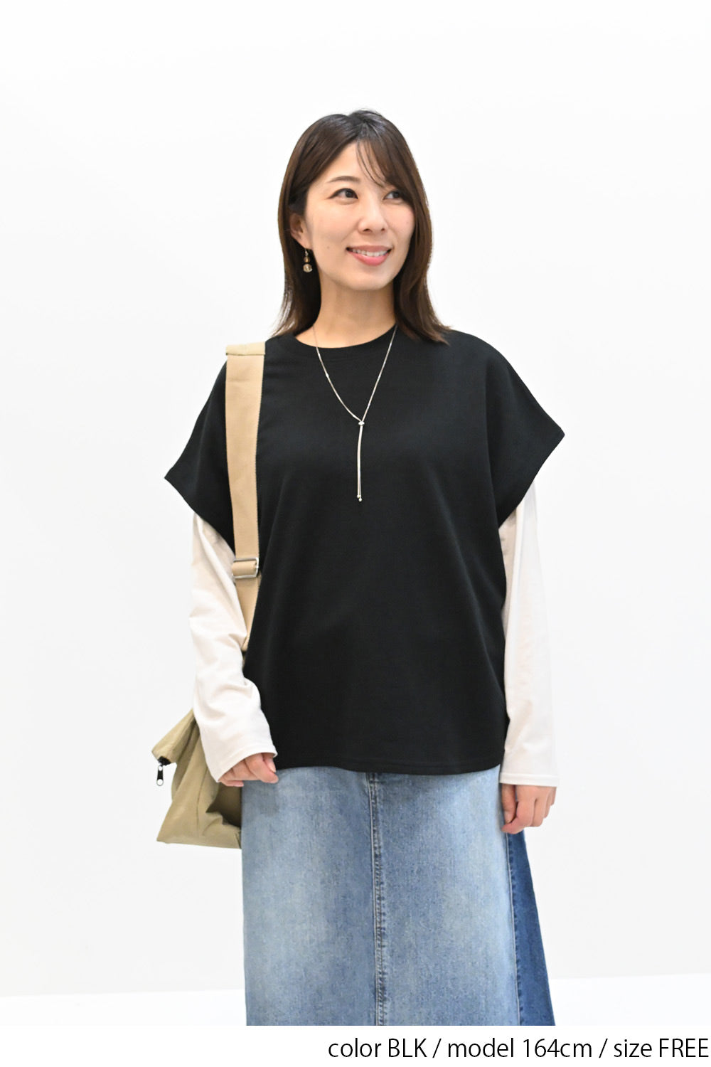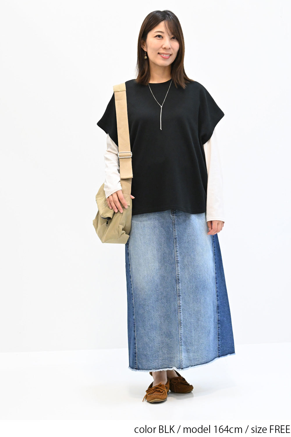 程よく開いたクルーネックと広めのアームホールで、シャツやロンT、ワンピースなど幅広いインナーに重ねていただけます。