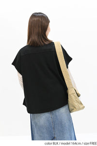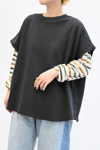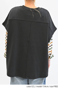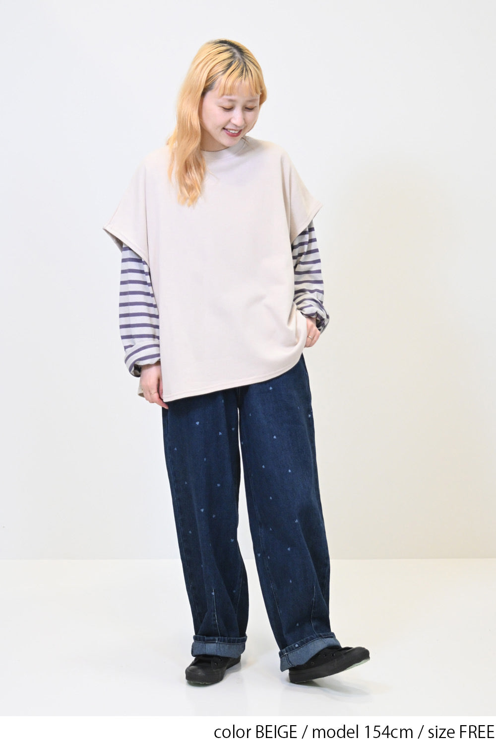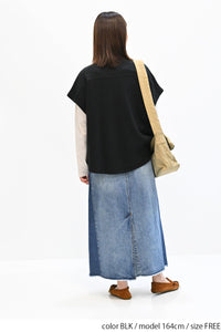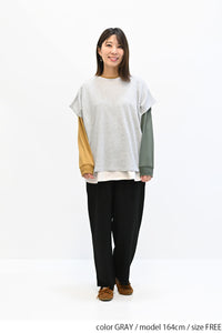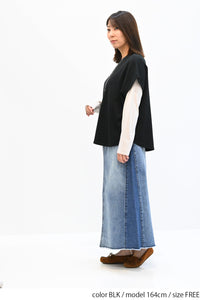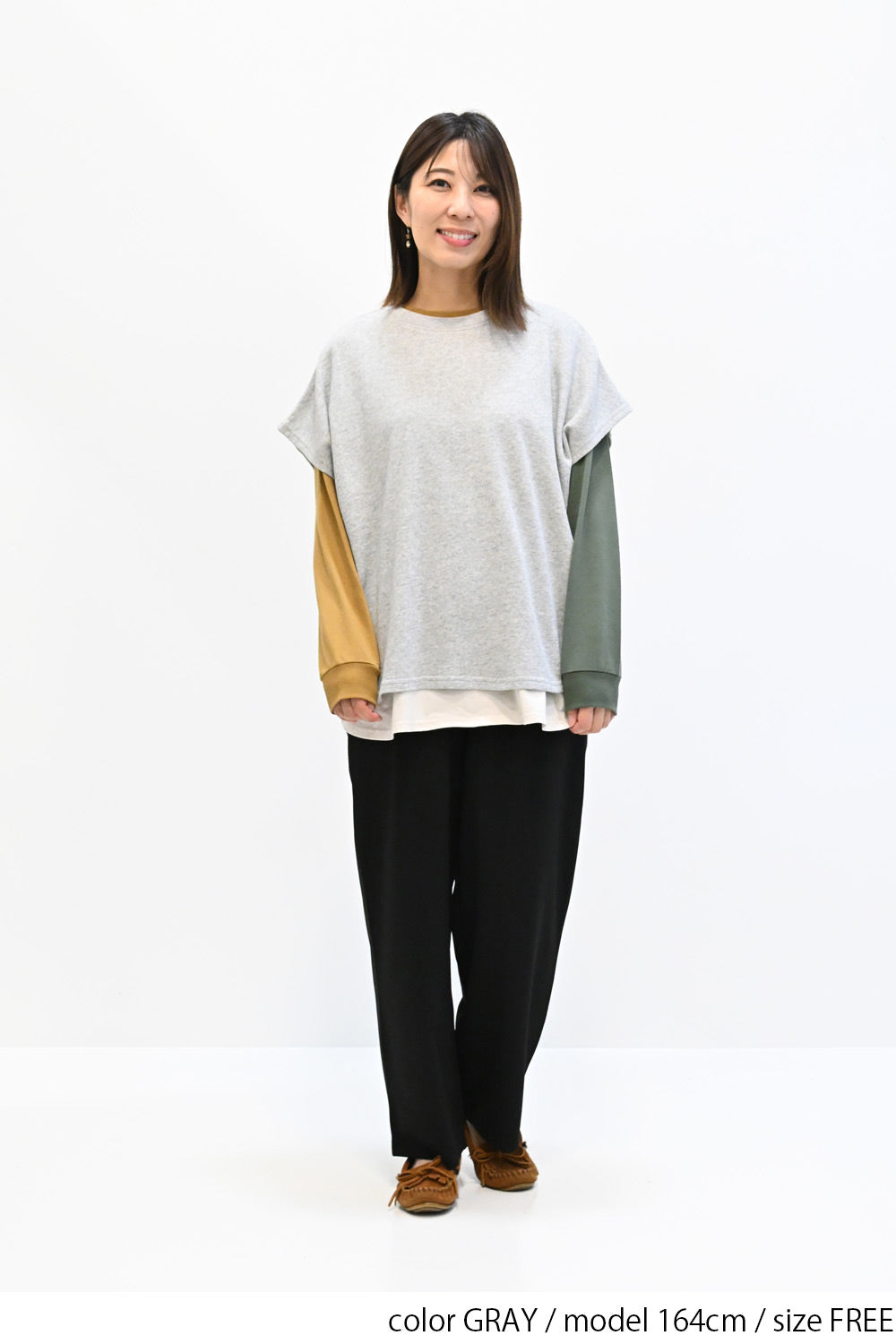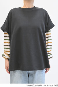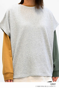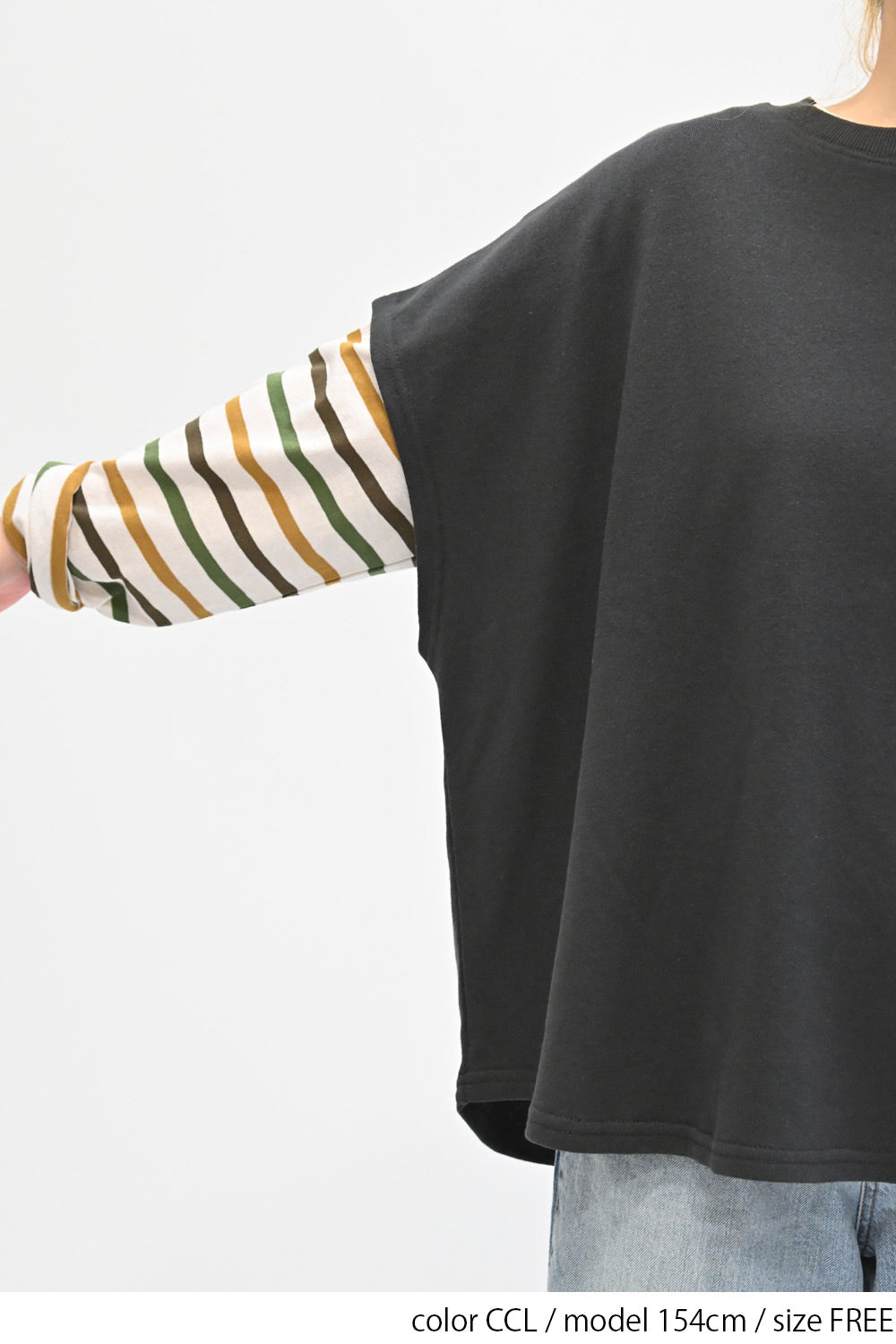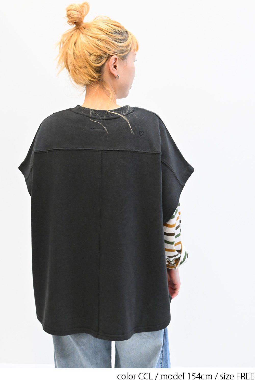 程よく開いたクルーネックと広めのアームホールで、シャツやロンT、ワンピースなど幅広いインナーに重ねていただけます。