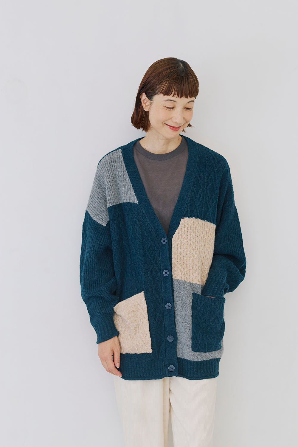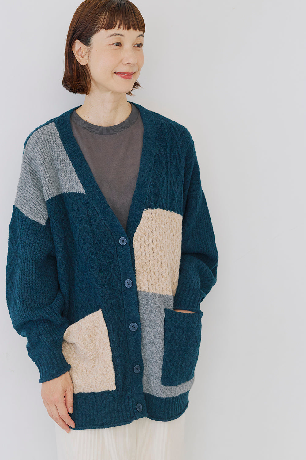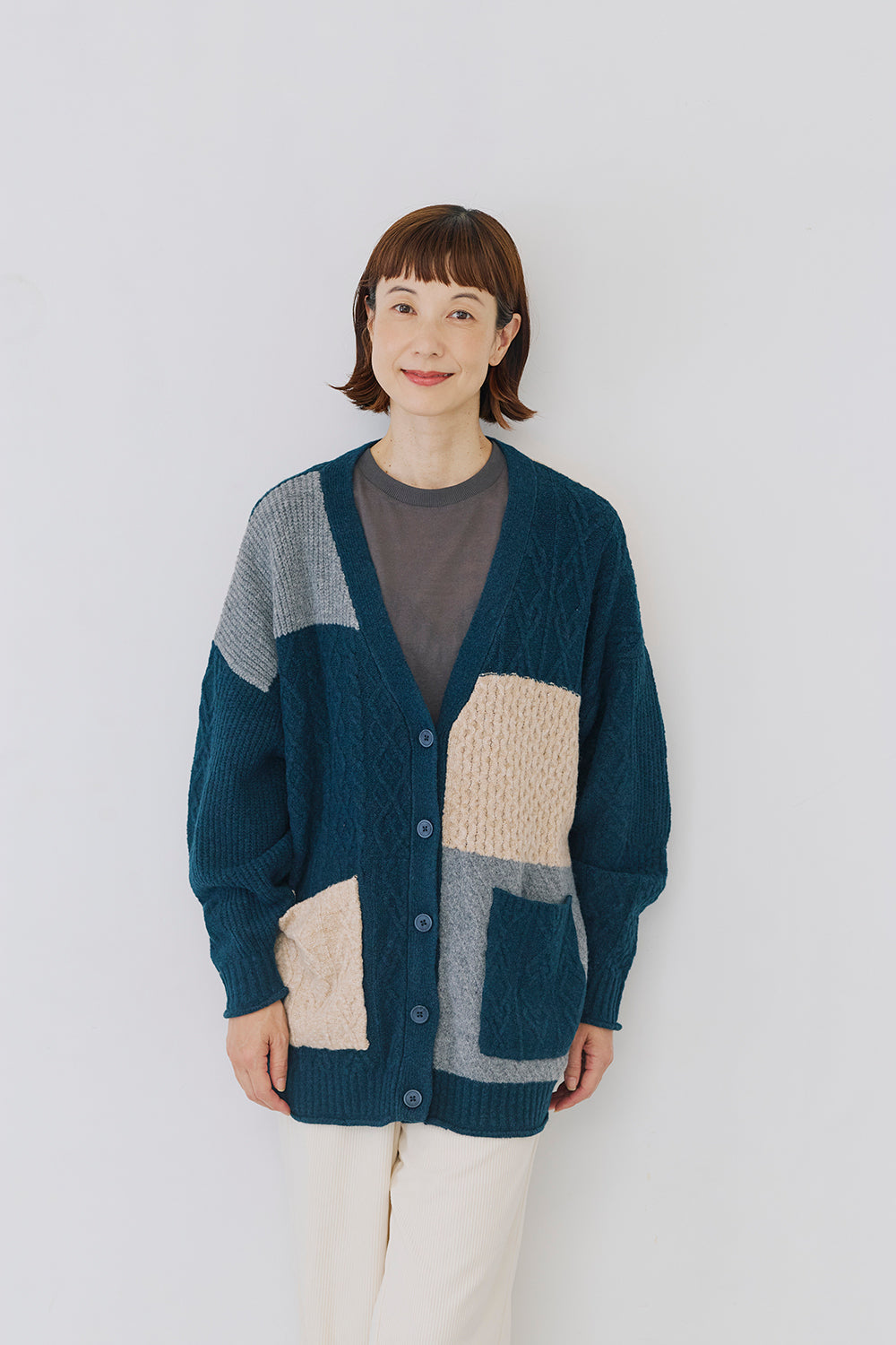 色んな色や柄で編まれたパッチワークデザインが可愛いニットカーデ。