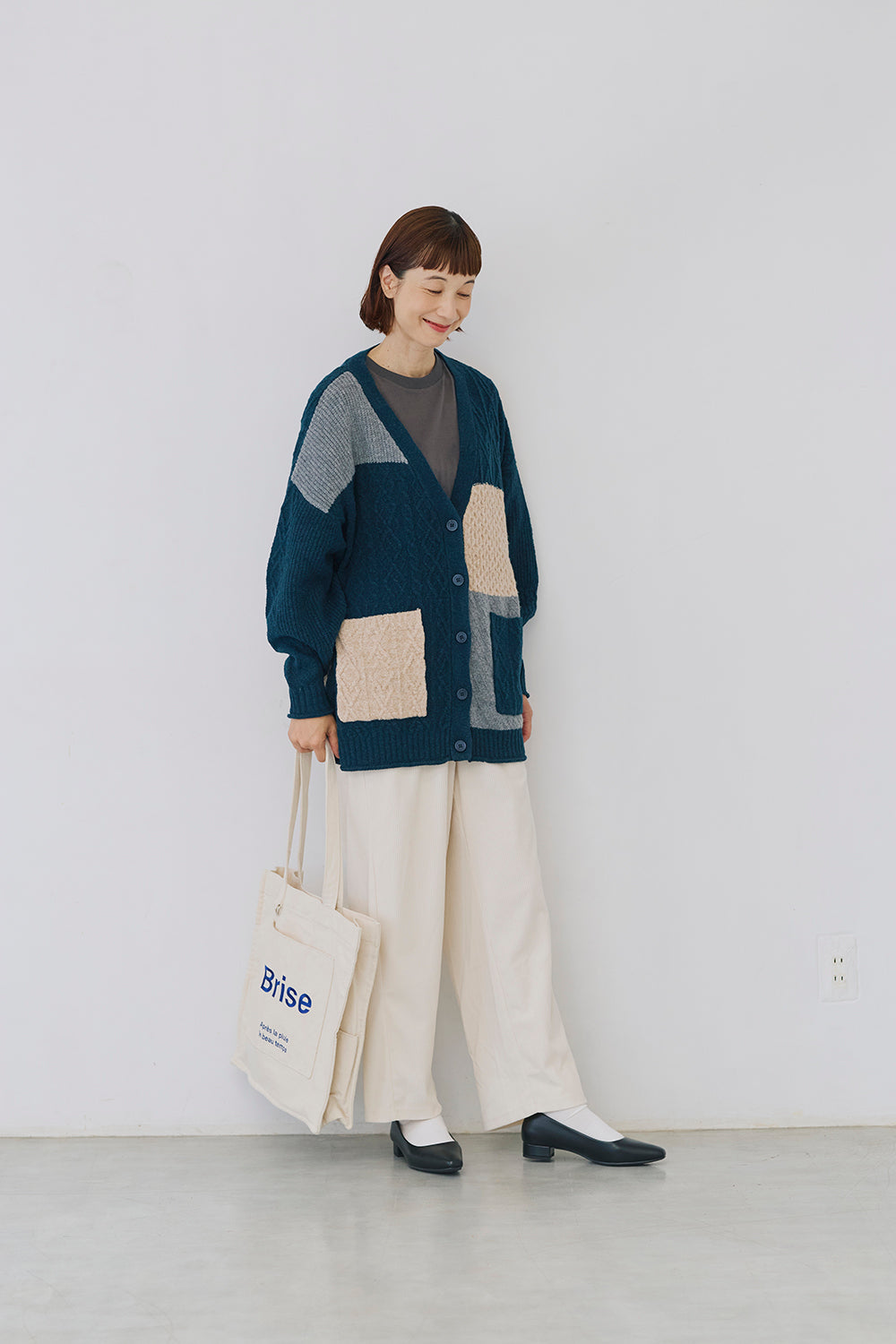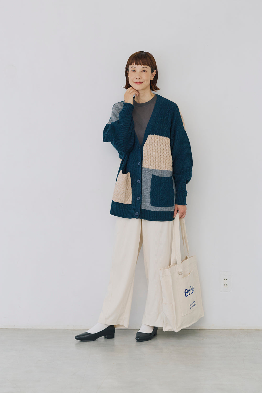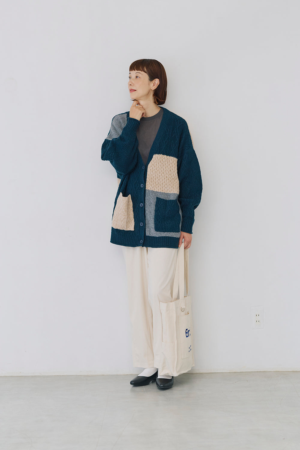 色んな色や柄で編まれたパッチワークデザインが可愛いニットカーデ。
