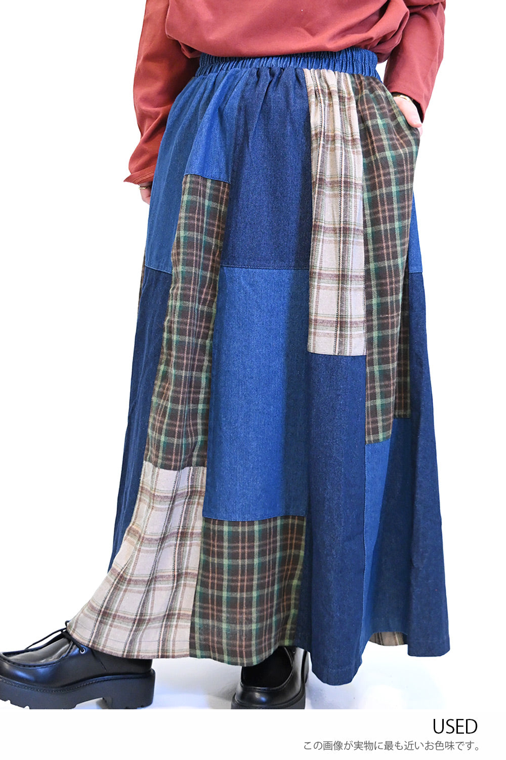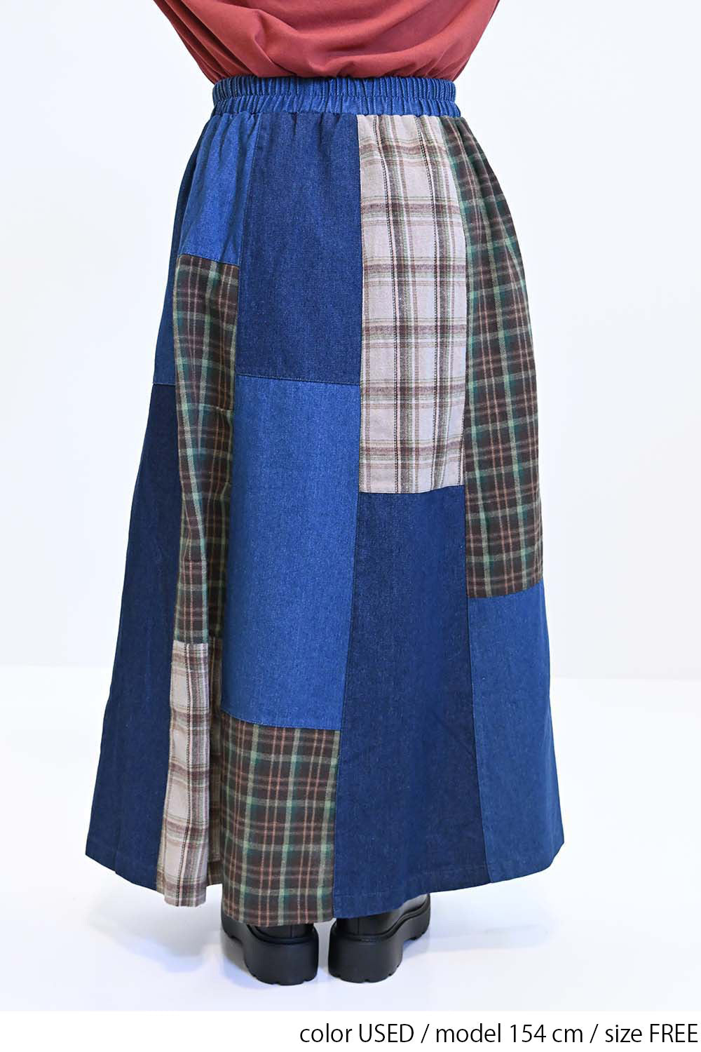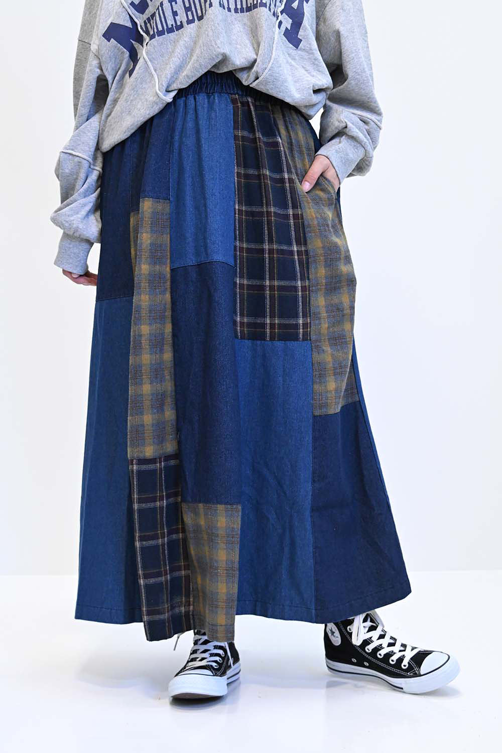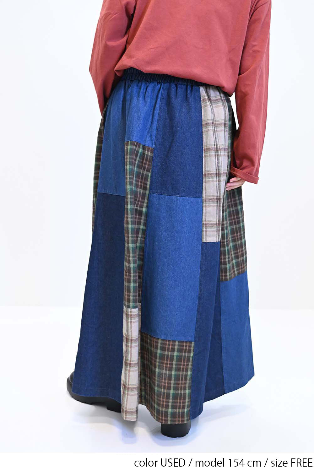2色のデニムと2色のチェック生地を合わせた、パッチワーク風のスカート。