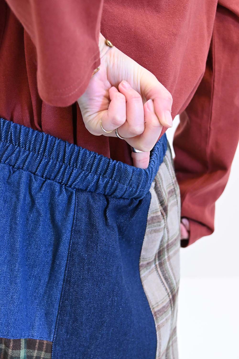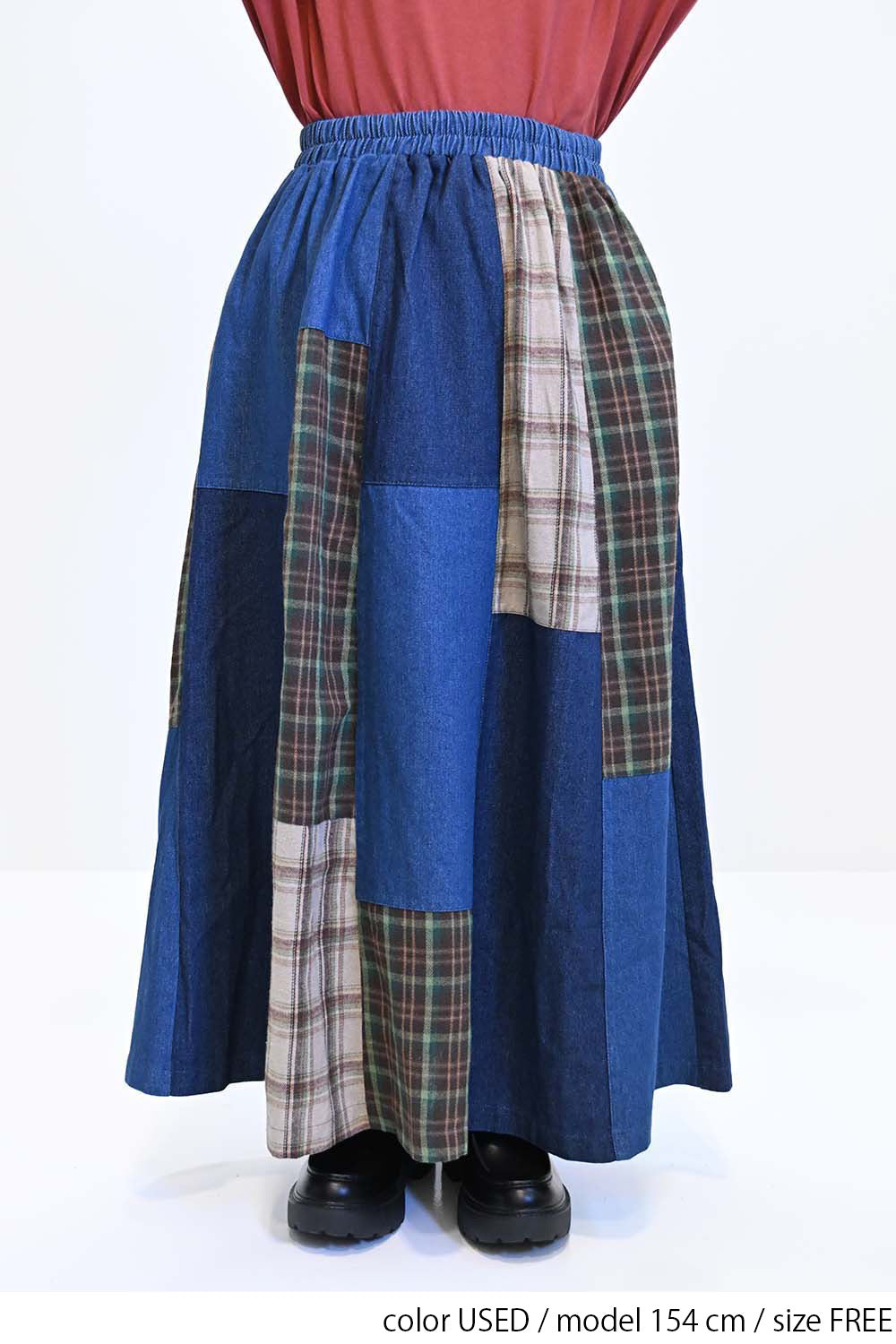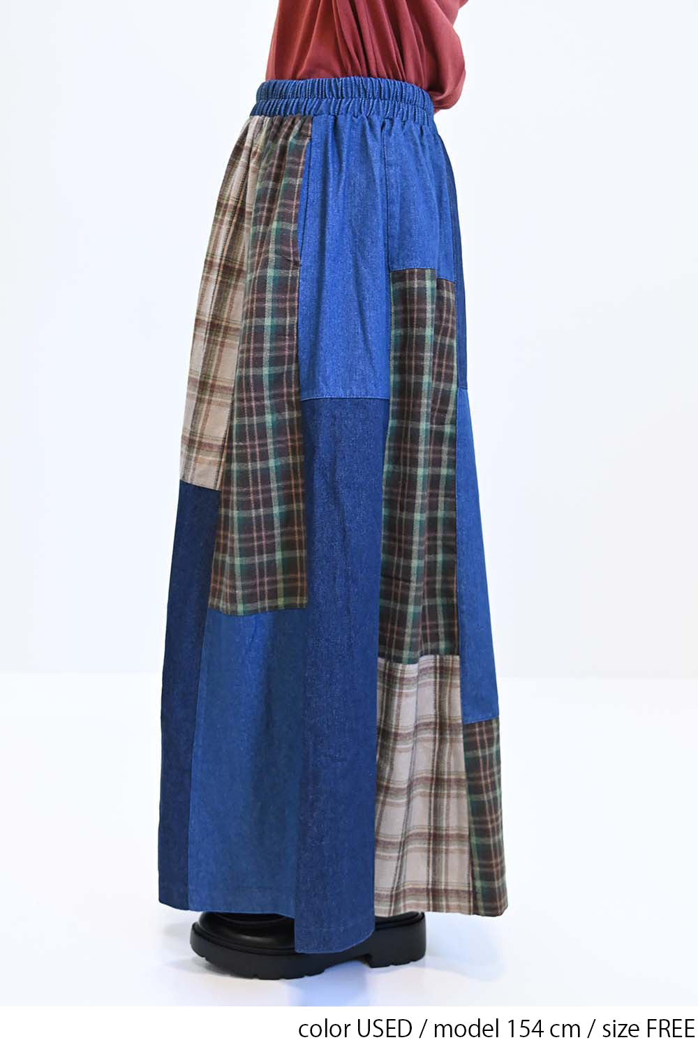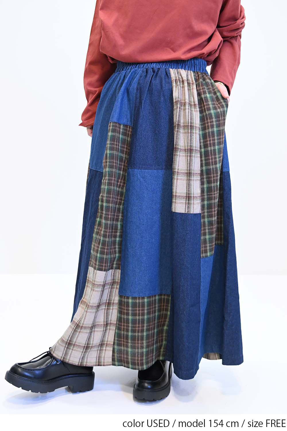2色のデニムと2色のチェック生地を合わせた、パッチワーク風のスカート。