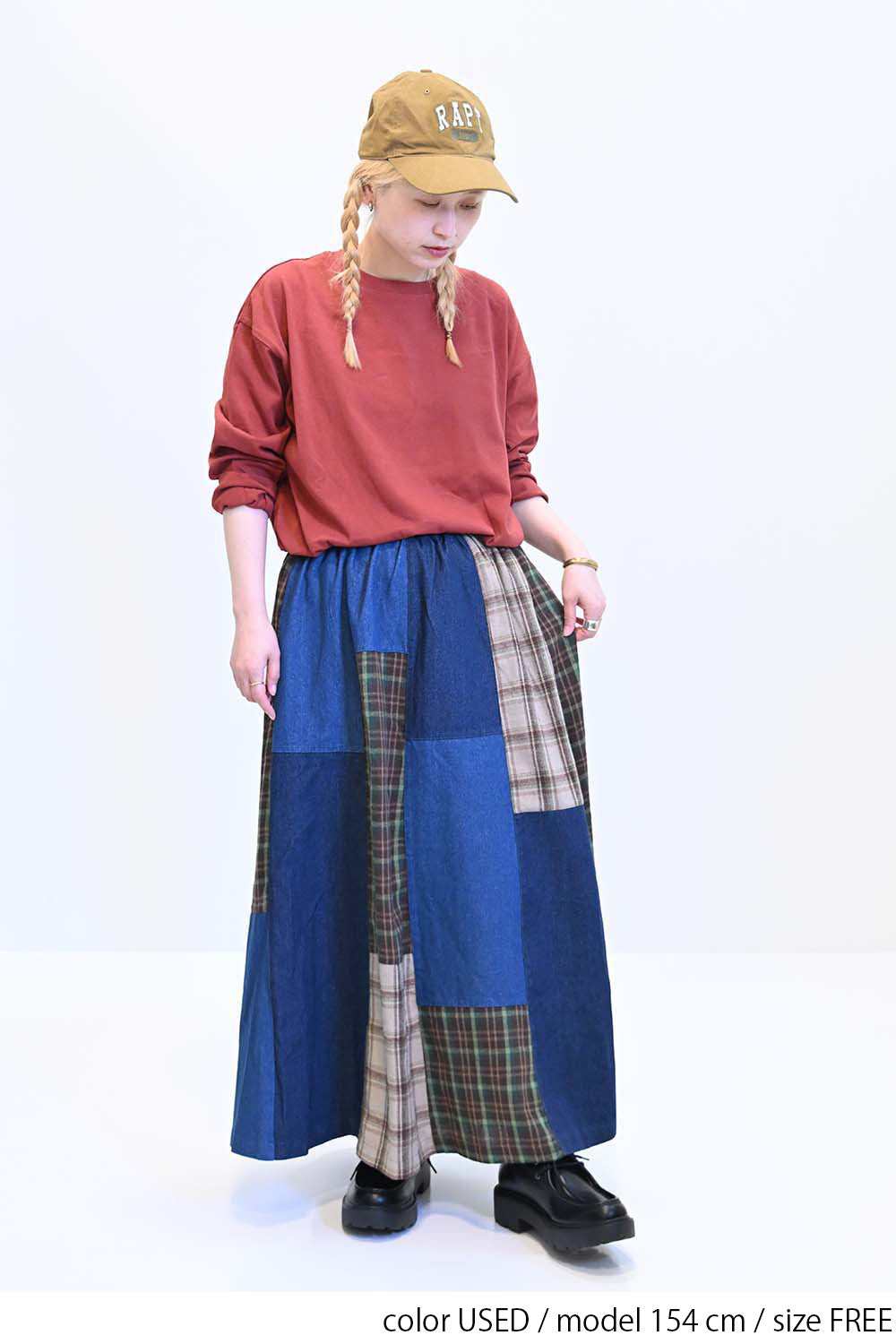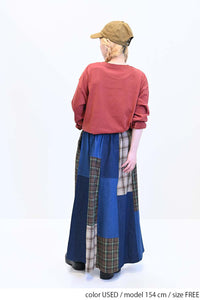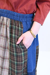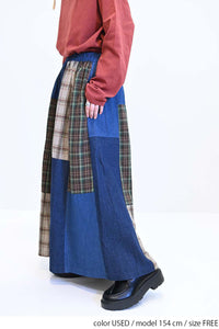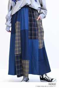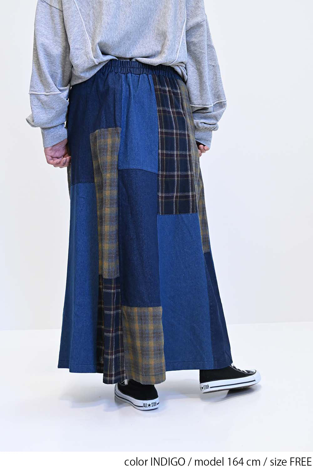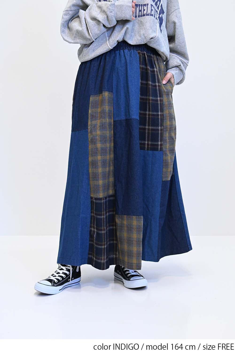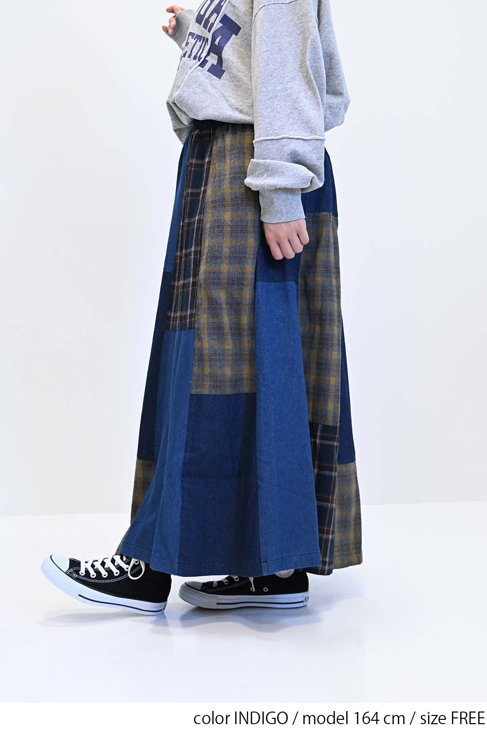 2色のデニムと2色のチェック生地を合わせた、パッチワーク風のスカート。