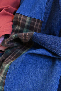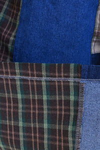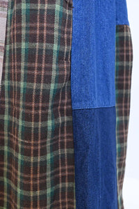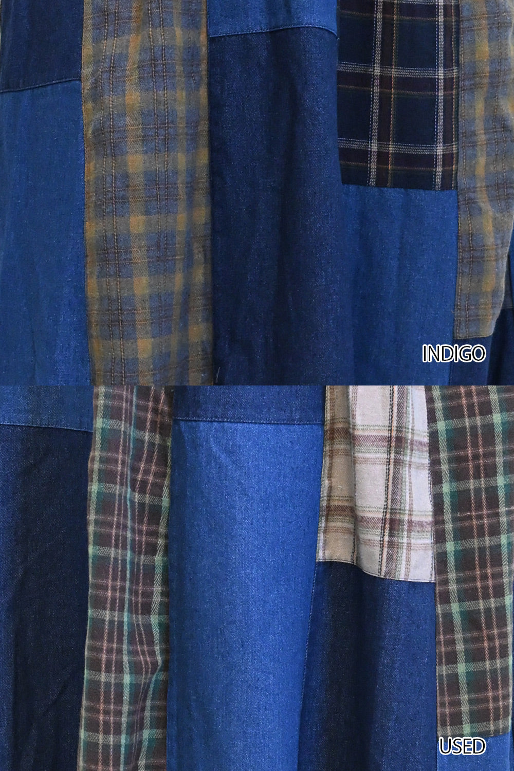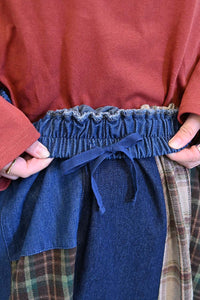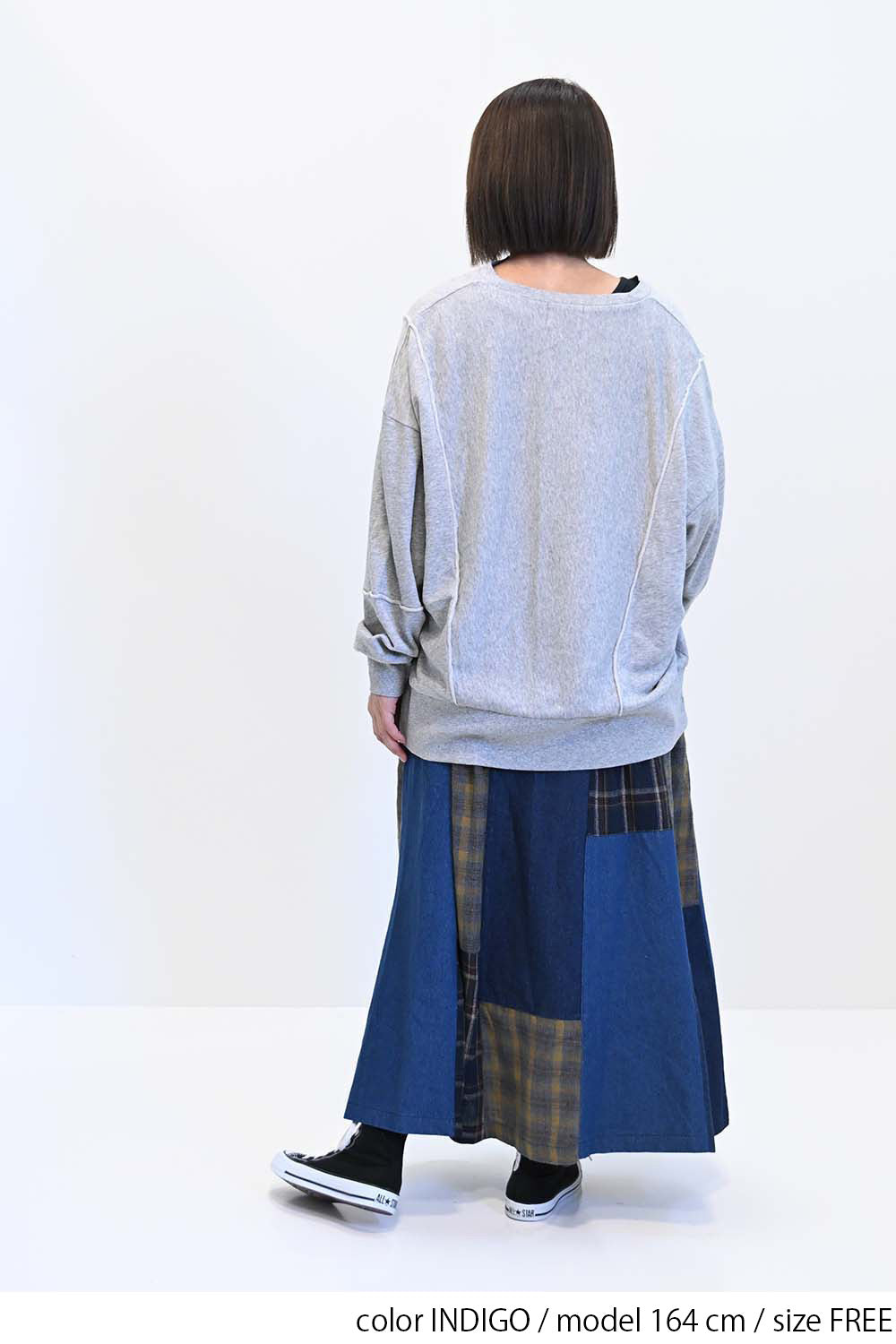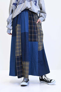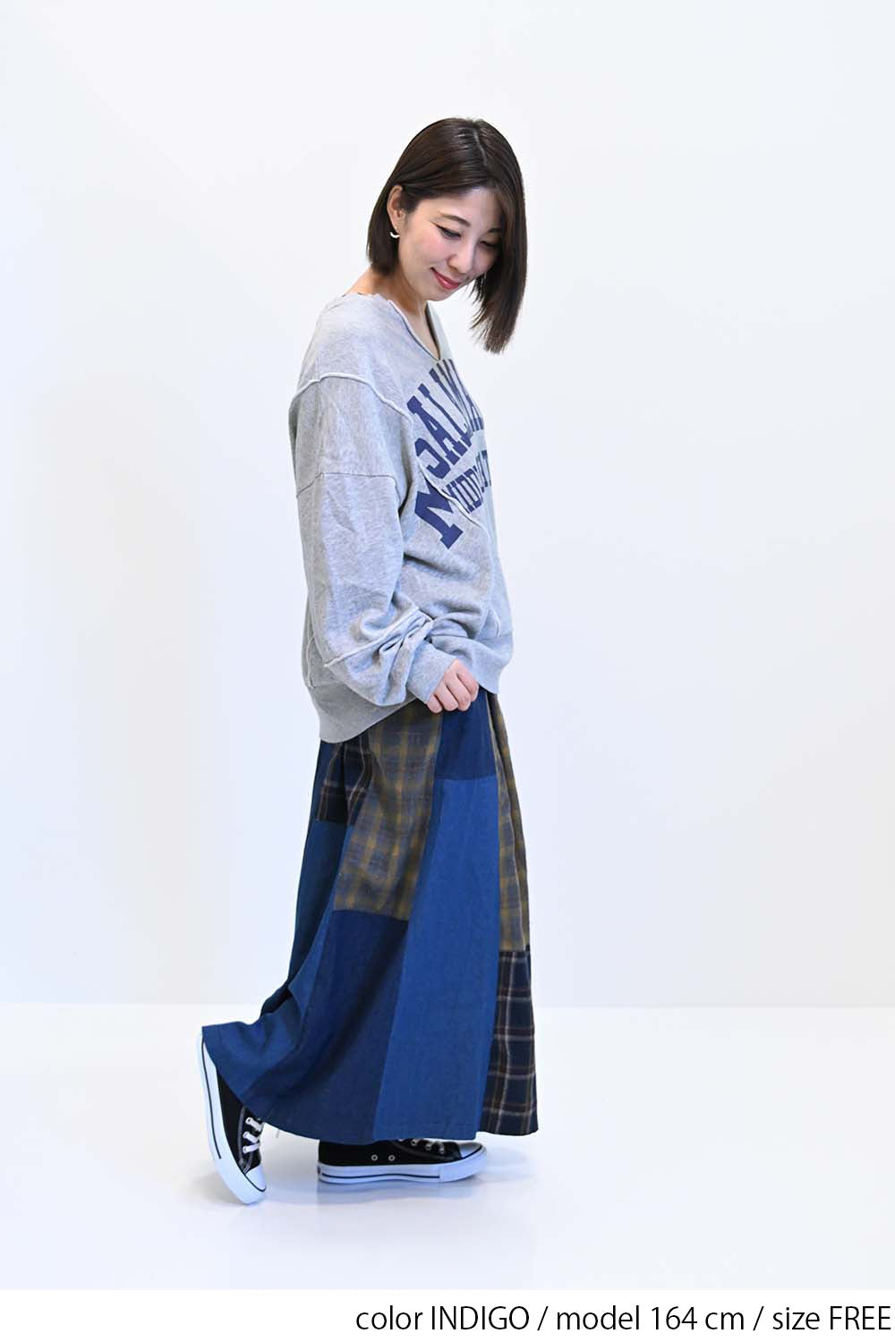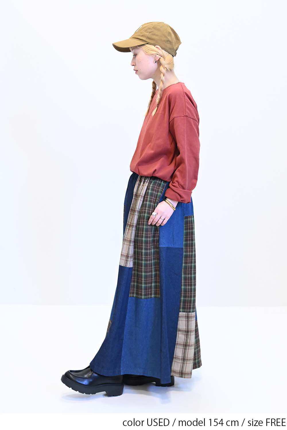 2色のデニムと2色のチェック生地を合わせた、パッチワーク風のスカート。
