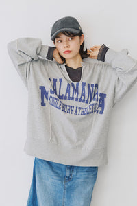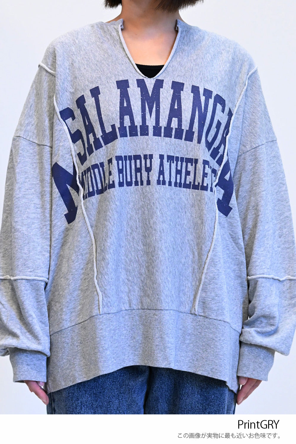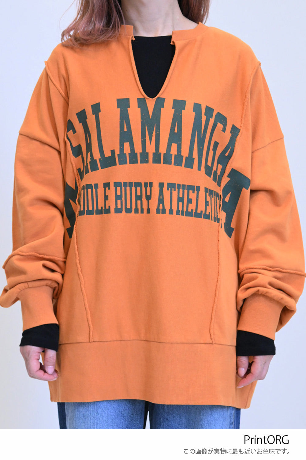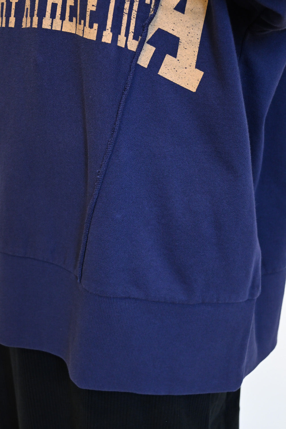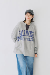 切りっぱなしのパッチワークデザインがアクセントになったロゴスウェット。