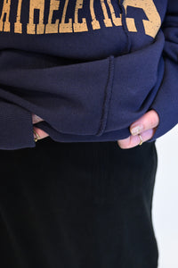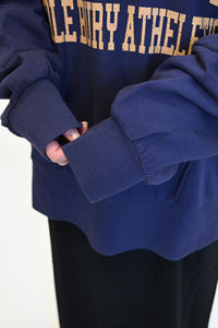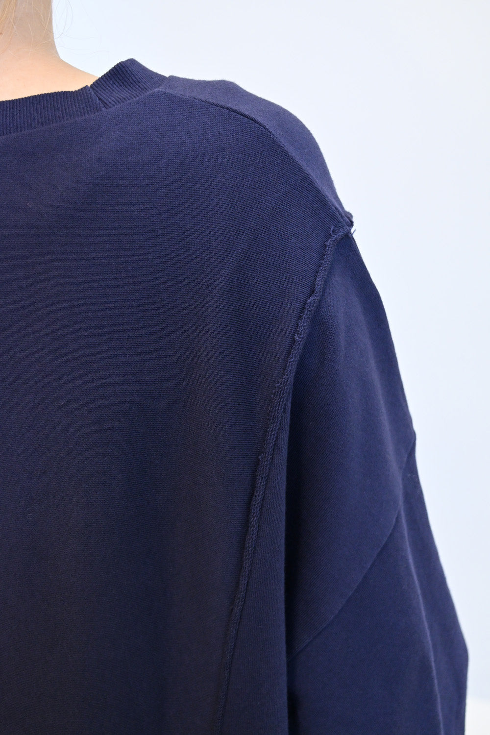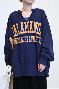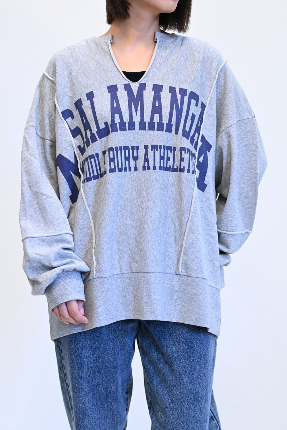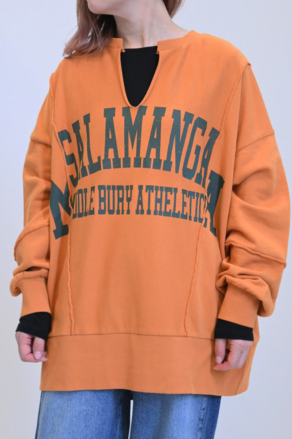 切りっぱなしのパッチワークデザインがアクセントになったロゴスウェット。