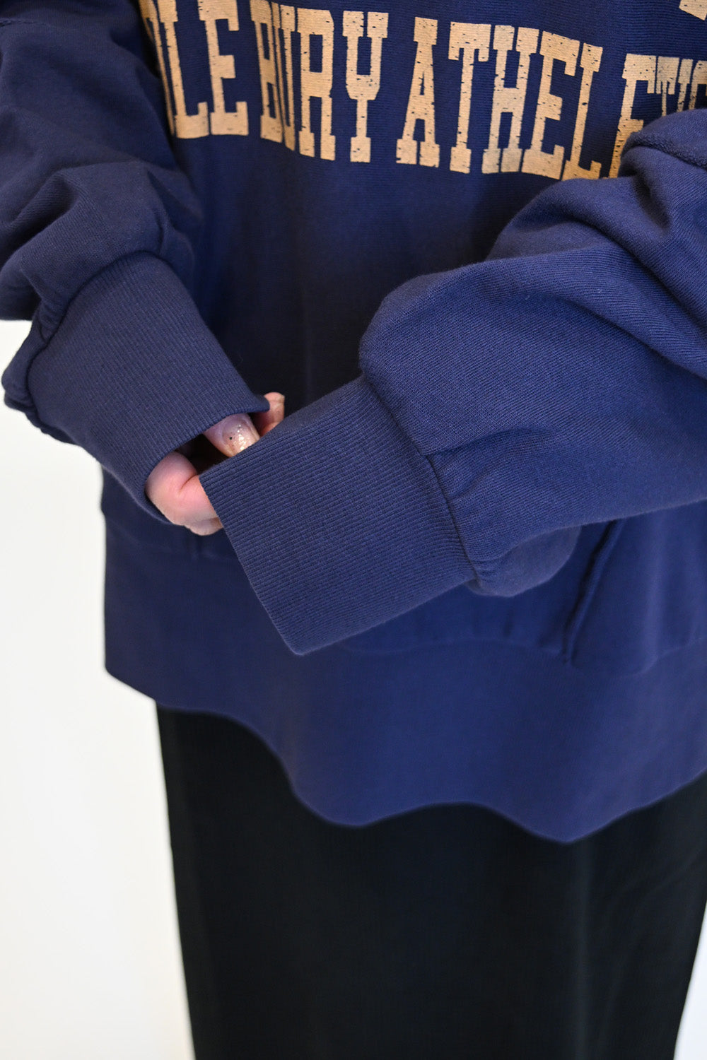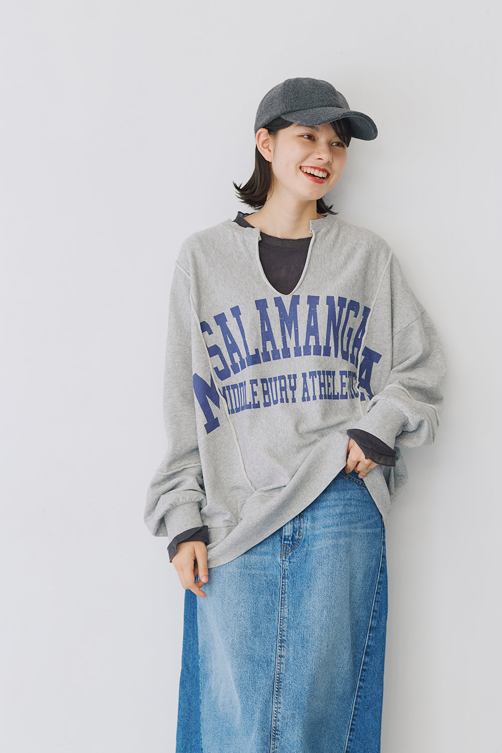 フレアスカートやプリーツスカートに合わせると、ロゴスウェットのボーリューム感がアクセントになり、カジュアル×フェミニンの絶妙なバランスが完成。