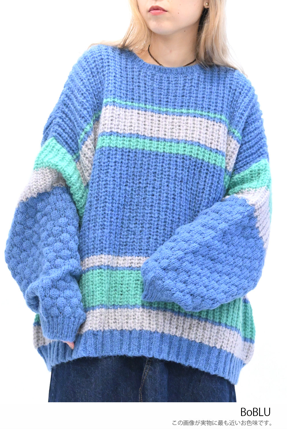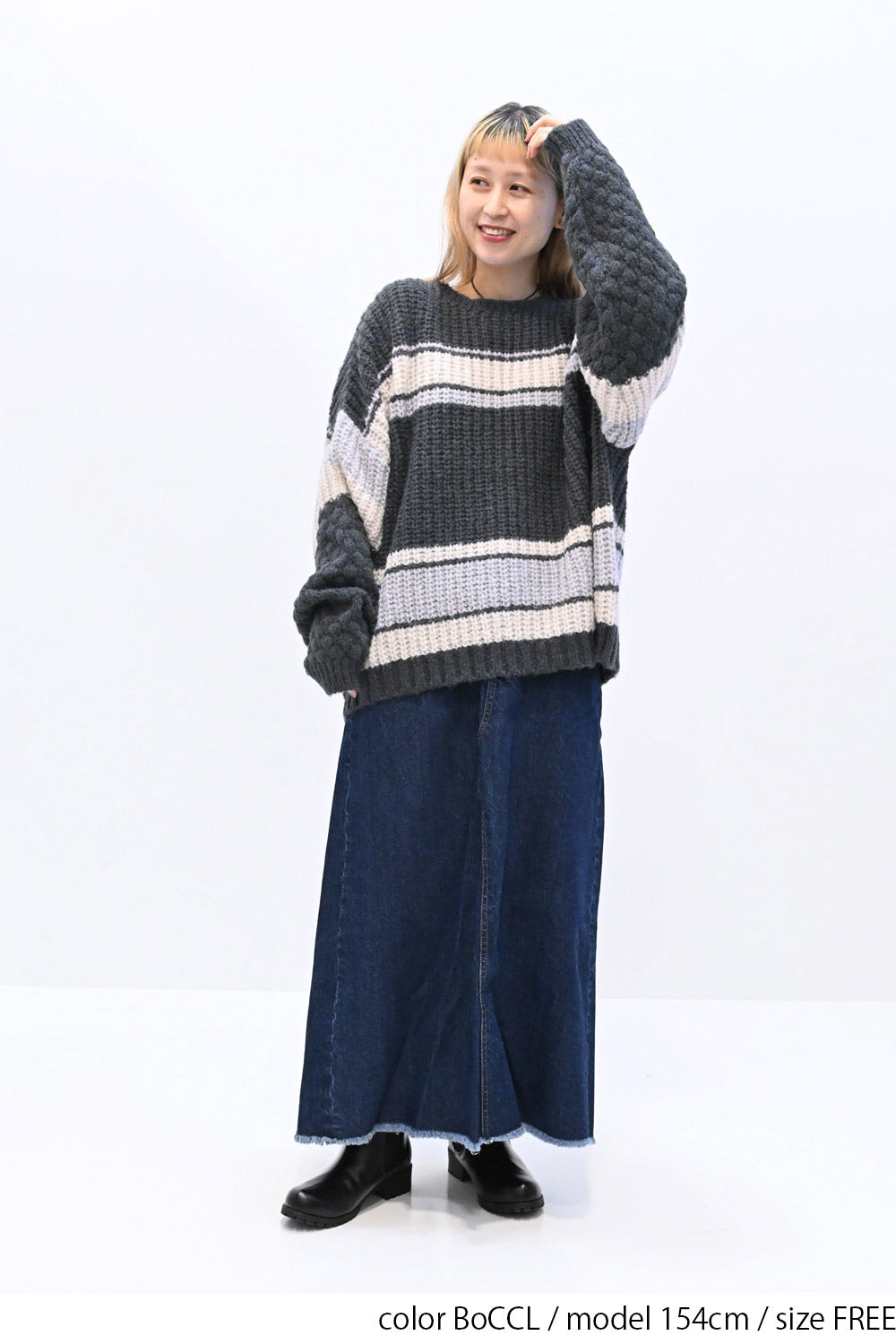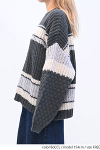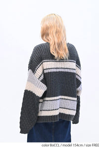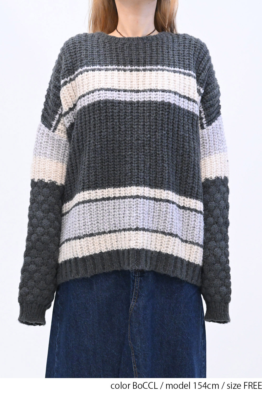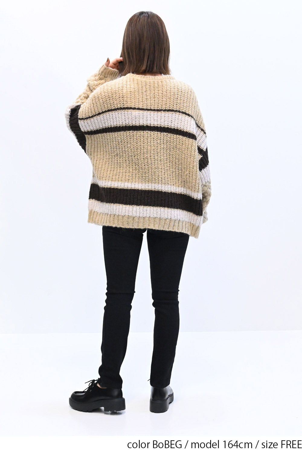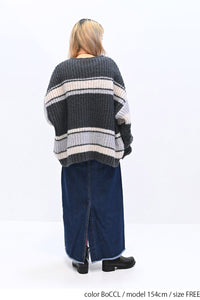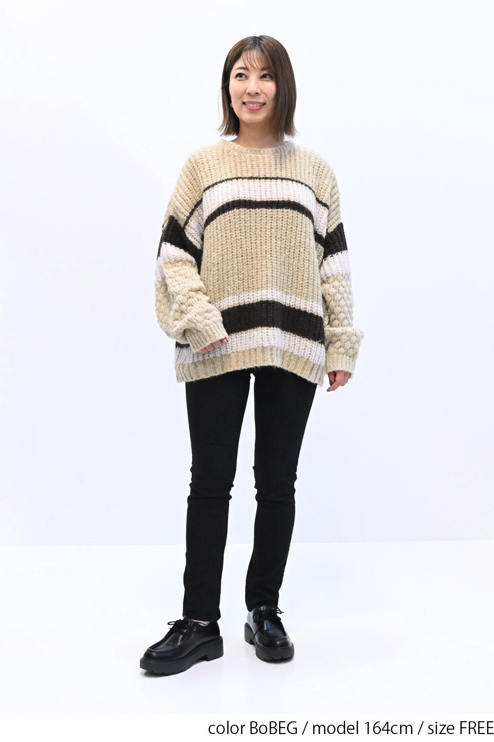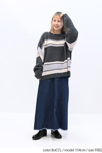 大柄マルチボーダーが目を引く、ざっくり編みのニットプルオーバー。