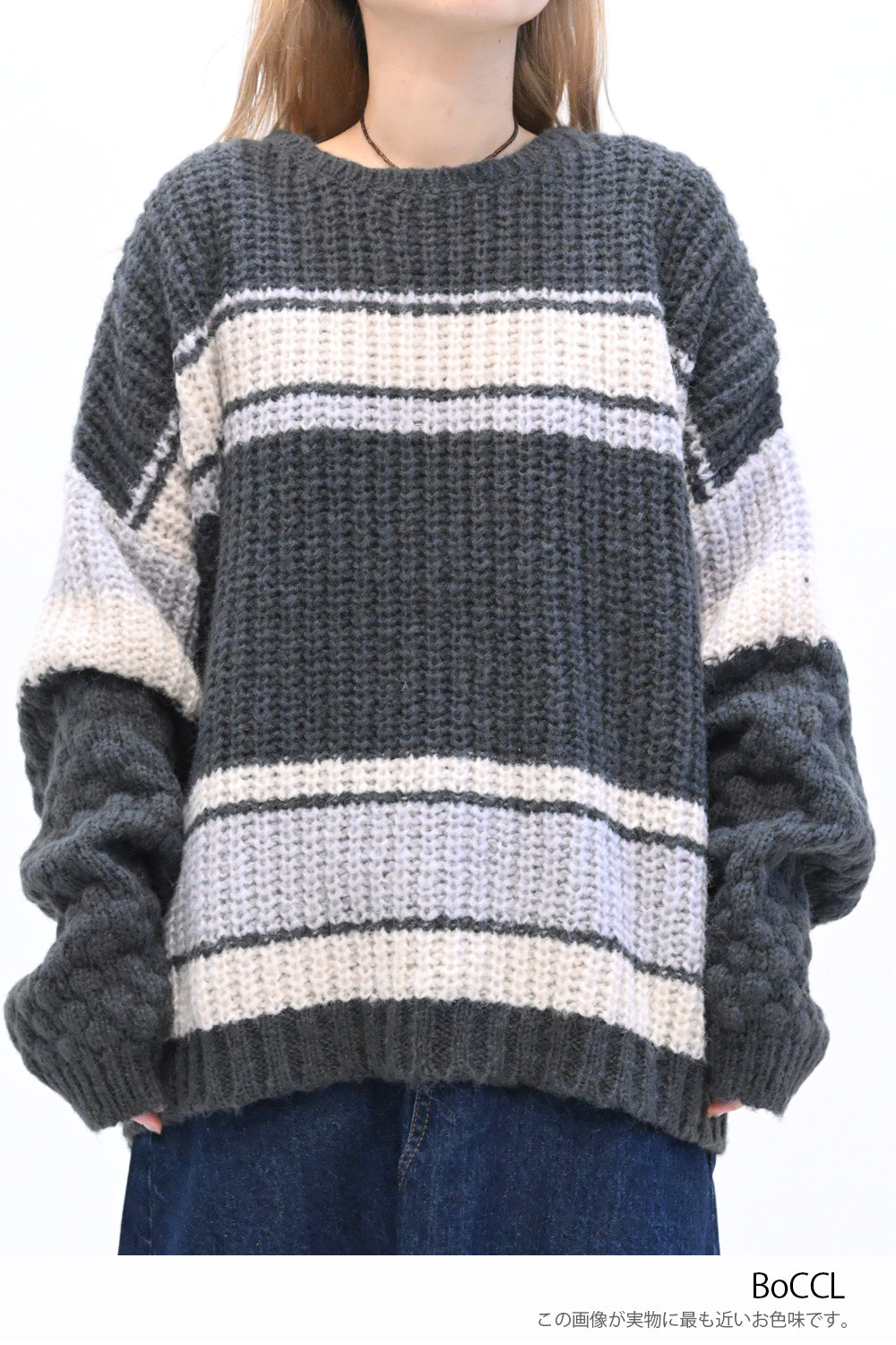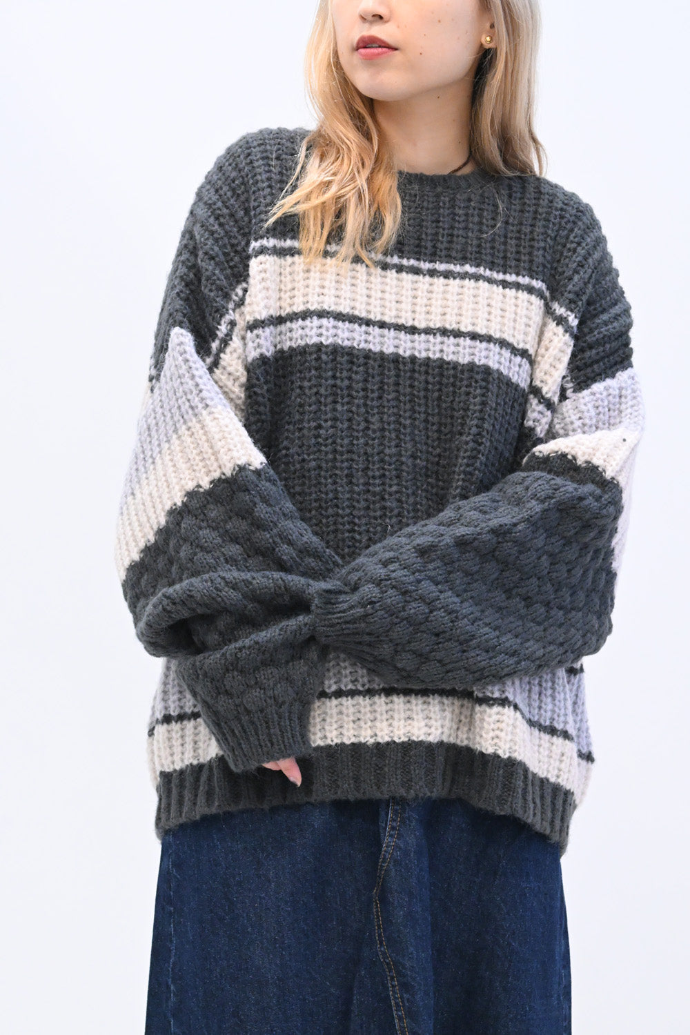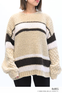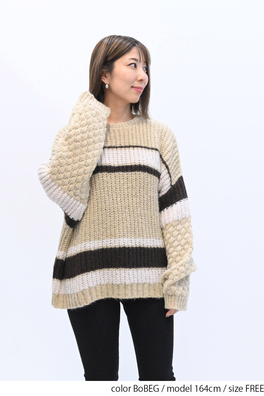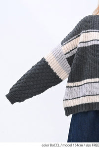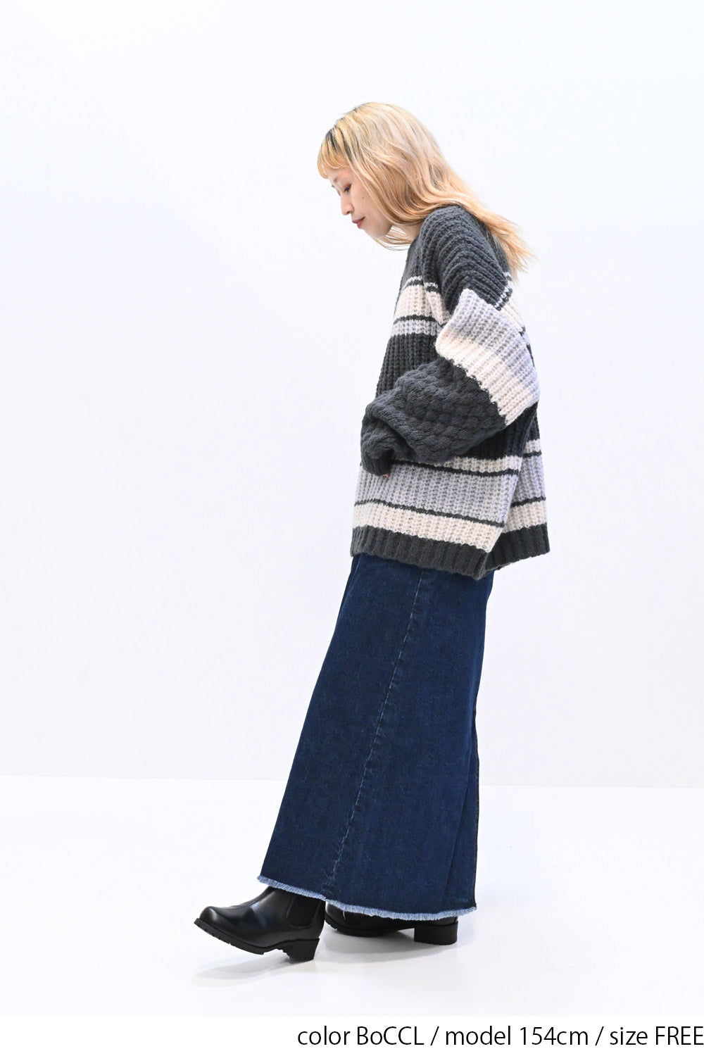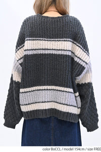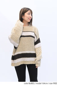 大柄マルチボーダーが目を引く、ざっくり編みのニットプルオーバー。