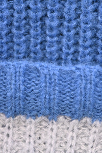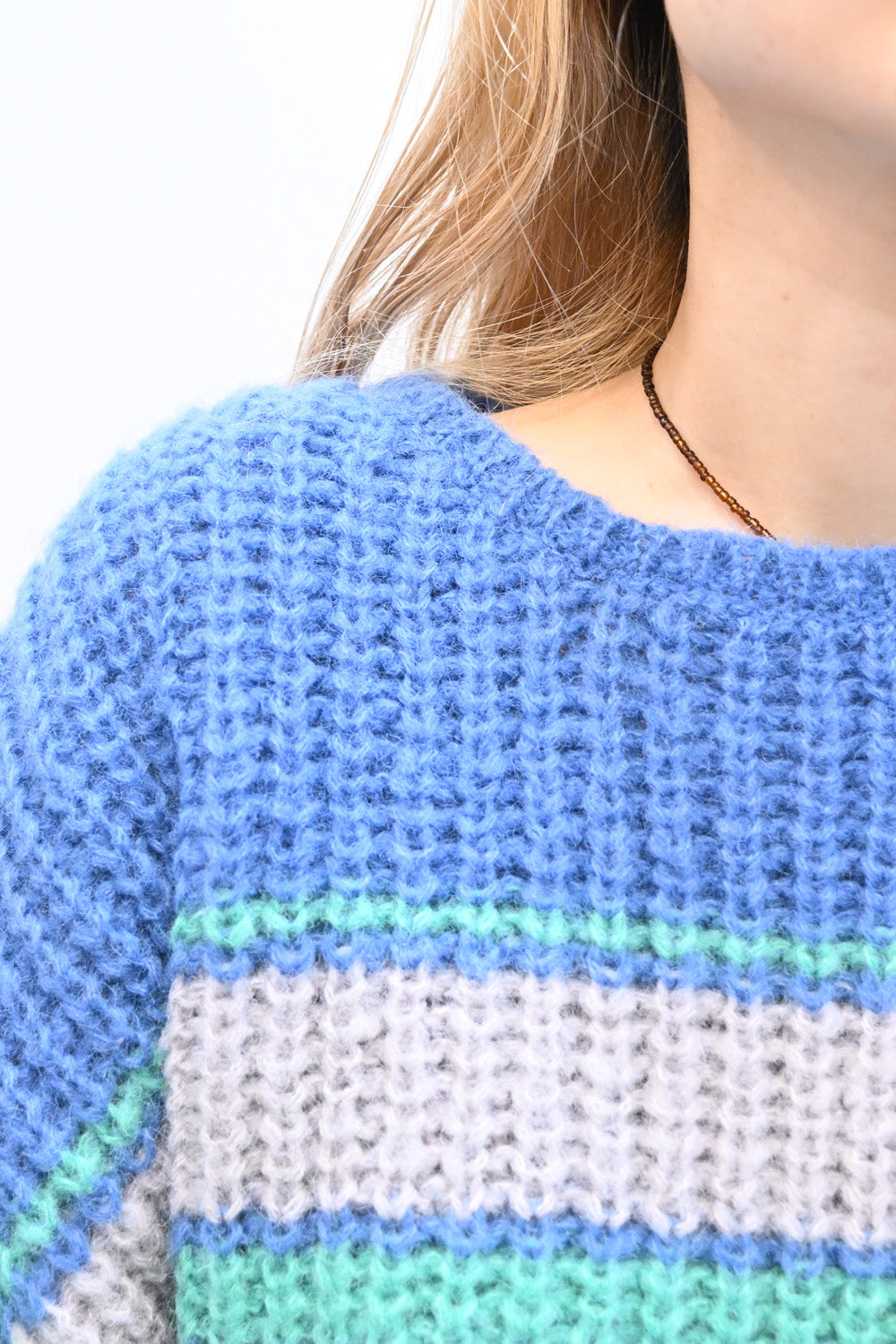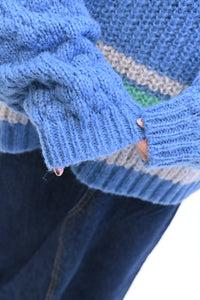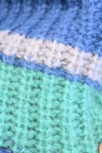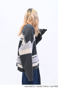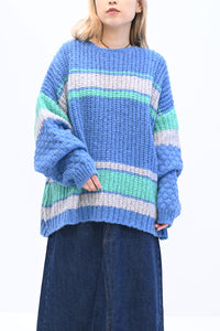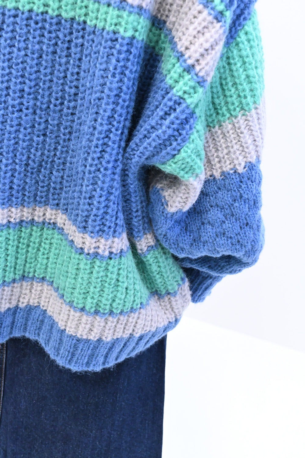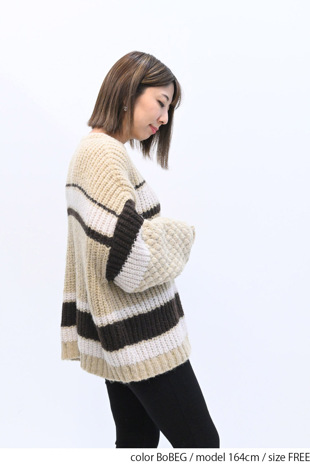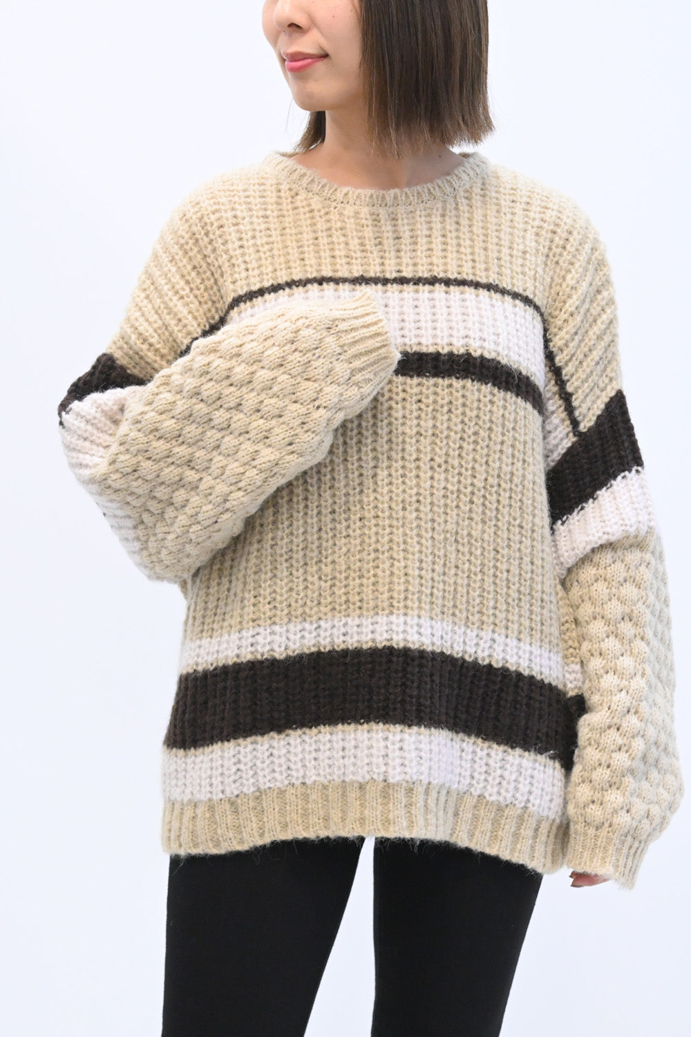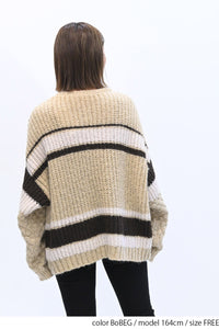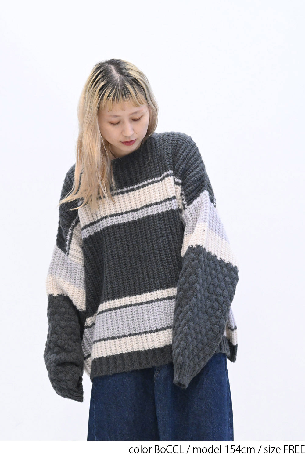 大柄マルチボーダーが目を引く、ざっくり編みのニットプルオーバー。