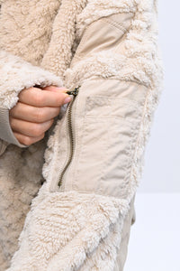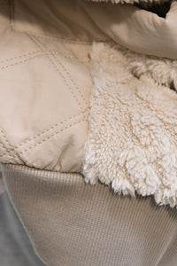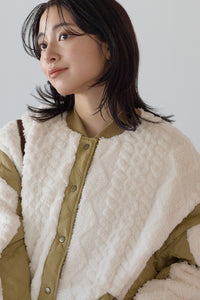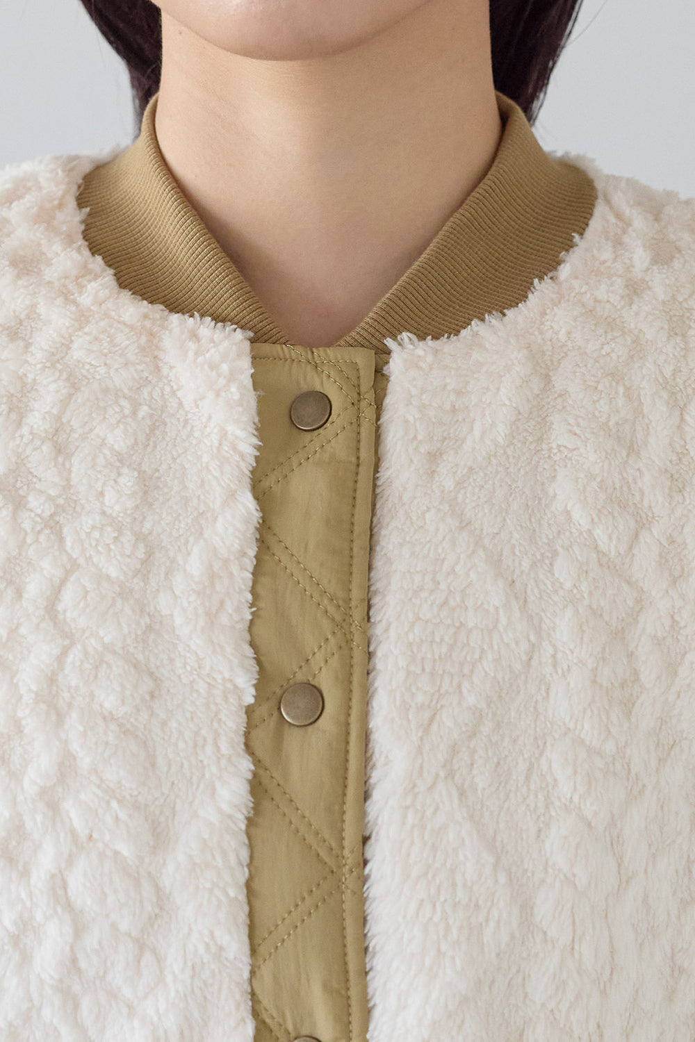 表地はふんわりとしたボア素材と、中わた入りのキルティング素材をドッキング。
