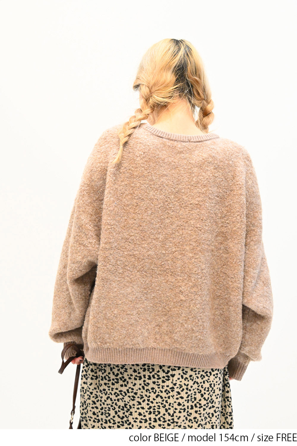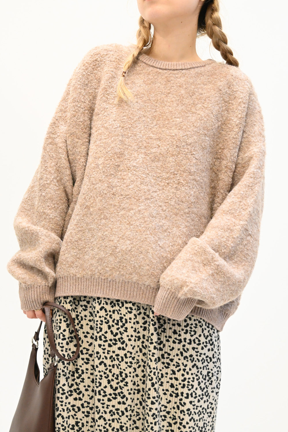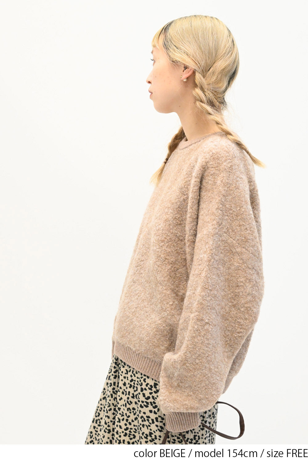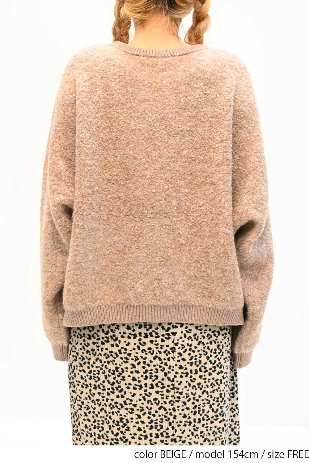 ふっくらとしたブークレ糸で編み立てた素材は、見た目にもあたたかく、柔らかな風合いが特徴です。