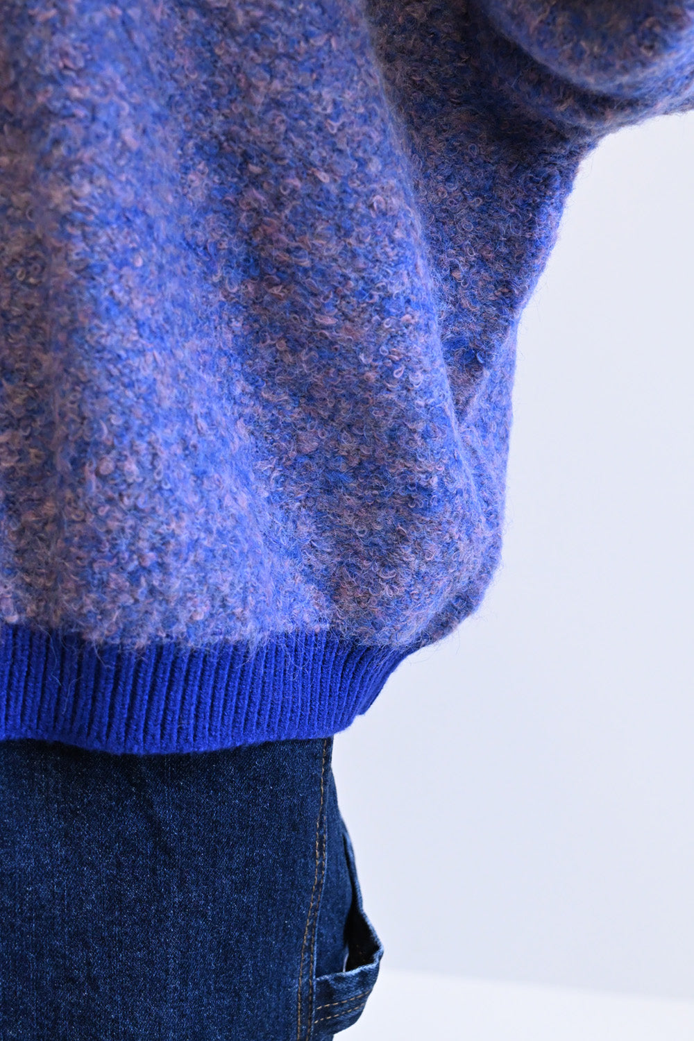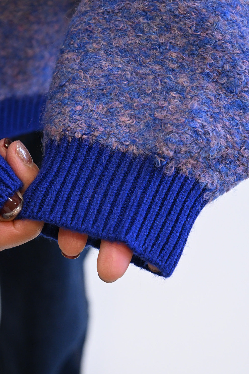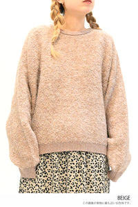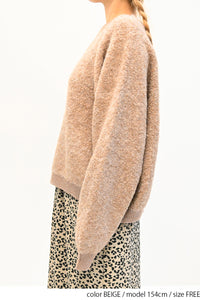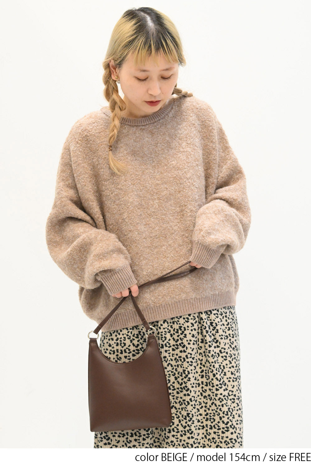 ふっくらとしたブークレ糸で編み立てた素材は、見た目にもあたたかく、柔らかな風合いが特徴です。