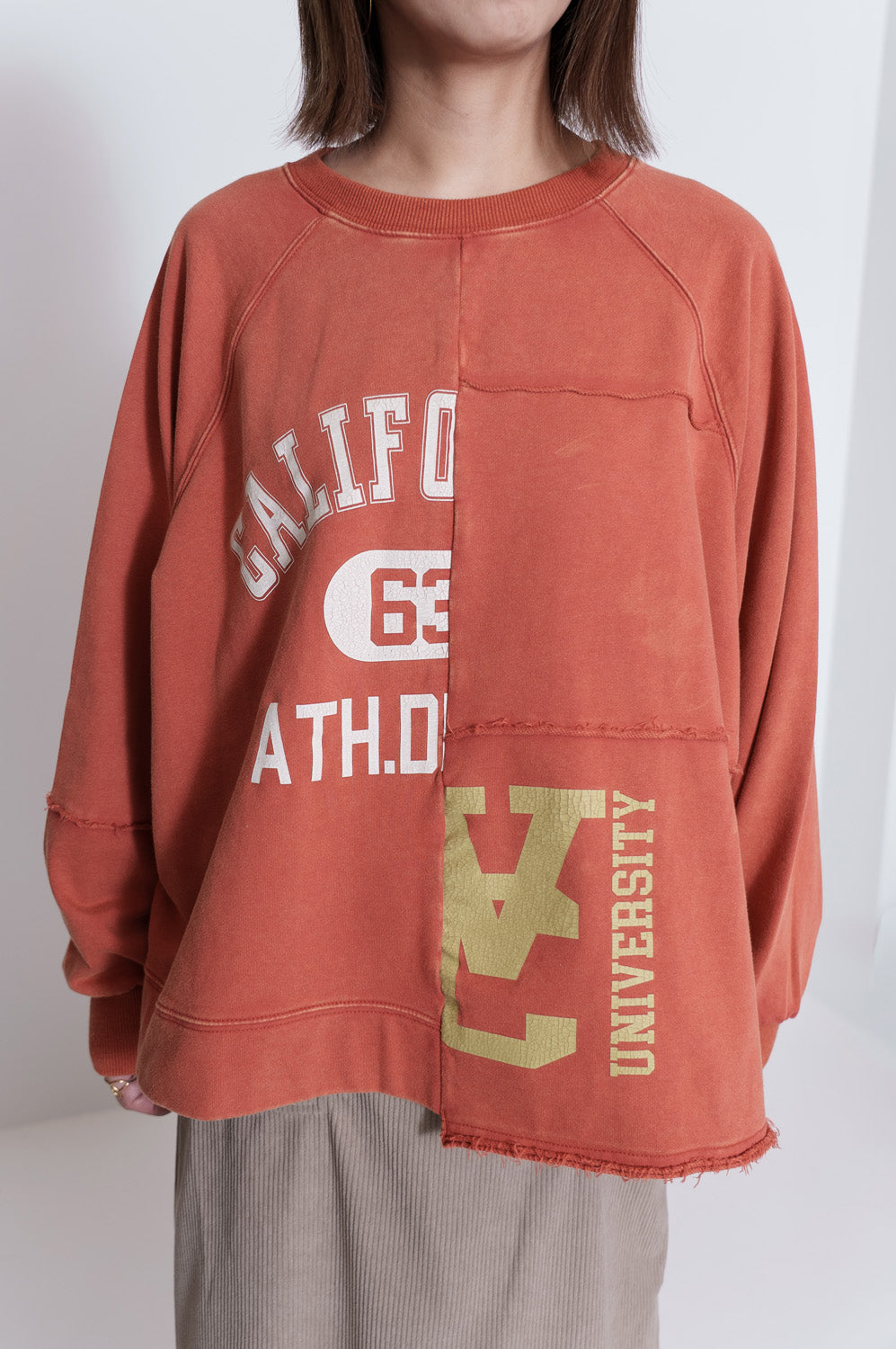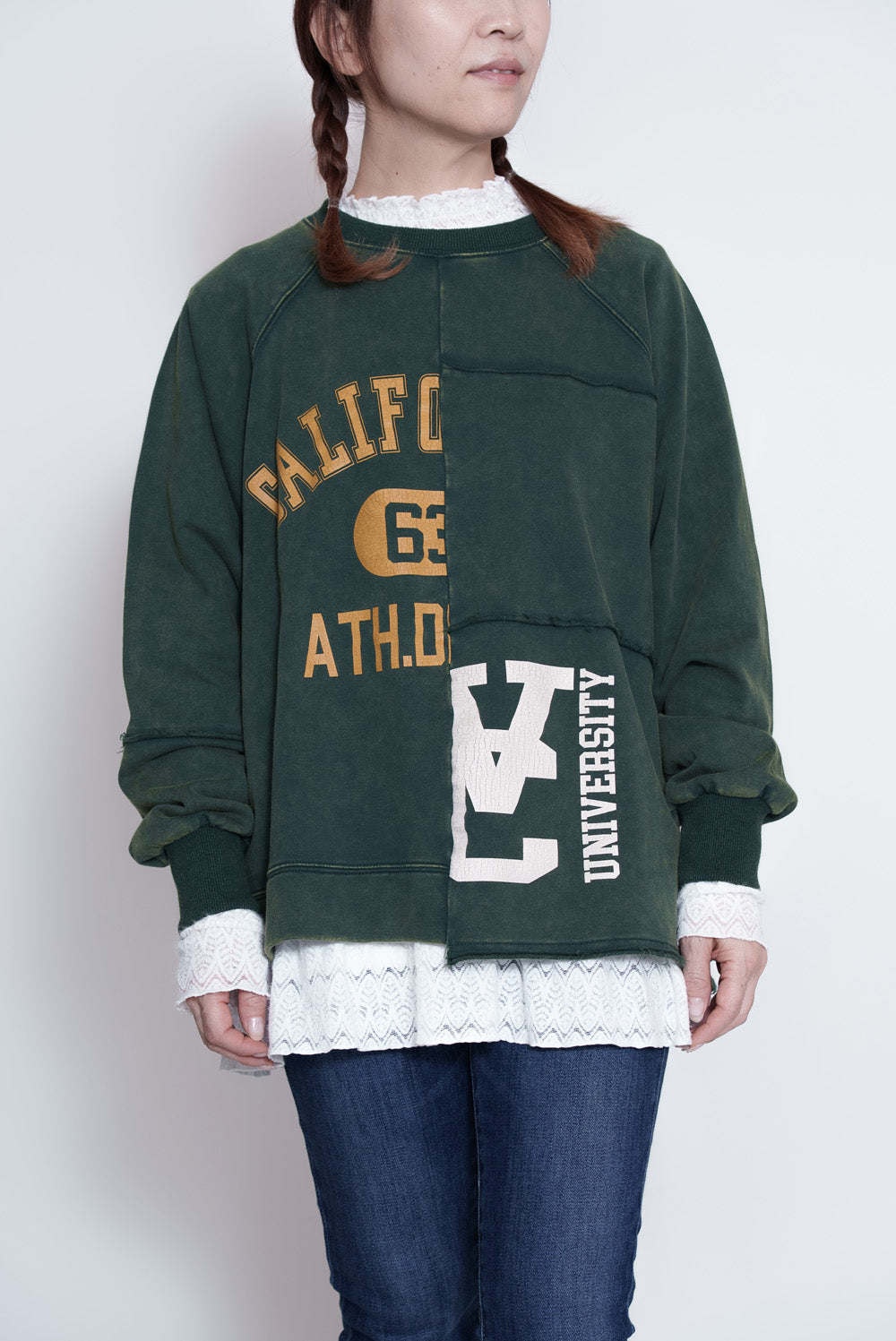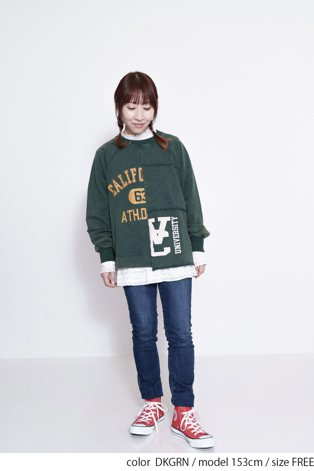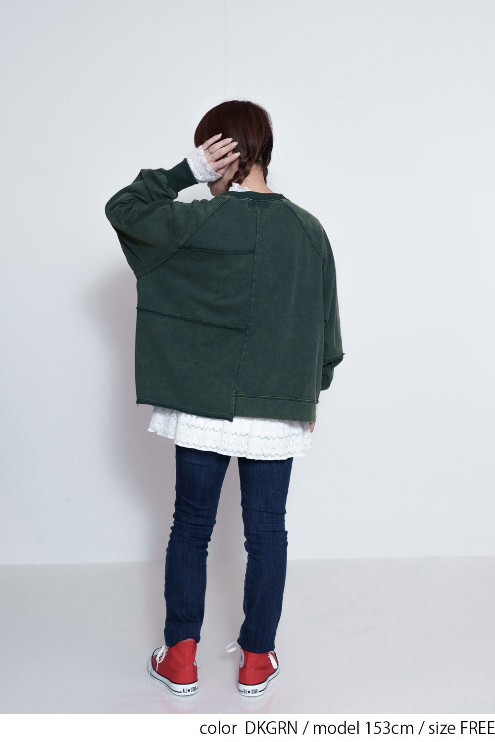 裏面を活かしたようなパッチワーク風の切替デザインが印象的で、1枚でスタイリングが決まる存在感のあるアイテム。